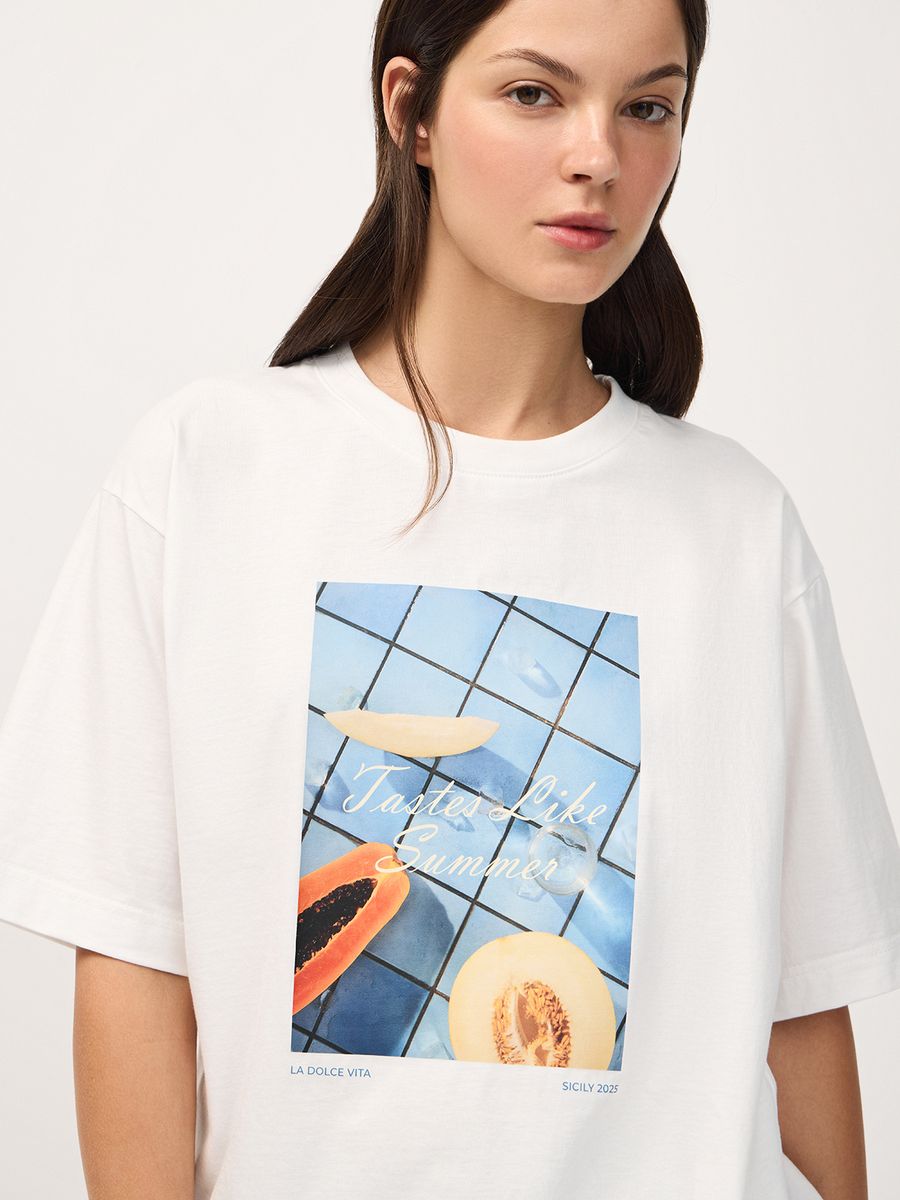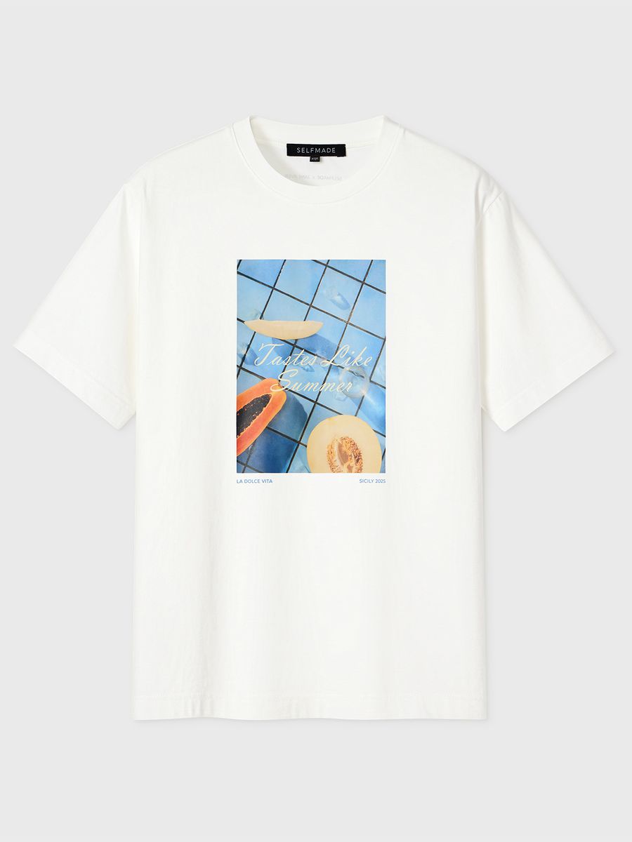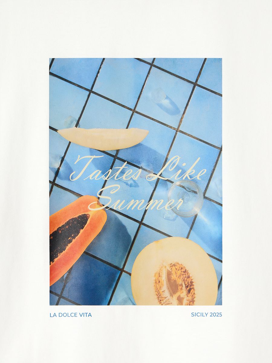 Принт «Tastes Like Summer» — про вкус отпускных дней, когда время теряет счет, а главная задача — наслаждаться теплым солнцем, сочными фруктами и прохладой воды у бассейна. Футболка как универсальная база для отпускных воспоминаний и планов для новых путешествий.