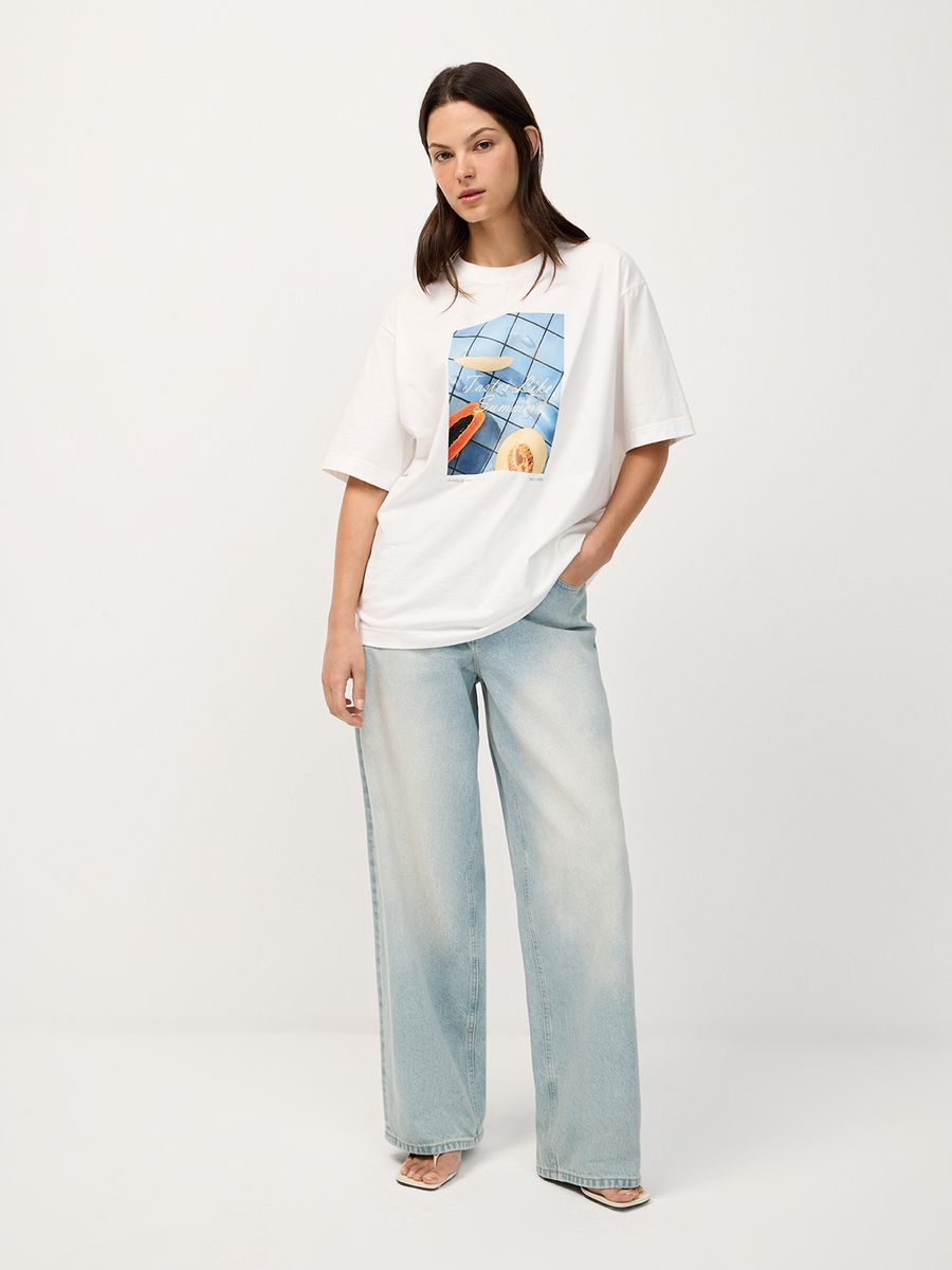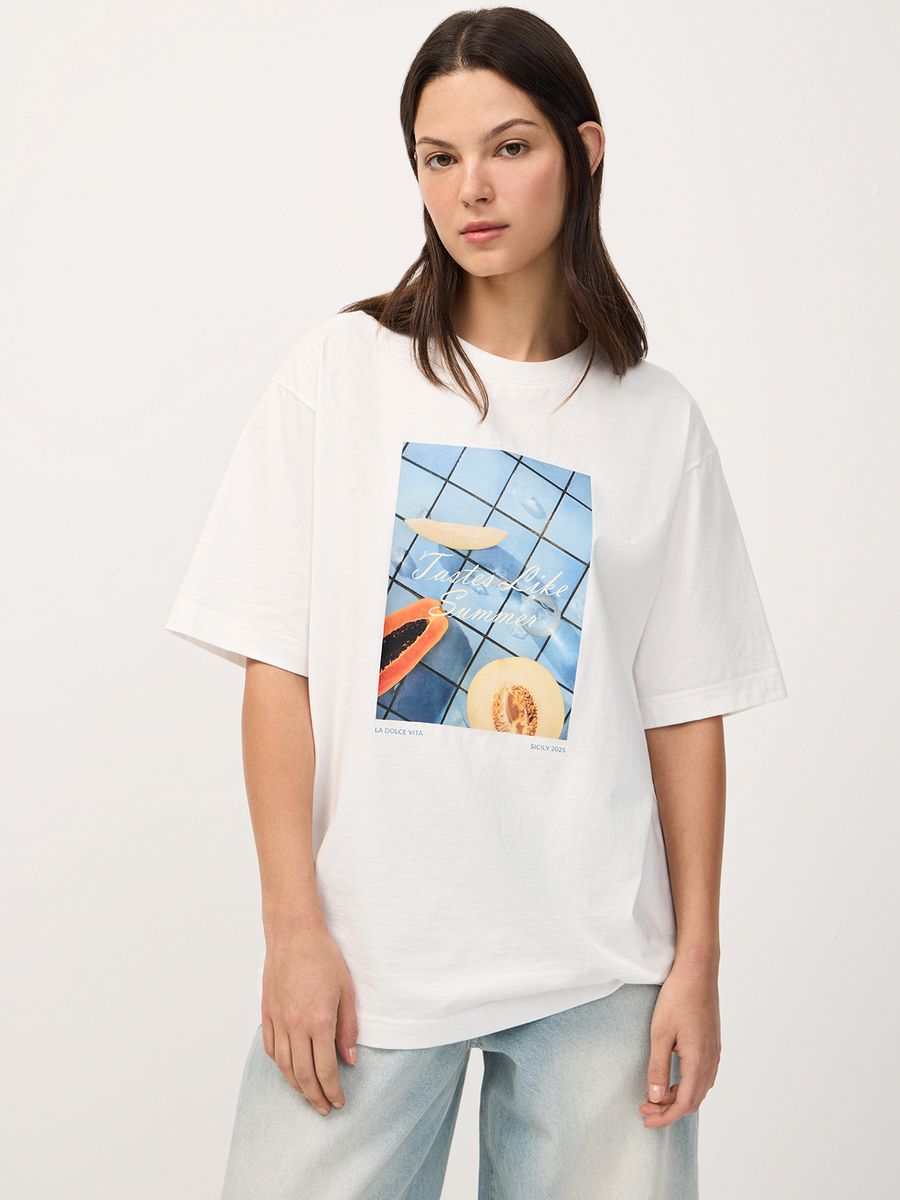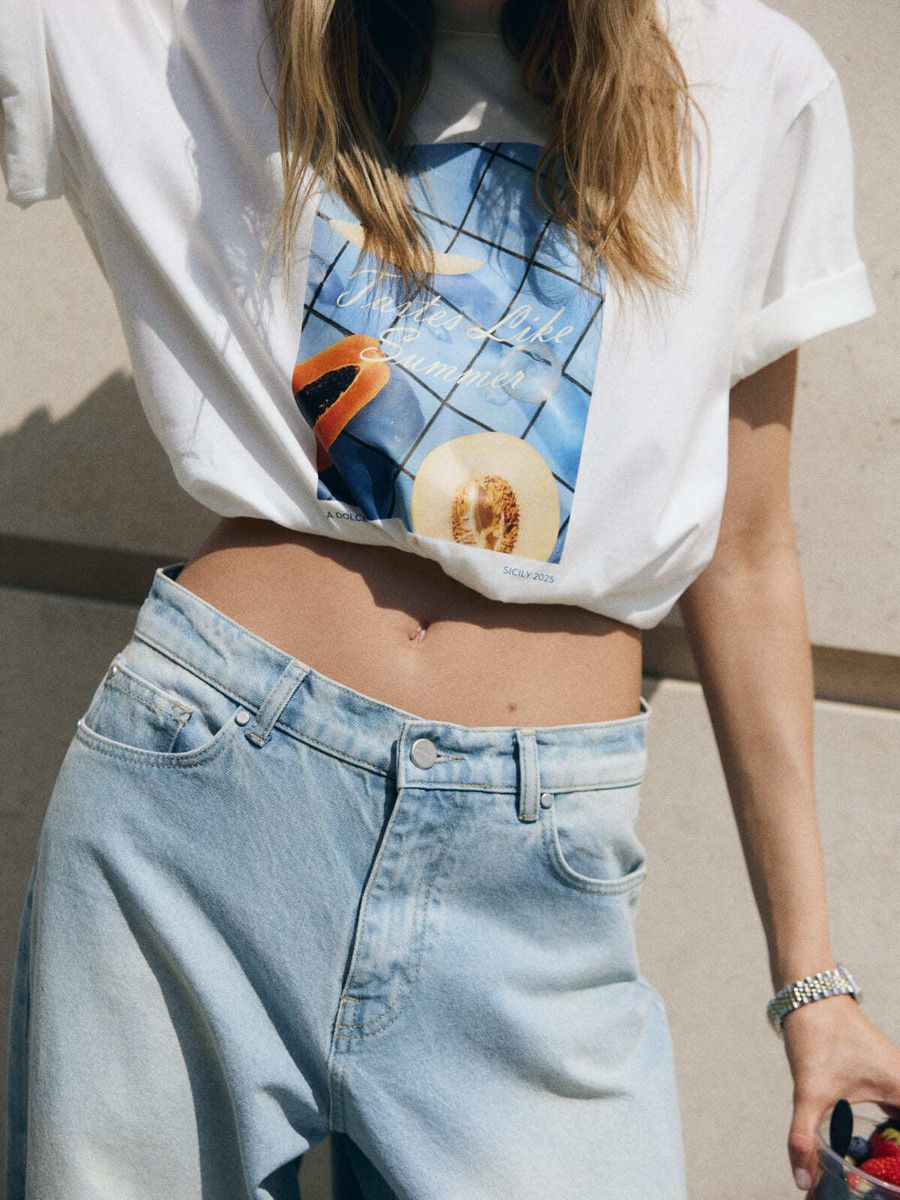 Принт «Tastes Like Summer» — про вкус отпускных дней, когда время теряет счет, а главная задача — наслаждаться теплым солнцем, сочными фруктами и прохладой воды у бассейна. Футболка как универсальная база для отпускных воспоминаний и планов для новых путешествий.