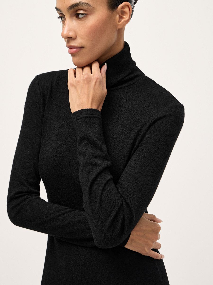 Облегающее платье-водолазка Rich Black — идеальная женственная модель для осеннего сезона. Высокий воротник и длинные рукава обеспечивают комфорт в холодную погоду, а также придают образу собранный и утонченный характер. Фактурный трикотаж мягко прилегает к коже, подчеркивая изящные изгибы фигуры. Наслаждаемся роскошью минималистичного стиля и делаем ставку на вечную актуальность черного цвета, сочетая айтем со statement-пальто и ботильонами Walk Of Fame в тон.