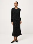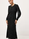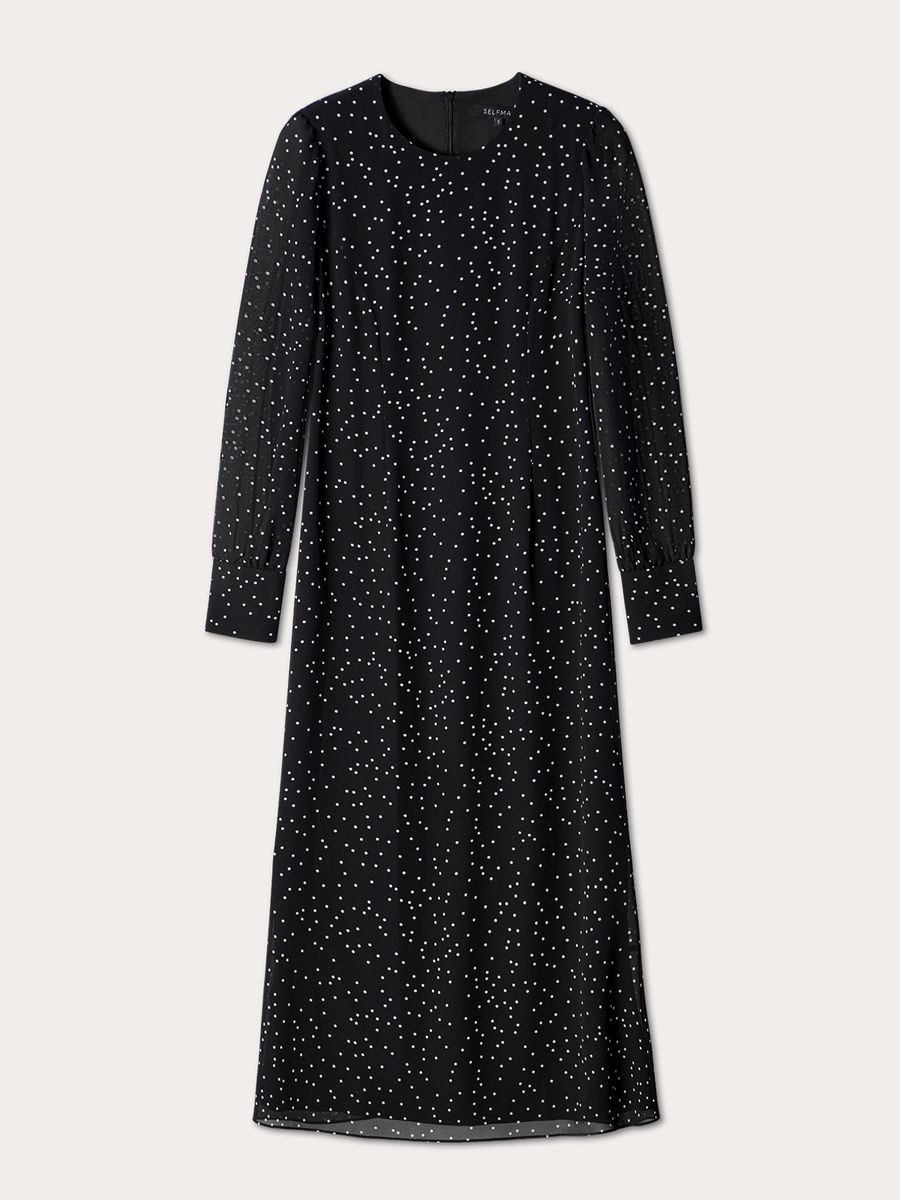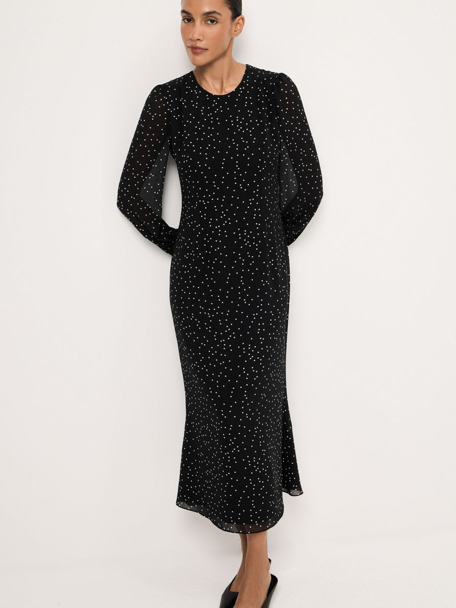 Изысканное платье-миди Polka Dot наполнит каждый выход поэтичностью и женственной чувственностью. Деликатный принт в горошек придает винтажного шарма, а сочетание изящного силуэта и нежной струящейся ткани делает изделие образцом утонченного стиля. Выбираем модель в те моменты, когда хочется подчеркнуть романтичность и элегантность: от похода в театр до камерного ужина в кругу друзей. Завершаем образ statement-пальто Dark Black для эффектного контраста эстетик.