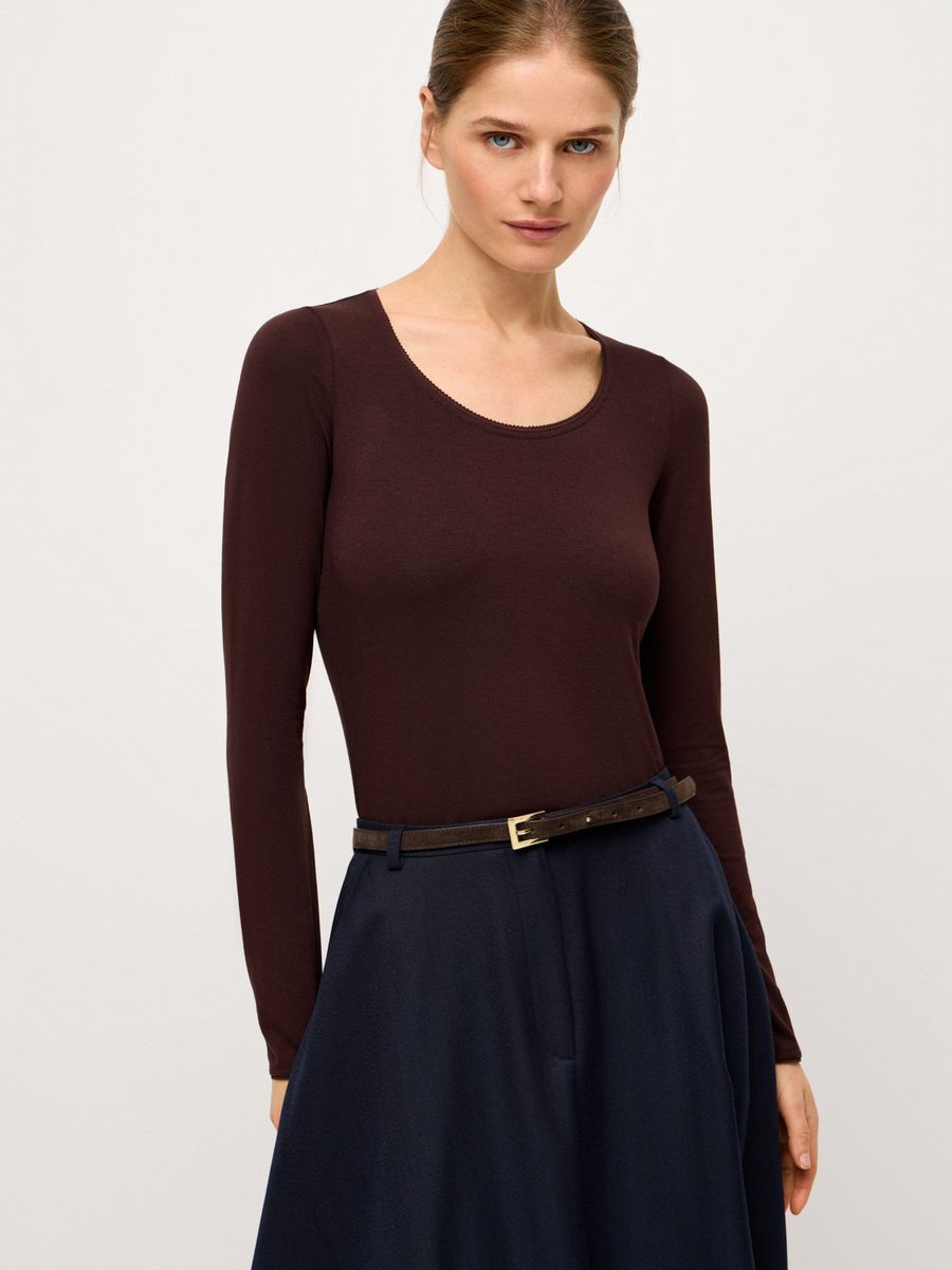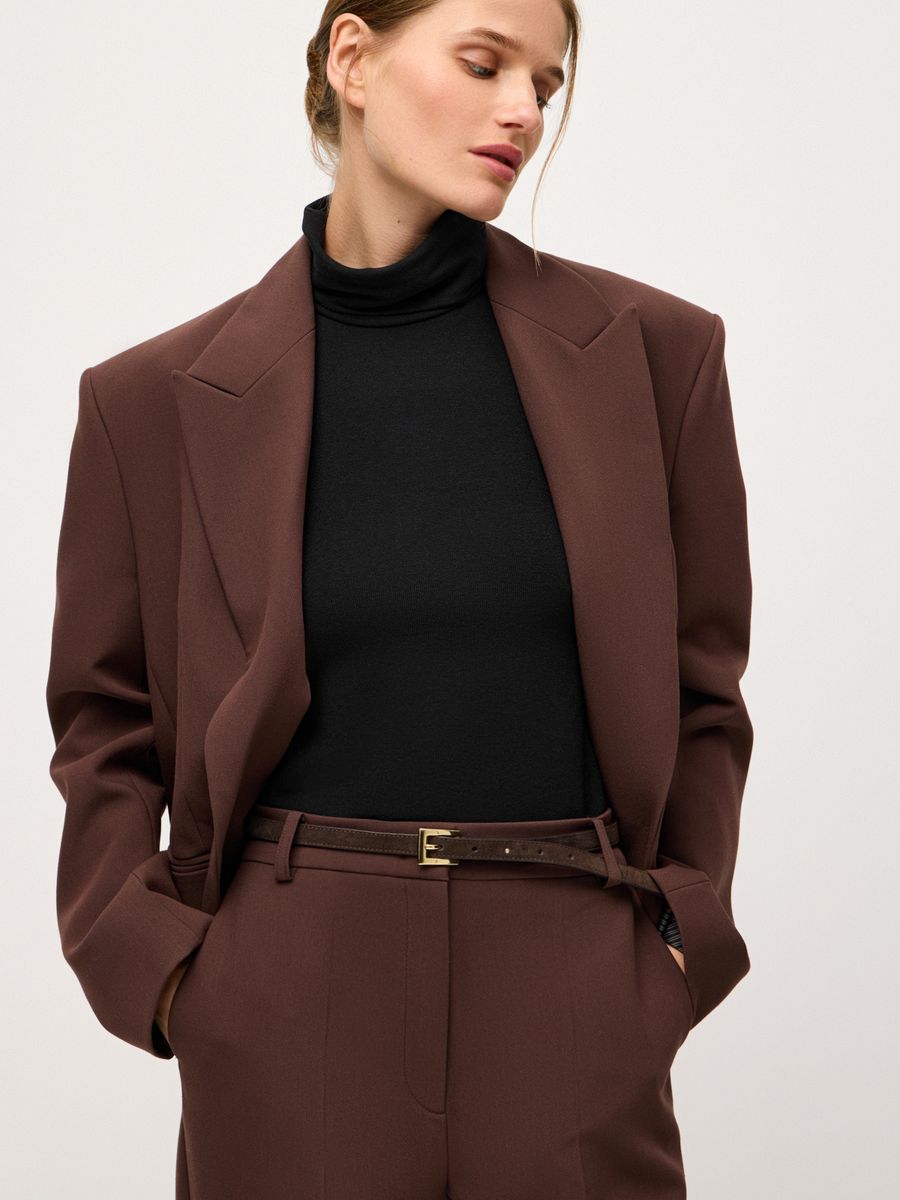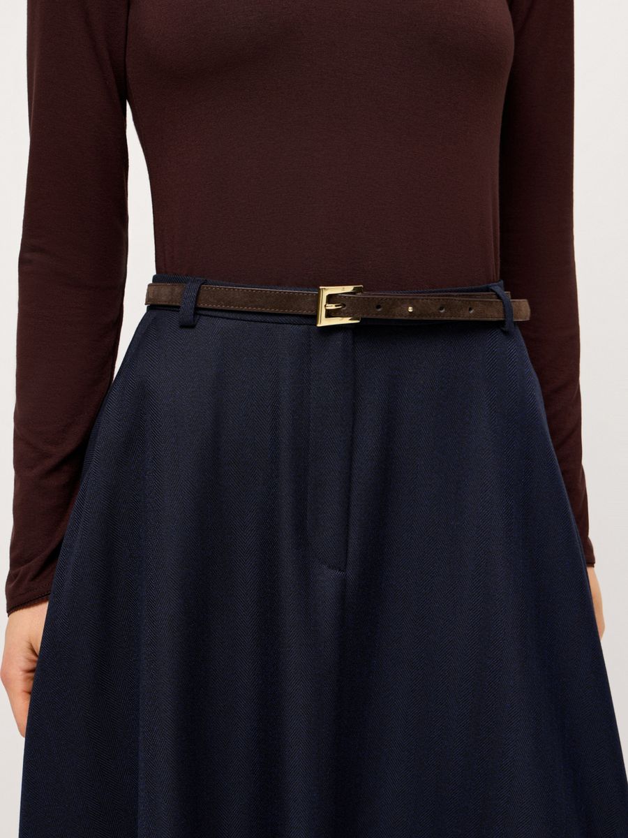 Ремень Sleek в выразительном коричневом цвете — та самая деталь, которая делает образ завершенным и безукоризненным. Модель из натуральной замши с аккуратной золотистой пряжкой станет вашим любимым аксессуаром, который идеально сочетается с любыми брюками, джинсами и юбками. Утонченный айтем создан для тех моментов, когда хочется добавить акцент, не перегружая образ.