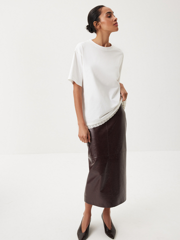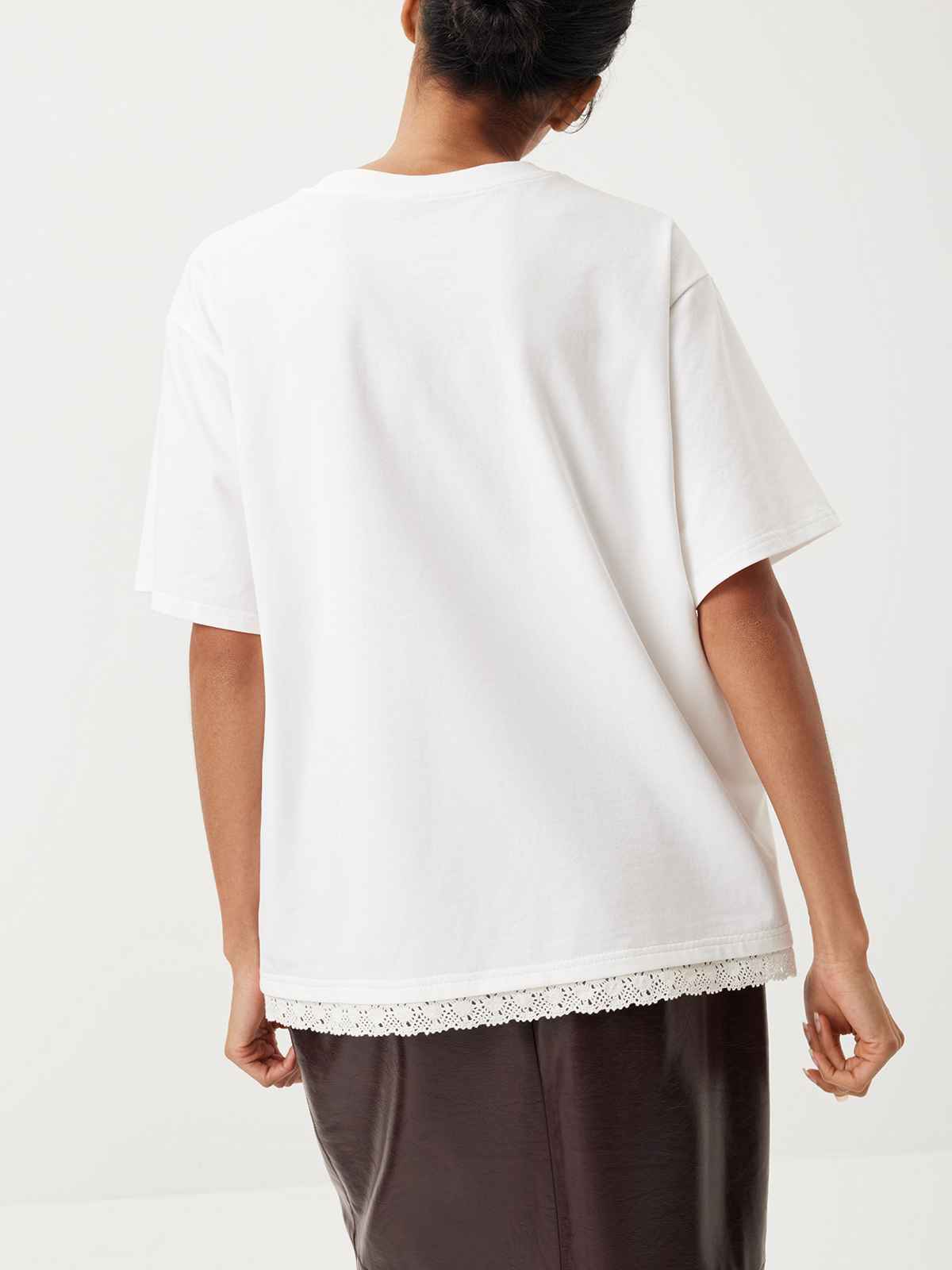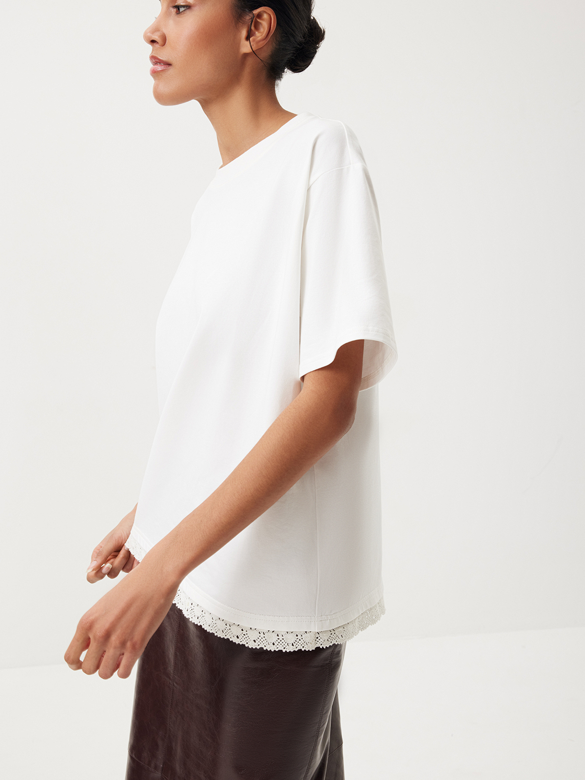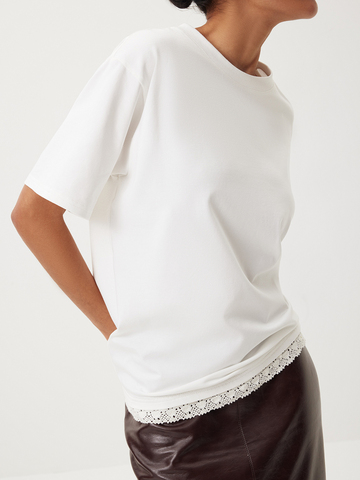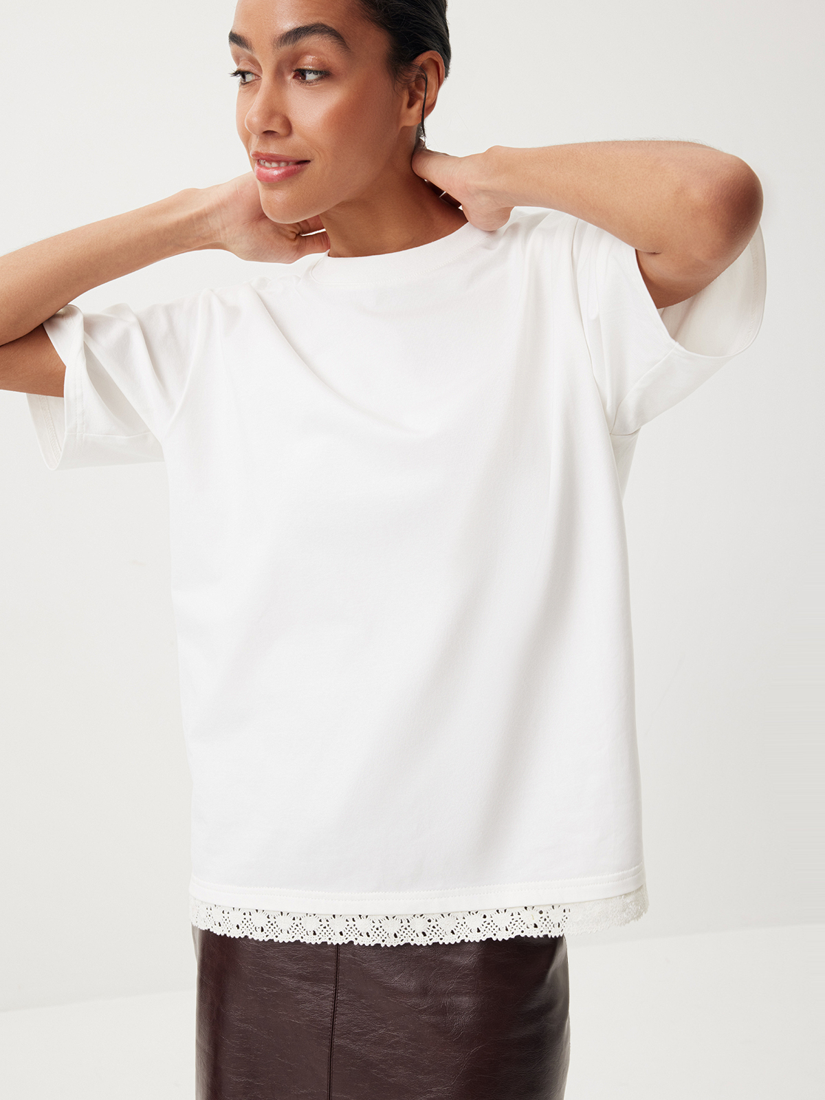 Футболка с кружевом Lace Line — безупречный способ добавить изящный акцент в повседневный гардероб. Базовая модель, объединяющая тренды на многослойность и контрастность, поможет быстро создавать выразительные образы. Объемный крой, плотный хлопковый джерси и универсальный молочный оттенок сделают изделие вашим любимым выбором для любых ситуаций. Для расслабленных образов сочетайте с джинсами и джоггерами Refreshing Olive или соберите эффектную женственную комбинацию с лакированной юбкой Glossy Chocolate.