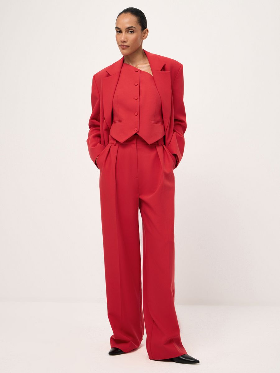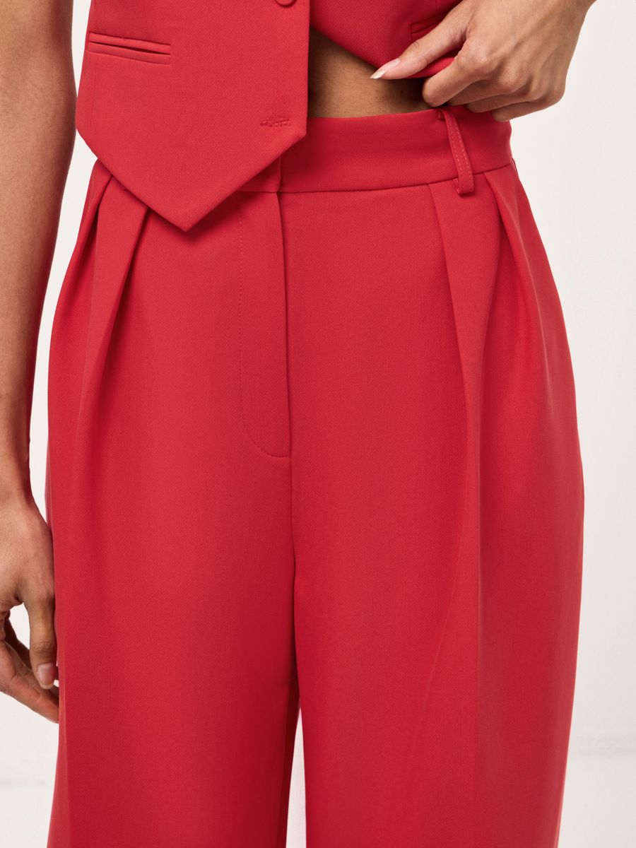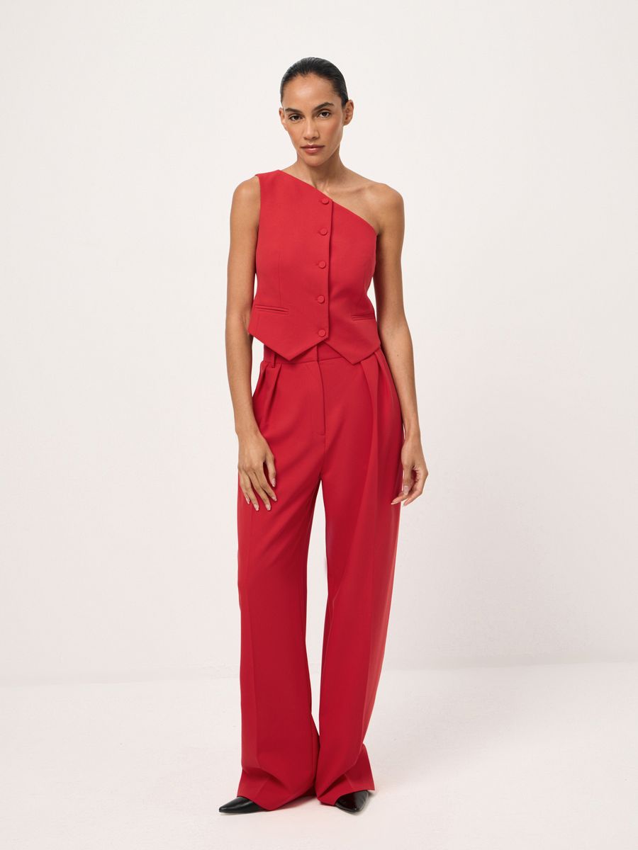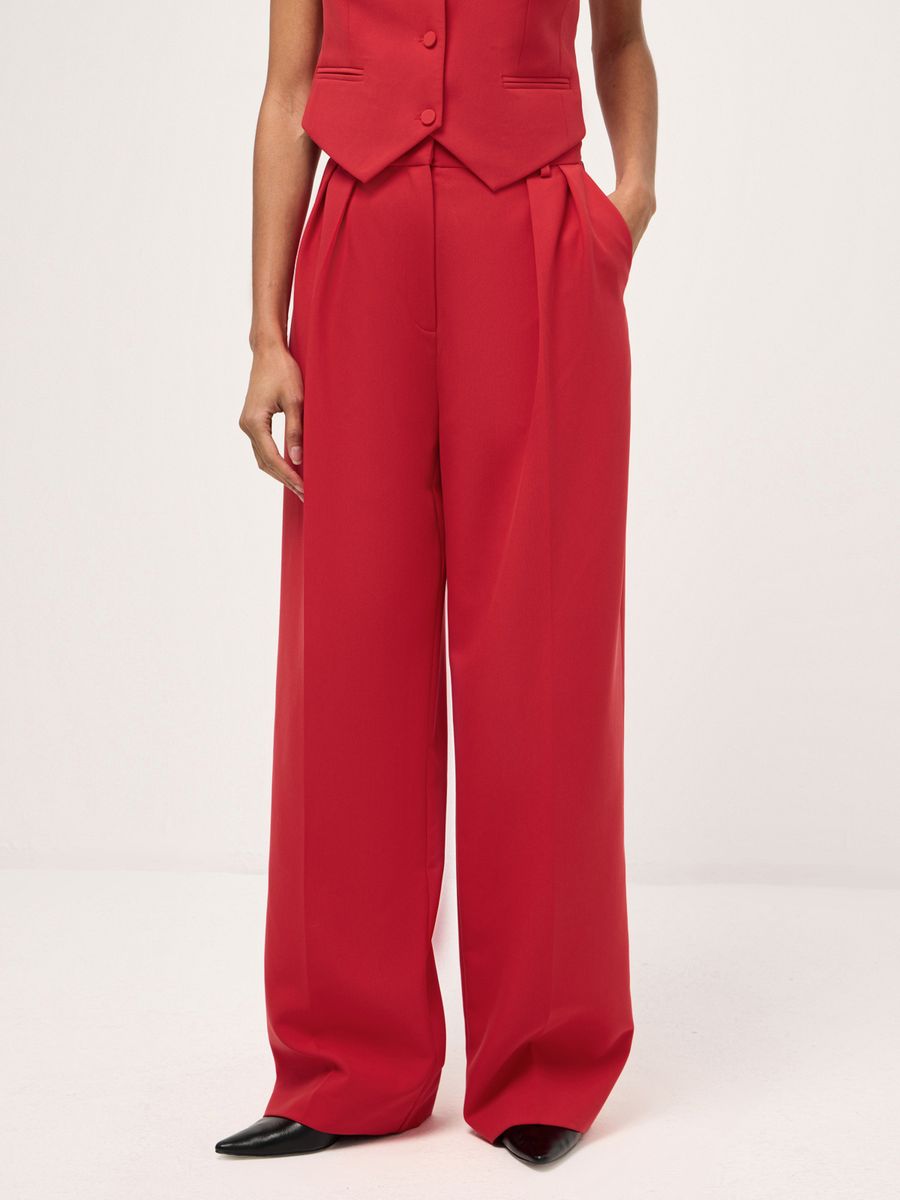 Брюки-палаццо округлого силуэта Imposing Red — вневременной айтем в выразительном красном оттенке, пропитанном энергией большого города. Модель лаконичного кроя с элегантной высокой талией и защипами станет глотком свежего воздуха для делового и casual гардероба, вдохновляя на яркие стилизации. Создаем трендовый аутфит с рубашкой Back To Work в голубом цвете или собираем эффектный сет с жакетом и изящным жилетом на одно плечо в тон. Классические брюки в насыщенном оттенке одинаково безупречны для динамичных будней и светских выходов.