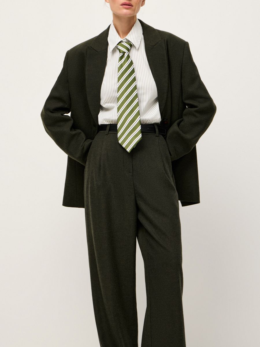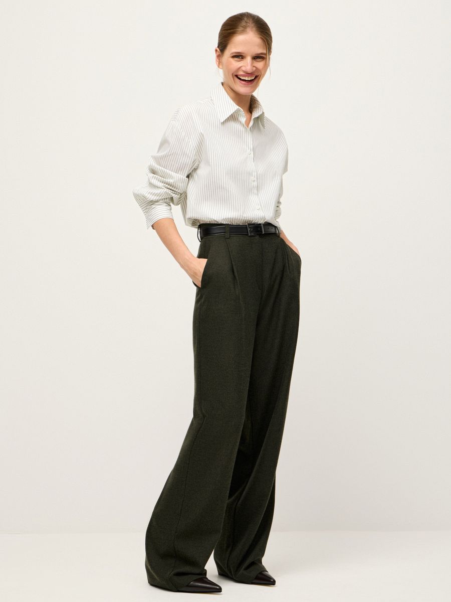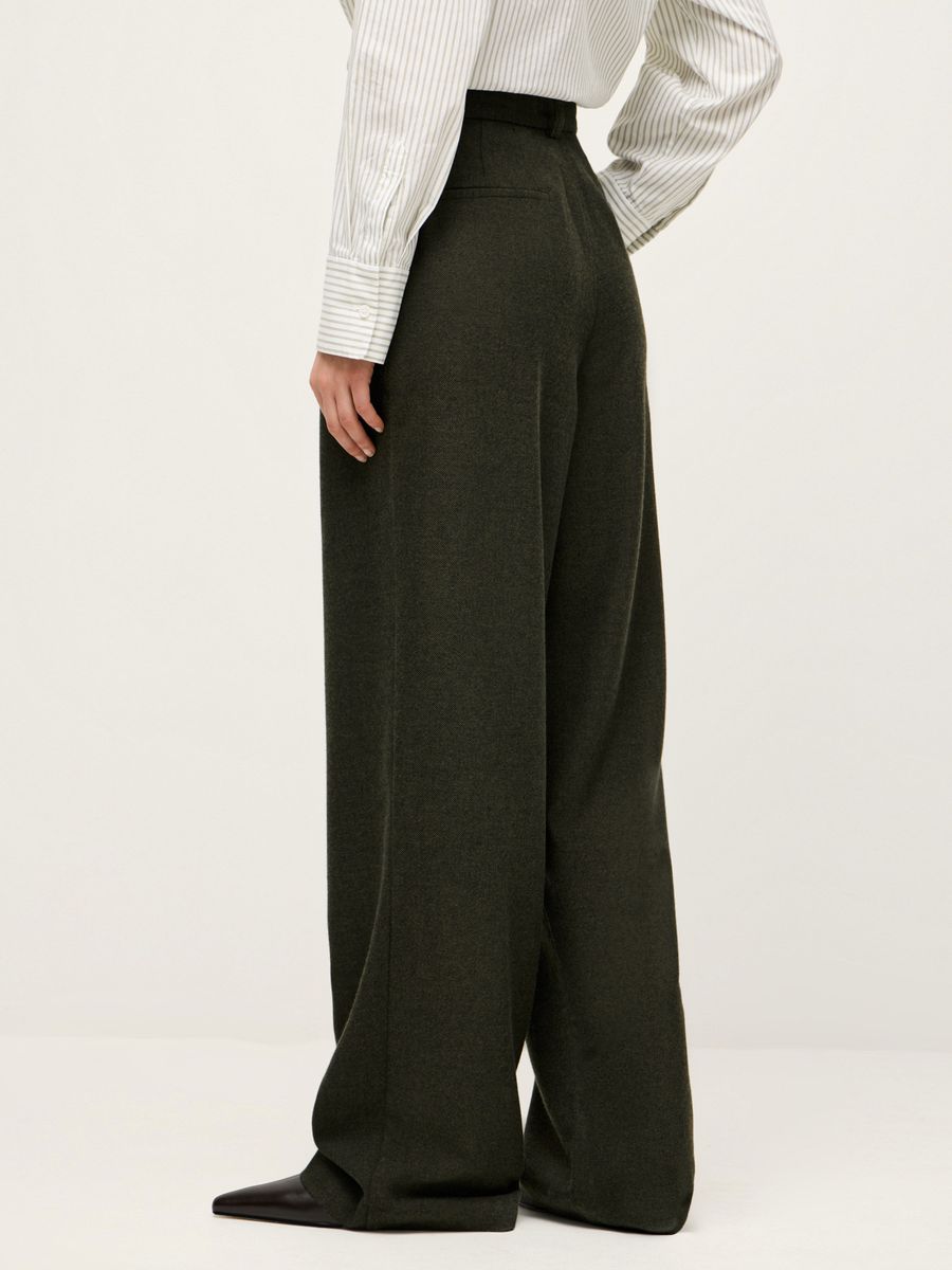 Идеальные брюки-palazzo Wall Street — аристократичный айтем в темно-оливковом оттенке. Созданы для романтичных осенних прогулок, динамичных будней и особенных событий. Широкий крой с защипами, высокая талия и безупречная ткань — детали, не теряющие актуальности. Сочетаем с объемным жакетом в тон для минималистичного аутфита в духе old money, где самодостаточность материала и кроя выходит на первый план. Носим в полной уверенности, что любой образ с ними, вне зависимости от стилизаций, будет выглядеть безукоризненно стильно.
