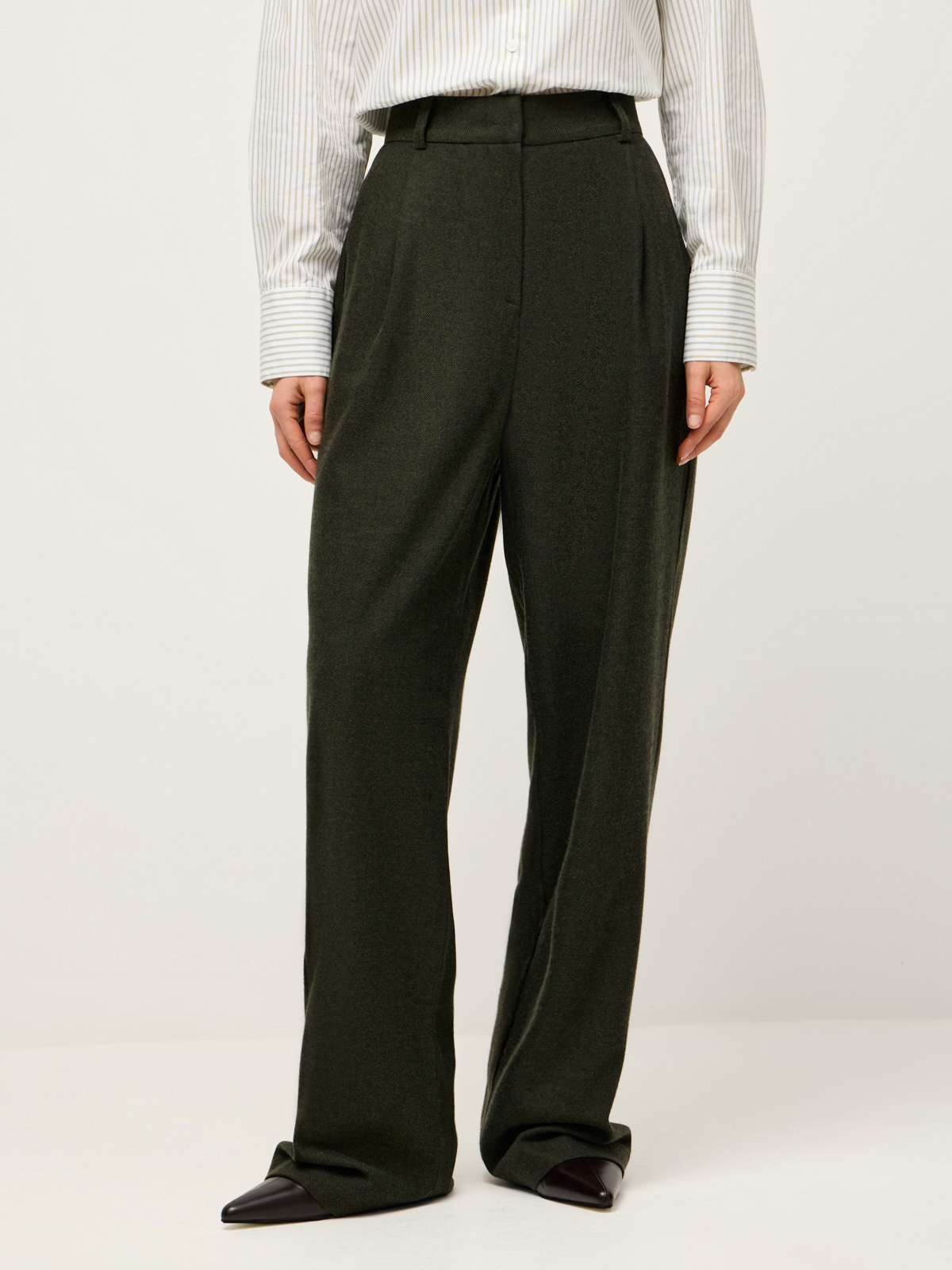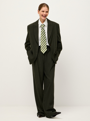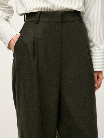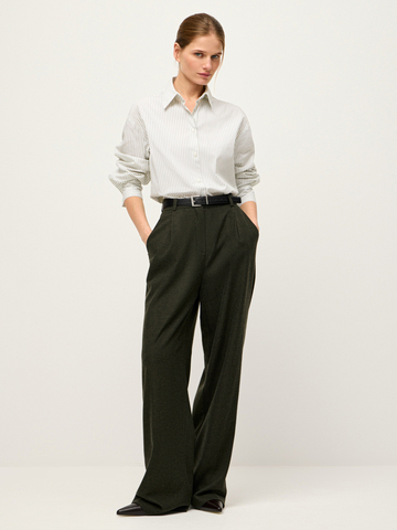 Идеальные брюки-palazzo Wall Street — аристократичный айтем в темно-оливковом оттенке. Созданы для романтичных осенних прогулок, динамичных будней и особенных событий. Широкий крой с защипами, высокая талия и безупречная ткань — детали, не теряющие актуальности. Сочетаем с объемным жакетом в тон для минималистичного аутфита в духе old money, где самодостаточность материала и кроя выходит на первый план. Носим в полной уверенности, что любой образ с ними, вне зависимости от стилизаций, будет выглядеть безукоризненно стильно.
