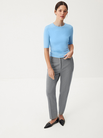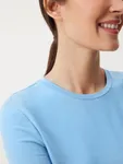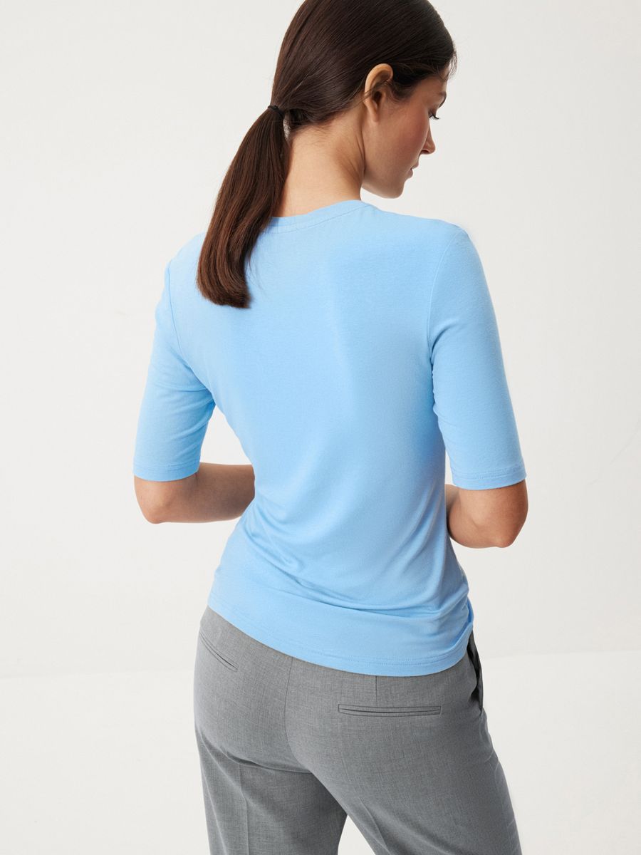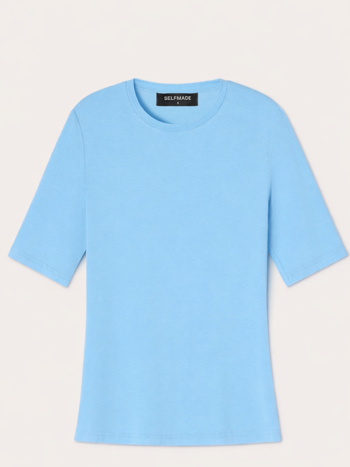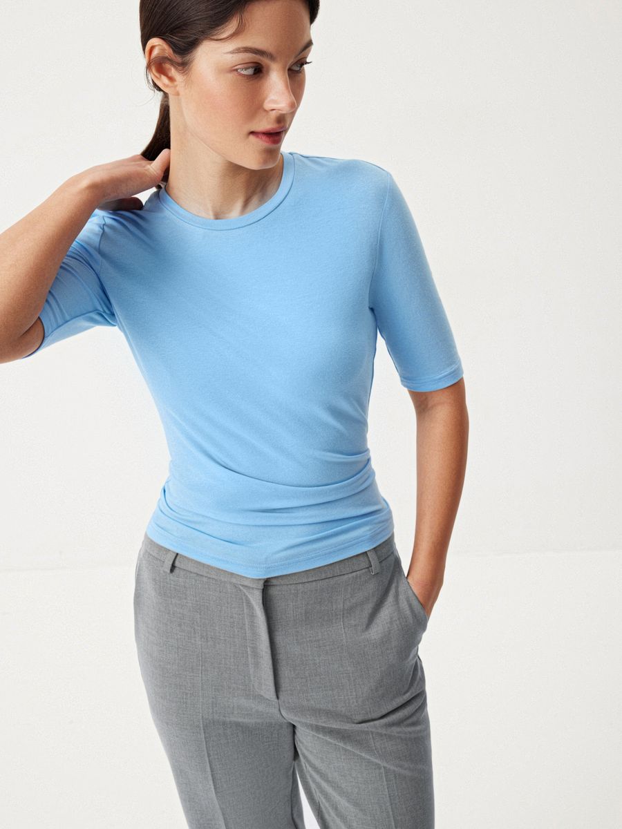 Облегающая футболка Base в небесно-голубом оттенке — тот самый незаменимый элемент гардероба, к которому хочется возвращаться снова и снова. Мягкая вискозная ткань аккуратно подчеркивает силуэт, а удлиненный рукав добавляет утонченности. Ее легко представить в паре с джинсами и лоферами на воскресном бранче, юбкой длины миди и крупными украшениями на встрече с подругами или с лаконичными брюками Clear Grey в загруженные будни. Нет сомнений, что она станет любимой основой гардероба в любом сезоне.
