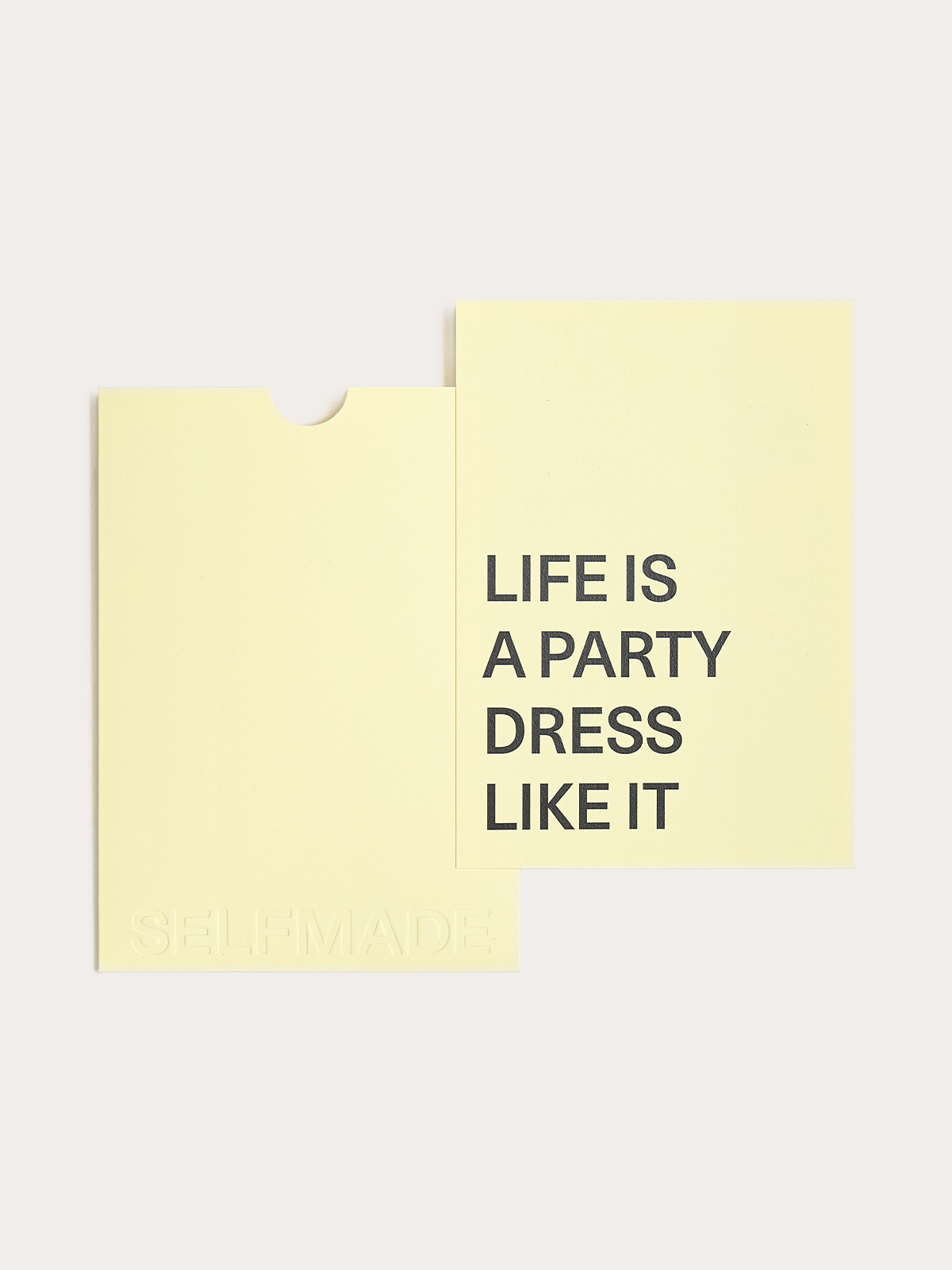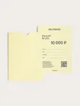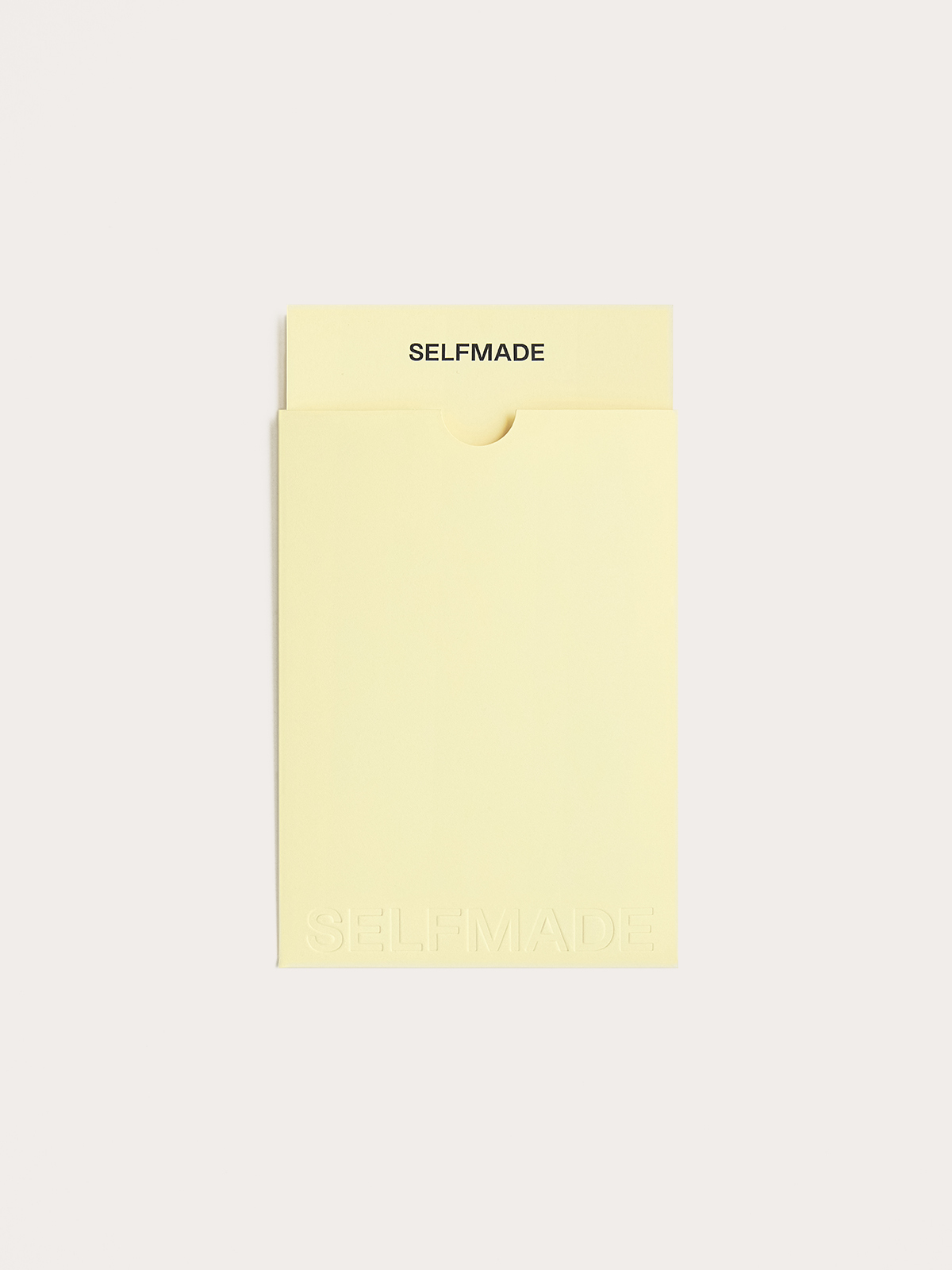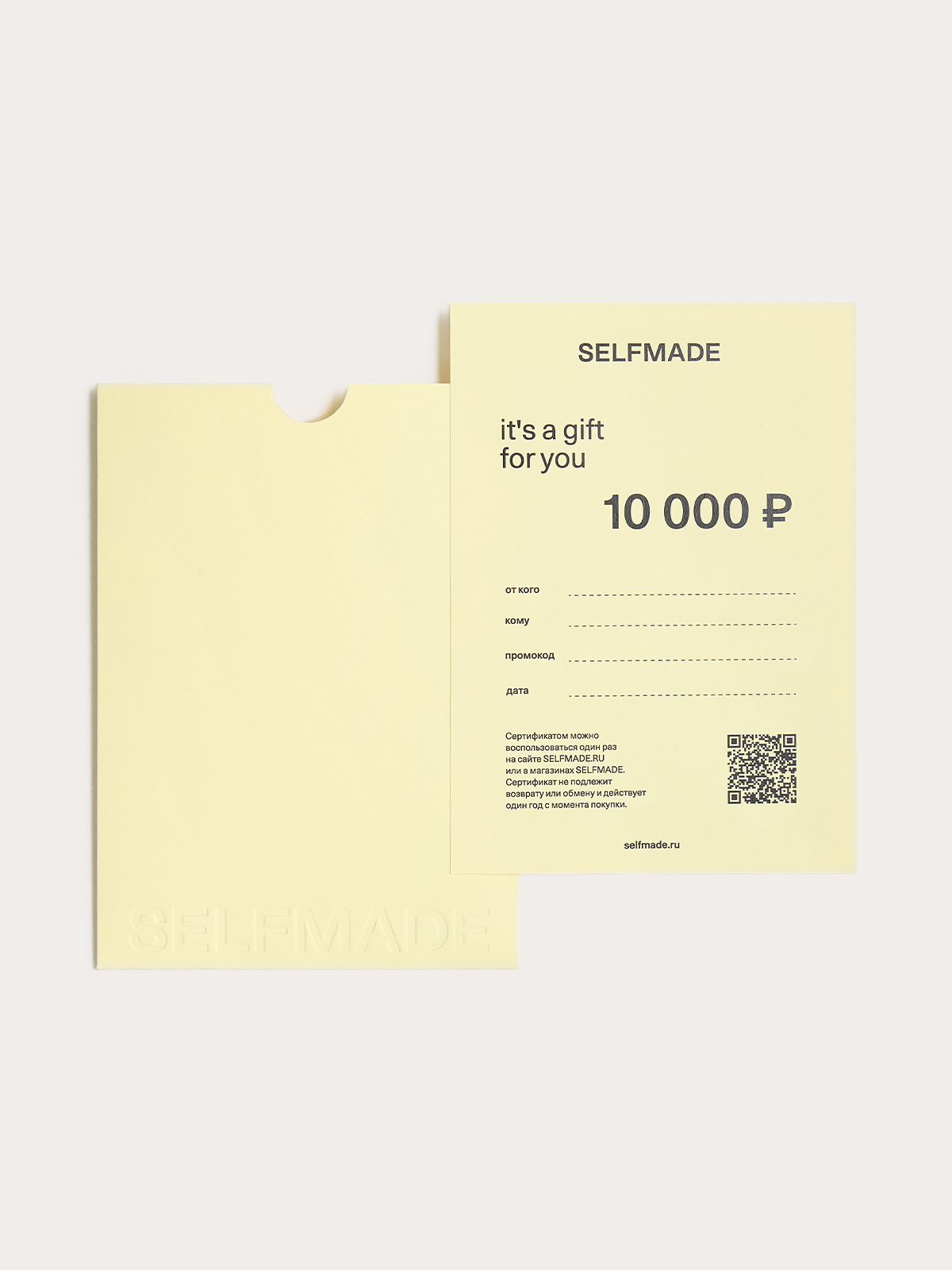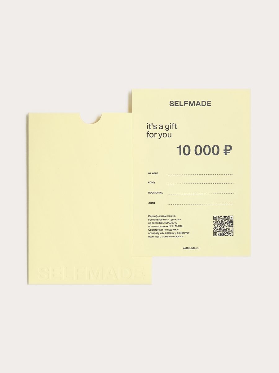 Подарочный сертификат номиналом 10 000 руб. состоит из двух частей: конверта, с вытесненным логотипом SELFMADE, и вкладышем с небольшой вдохновляющей надписью, на котором указаны все важные детали. Сертификат выполнен из плотной и фактурной премиальной бумаги в ярком цвете.