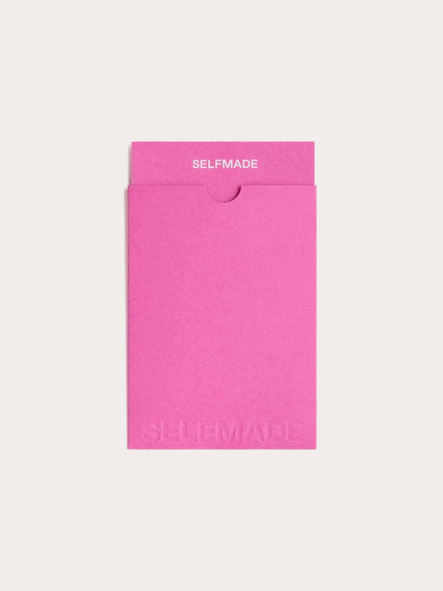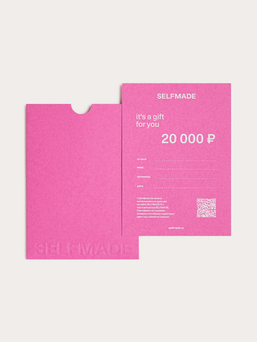 Подарочный сертификат номиналом 20 000 руб. состоит из двух частей: конверта, с вытесненным логотипом SELFMADE, и вкладышем с небольшой вдохновляющей надписью, на котором указаны все важные детали. Сертификат выполнен из плотной и фактурной премиальной бумаги в ярком цвете.