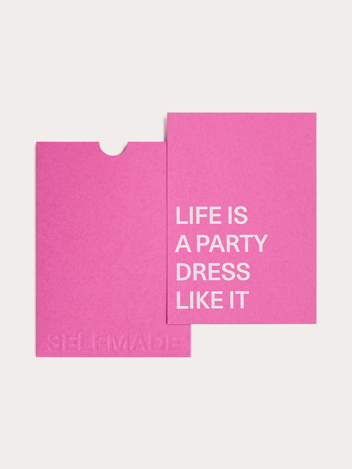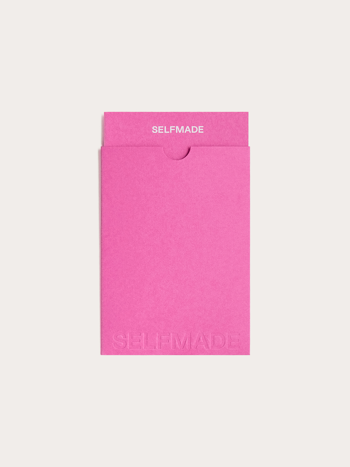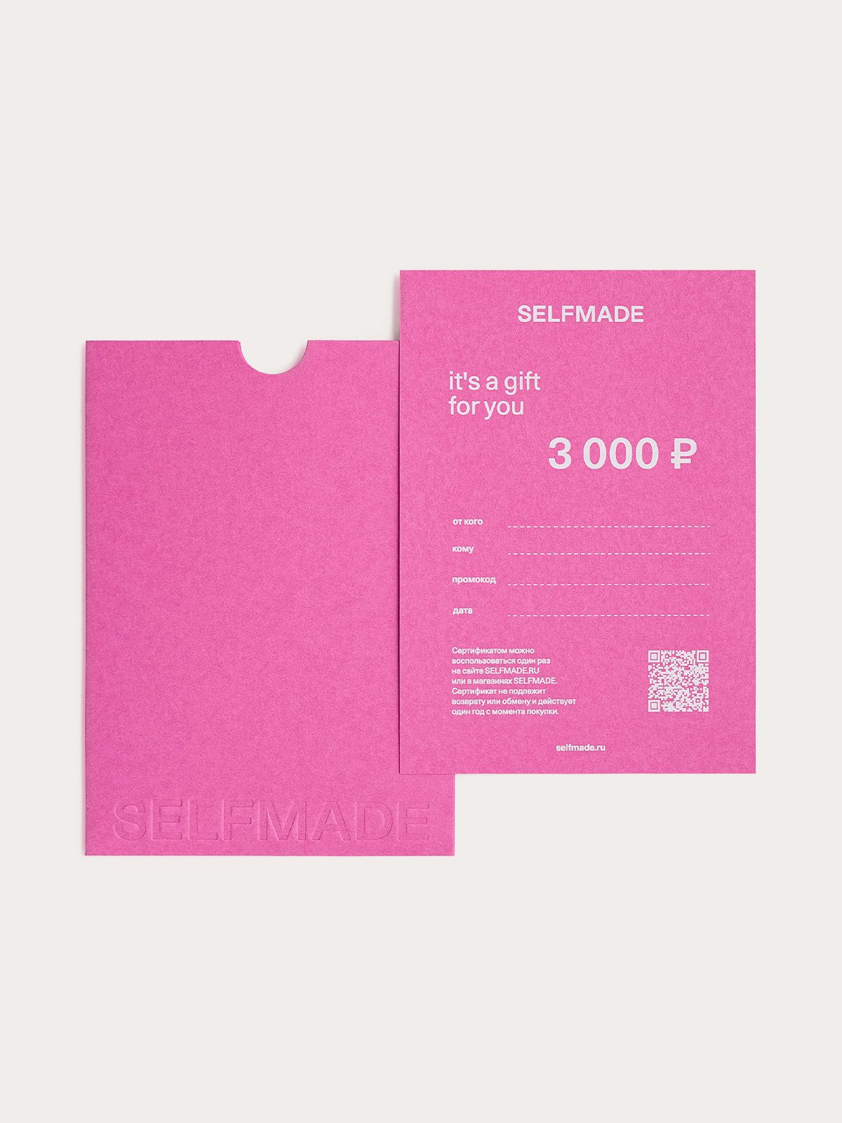 Подарочный сертификат номиналом 3 000 руб. состоит из двух частей: конверта, с вытесненным логотипом SELFMADE, и вкладышем с небольшой вдохновляющей надписью, на котором указаны все важные детали. Сертификат выполнен из плотной и фактурной премиальной бумаги в ярком цвете.