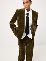 Лаконичный жакет из вельвета Intense Olive — чистота линий и роскошная фактура ткани. Оливковый оттенок придает образу глубины и изысканного шарма. Четкая линия плеч, V-образный вырез и застежка на одну пуговицу становятся утонченными акцентами модели. Минималистичный силуэт в сочетании со структурным вельветом создают идеальный тандем для динамичной осени в большом городе — когда хочется выглядеть собранно, но ощущать уют и мягкость. Носим с прямыми брюками в тон для безупречного сета с легким оттенком ностальгии и добавляем базу в зависимости от сценария предстоящего дня: от облегающего топа до рубашки Office Day.