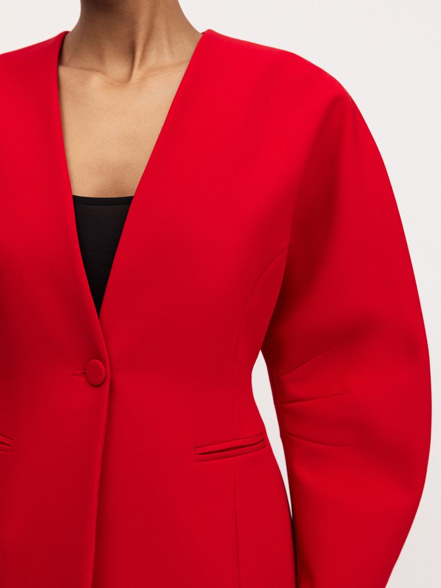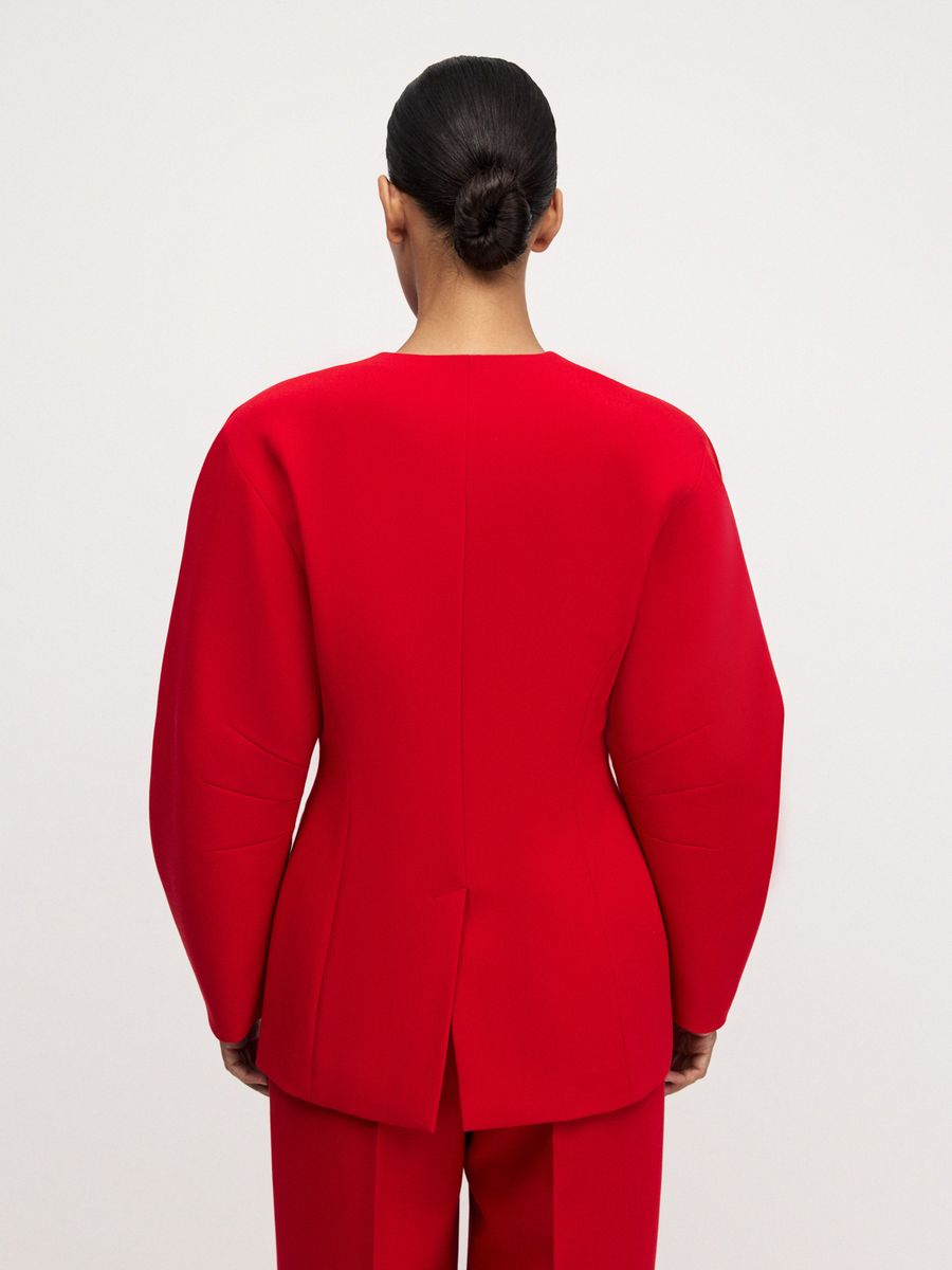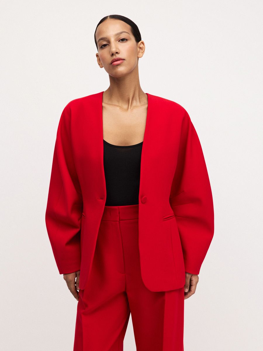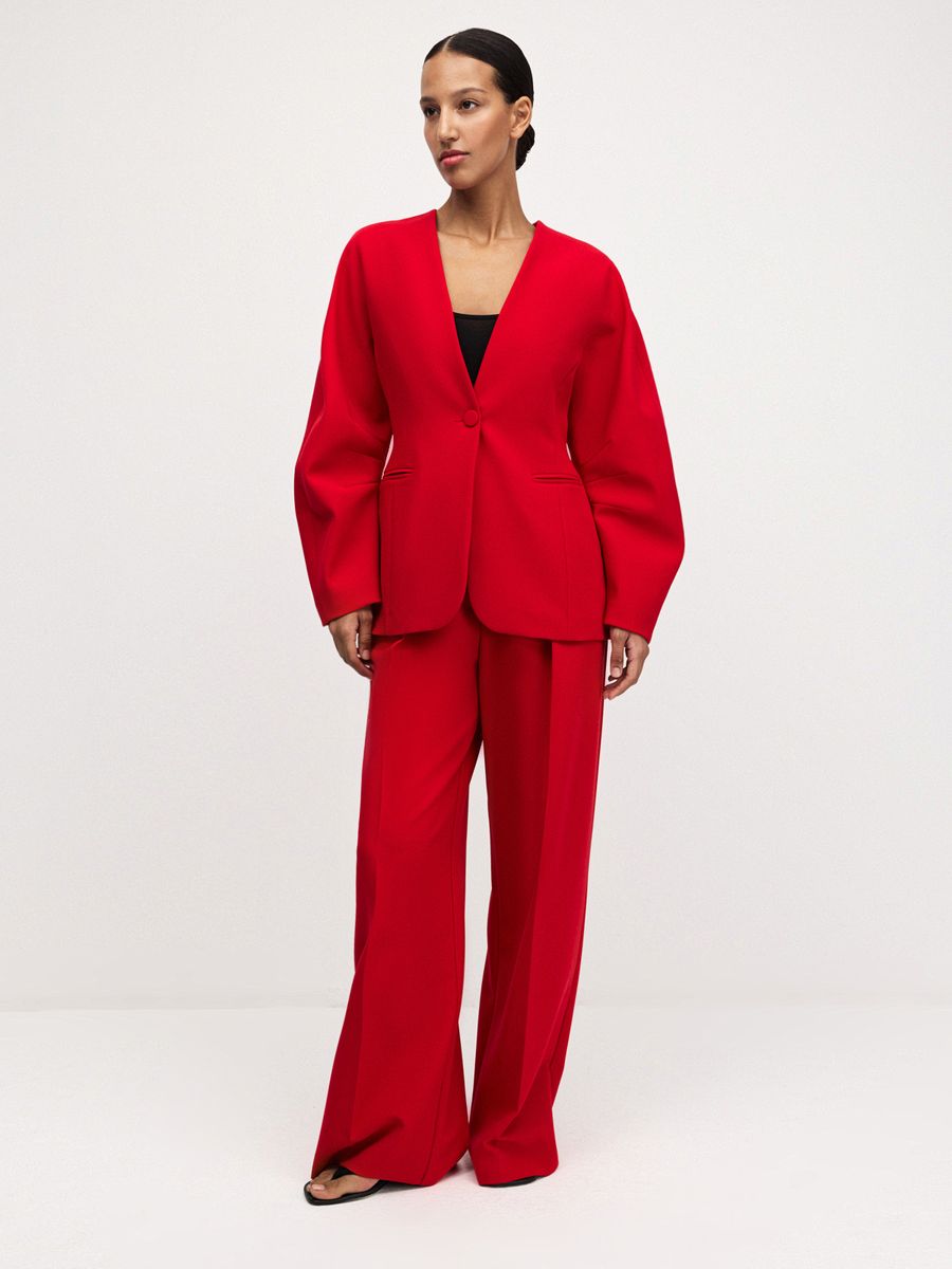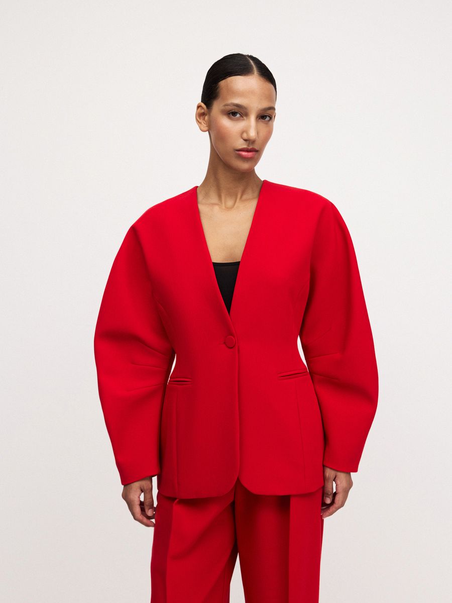 Структурный жакет The Right Red — воплощение графичной женственности и легкой дерзости. Чистые линии, округлые плечи и объемные рукава формируют скульптурный силуэт с мягким акцентом на талию, а благодаря структуре костюмной ткани, жакет отлично держит форму. Идеален в паре с эффектными брюками на высокой посадке того же оттенка — для выразительного и яркого выхода или в комплекте с юбкой длины midaxi Red Mist — настоящее воплощение элегантности и смелости.