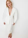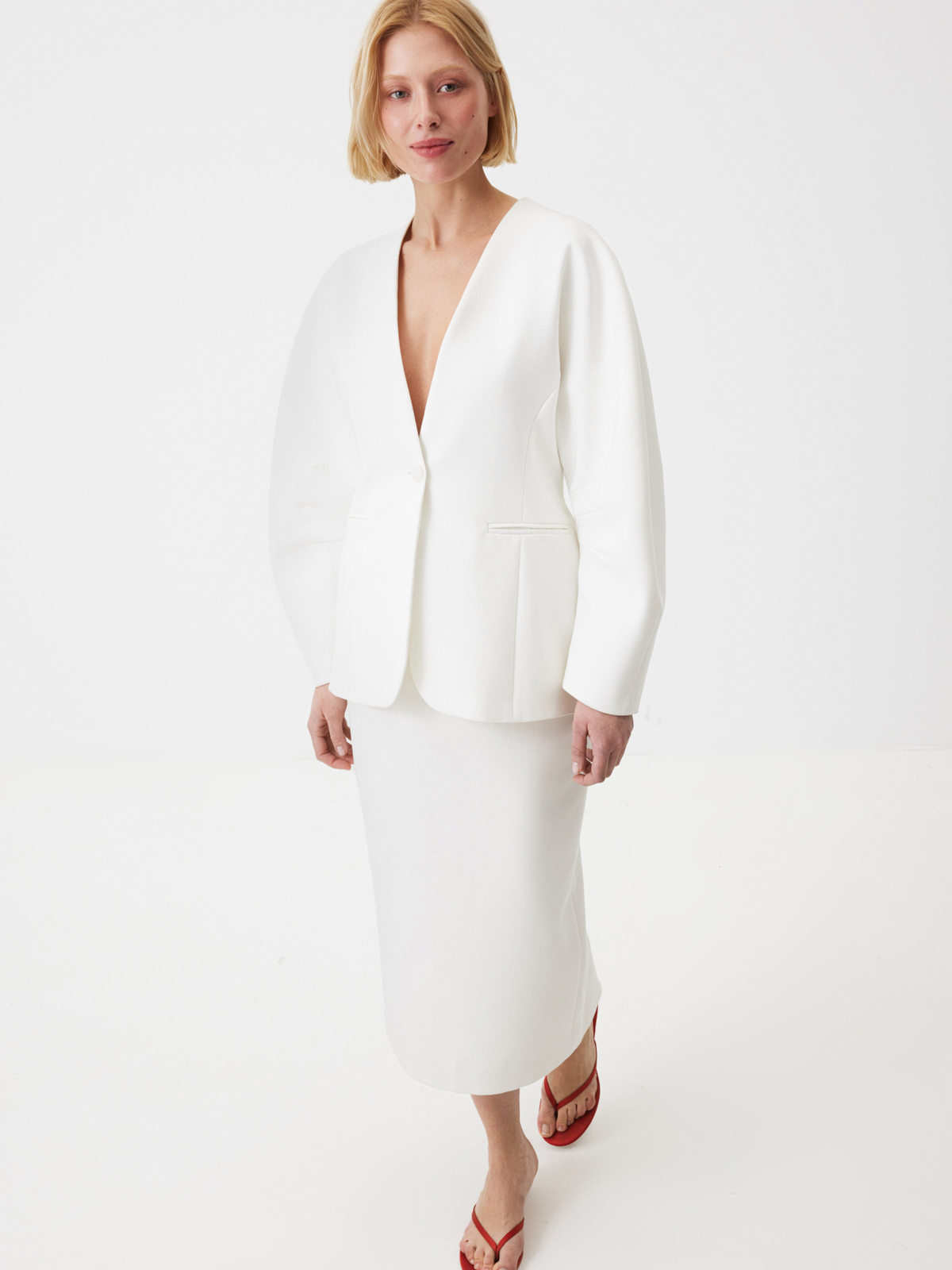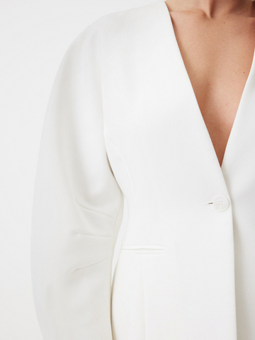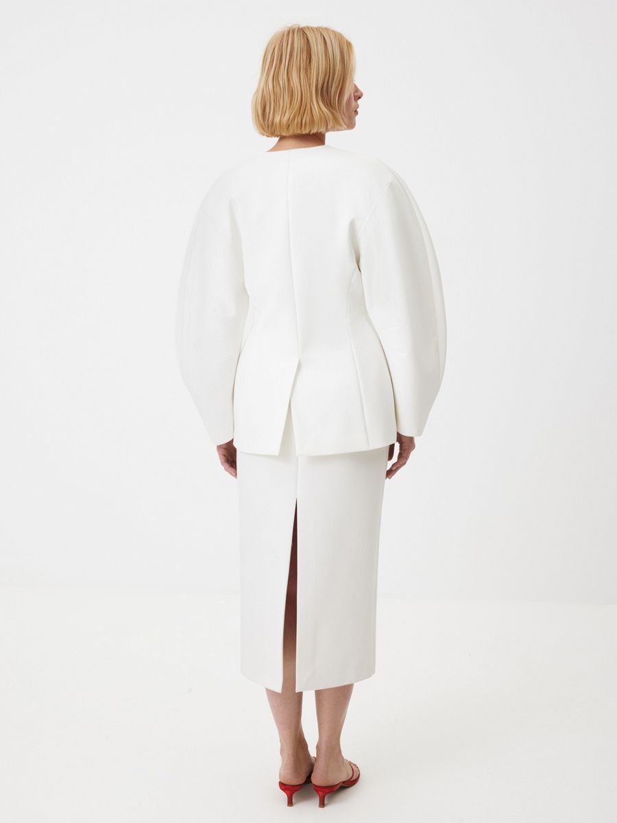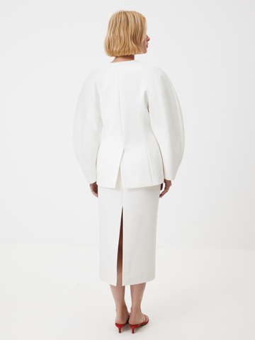 Структурный жакет Milky Parfait — воплощение графичной женственности. Чистые линии, округлые плечи и объемные рукава формируют скульптурный силуэт с мягким акцентом на талию, а благодаря структуре костюмной ткани, жакет отлично держит форму. Идеален в паре с безупречными палаццо — для минималистичного и выразительного выхода или в комплекте со скульптурной юбкой Carrie In Paris — настоящее воплощение женственности и изящности. Этот жакет легко становится основой торжественного образа — для праздничного вечера, важного события или церемонии.