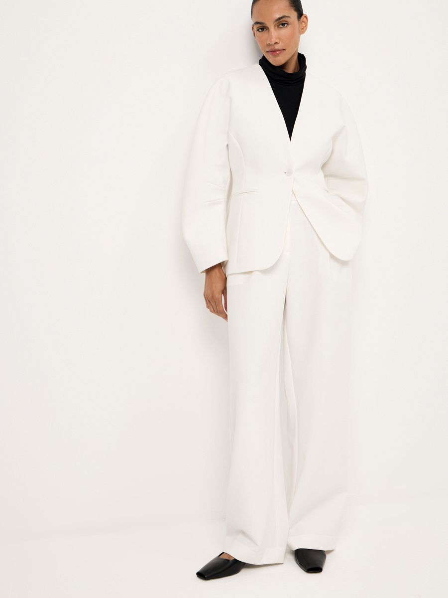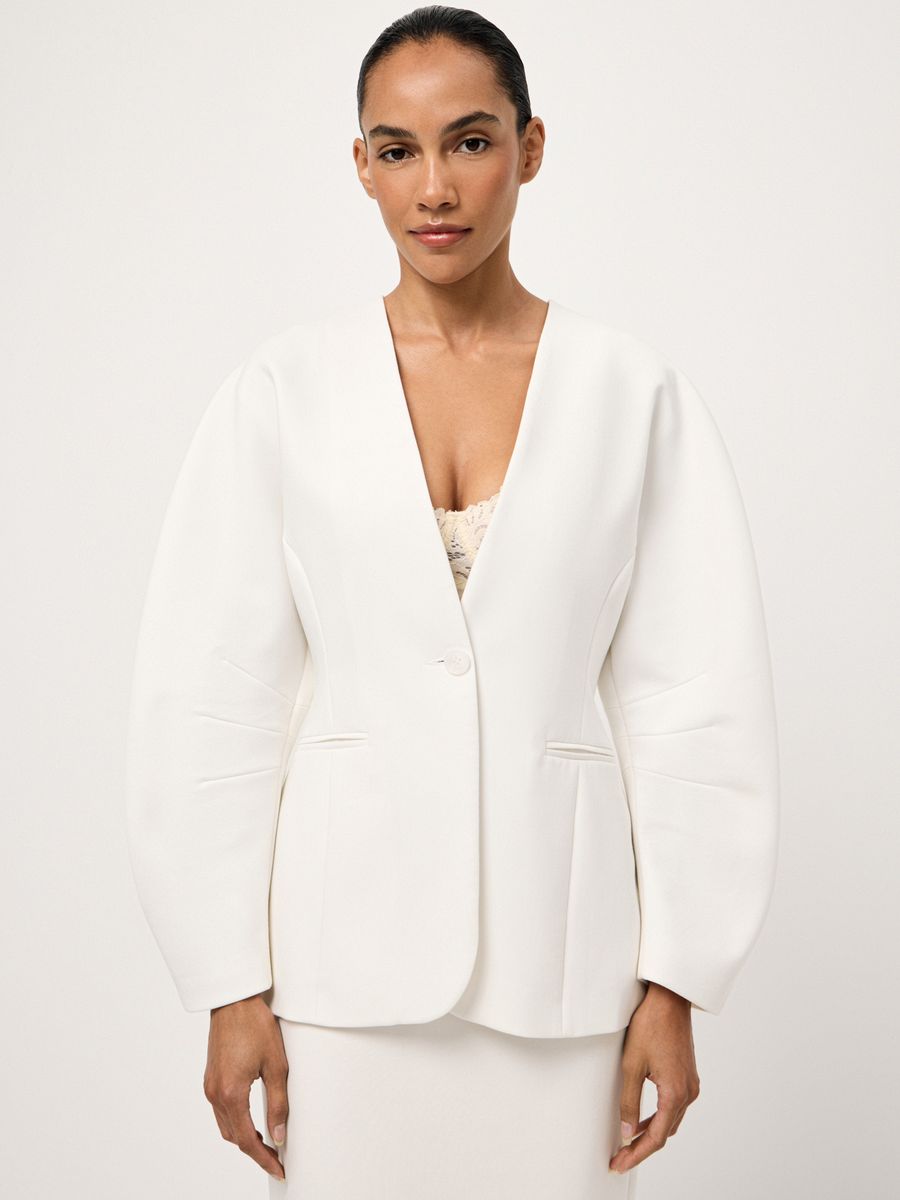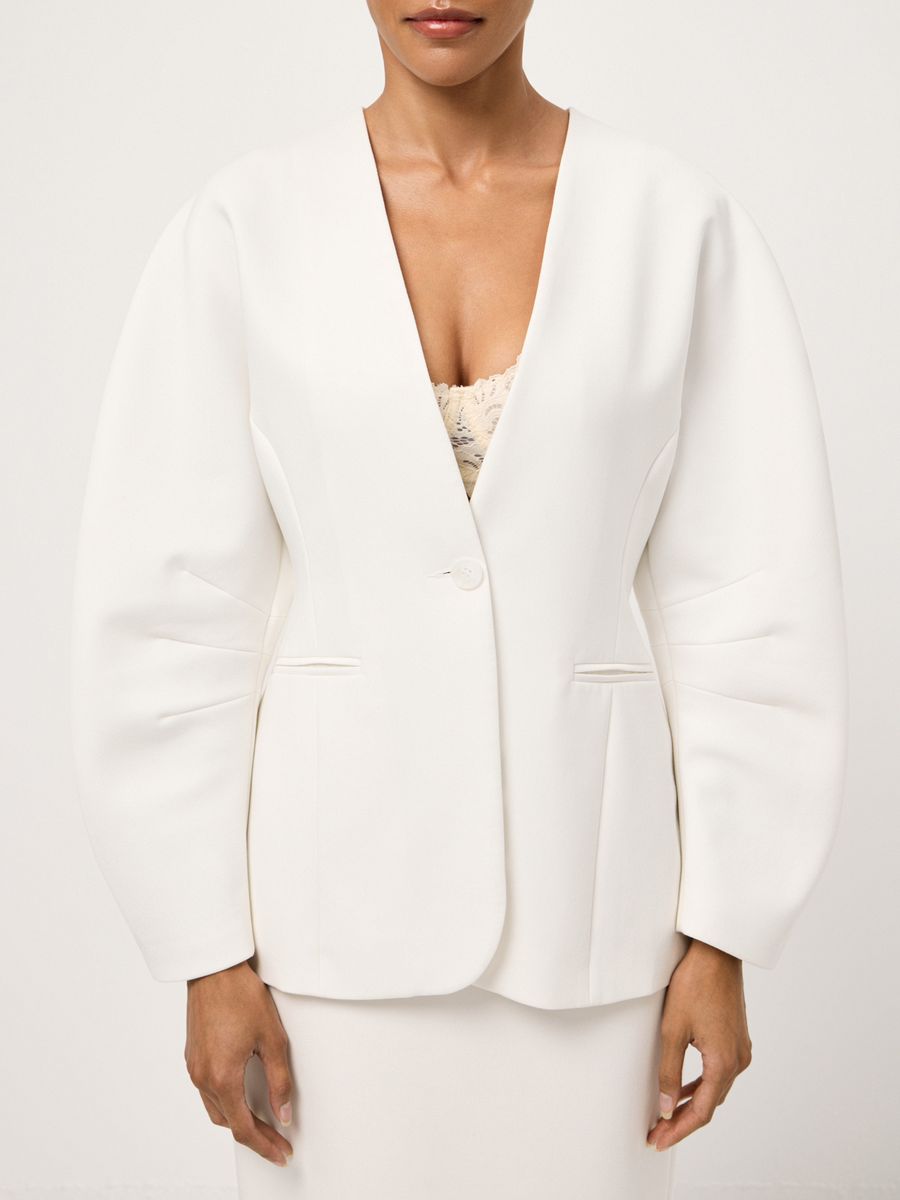 Структурный жакет Milky Parfait — воплощение графичной женственности. Чистые линии, округлые плечи и объемные рукава формируют скульптурный силуэт с мягким акцентом на талию, а благодаря структуре костюмной ткани, жакет отлично держит форму. Идеален в паре с безупречными палаццо — для минималистичного и выразительного выхода или в комплекте со скульптурной юбкой Carrie In Paris — настоящее воплощение женственности и изящности.