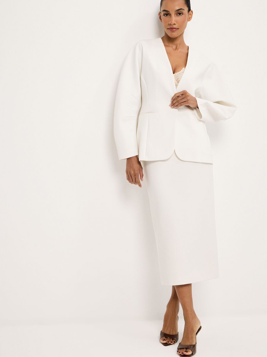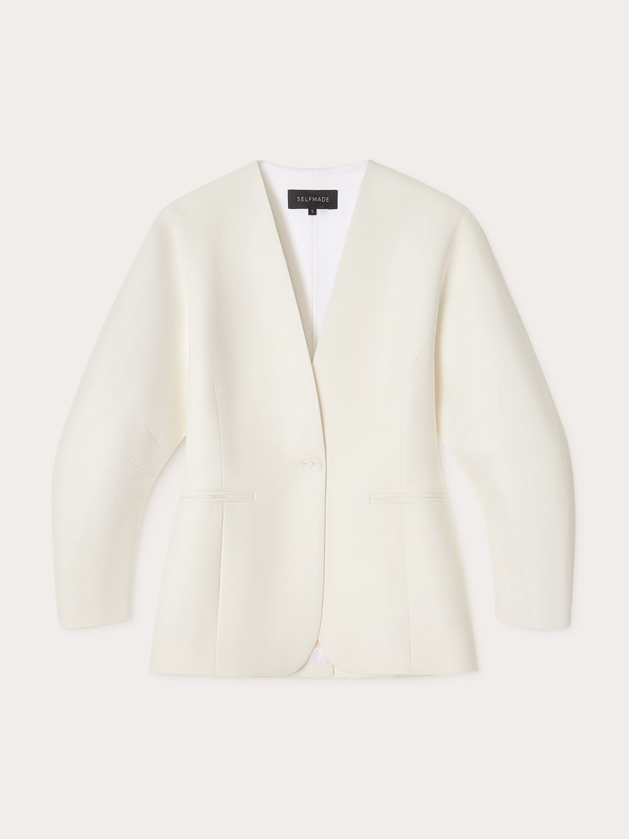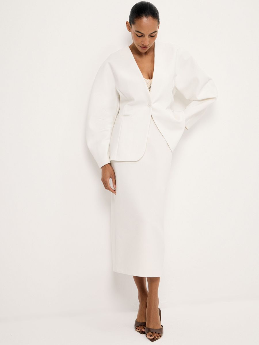 Структурный жакет Milky Parfait — воплощение графичной женственности. Чистые линии, округлые плечи и объемные рукава формируют скульптурный силуэт с мягким акцентом на талию, а благодаря структуре костюмной ткани, жакет отлично держит форму. Идеален в паре с безупречными палаццо — для минималистичного и выразительного выхода или в комплекте со скульптурной юбкой Carrie In Paris — настоящее воплощение женственности и изящности.