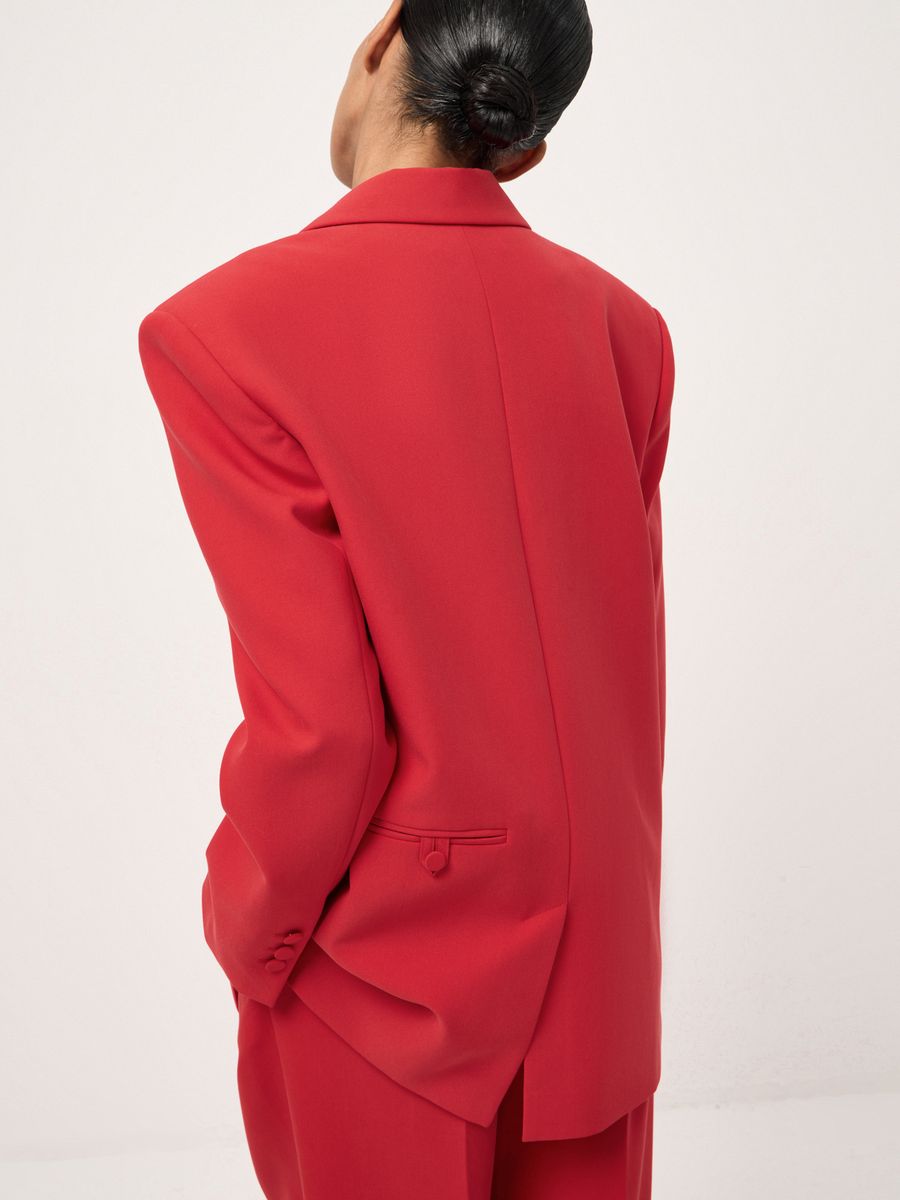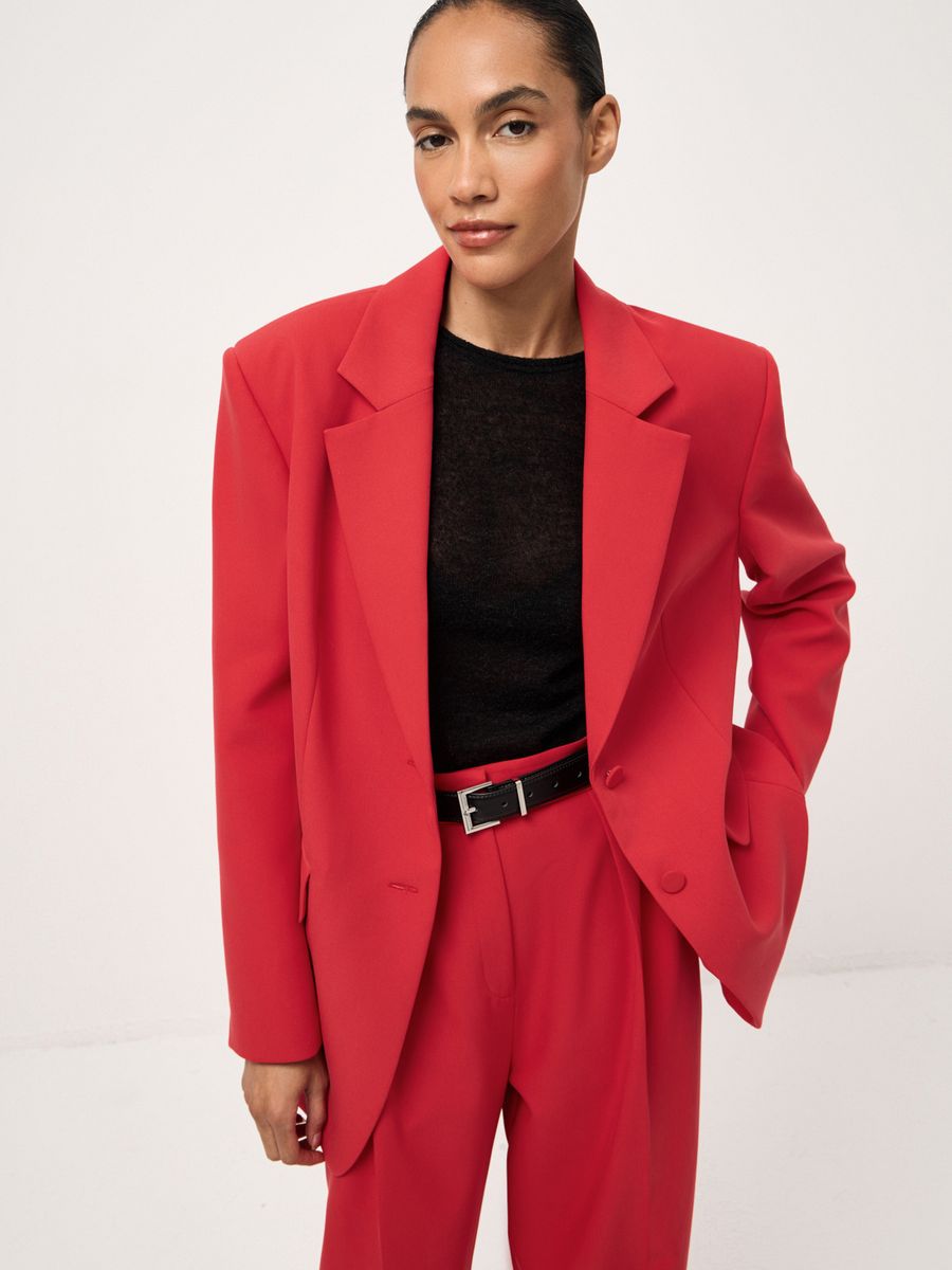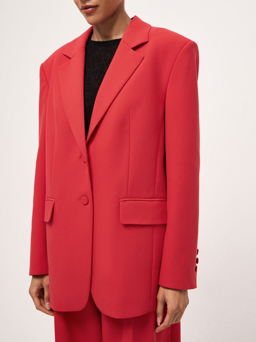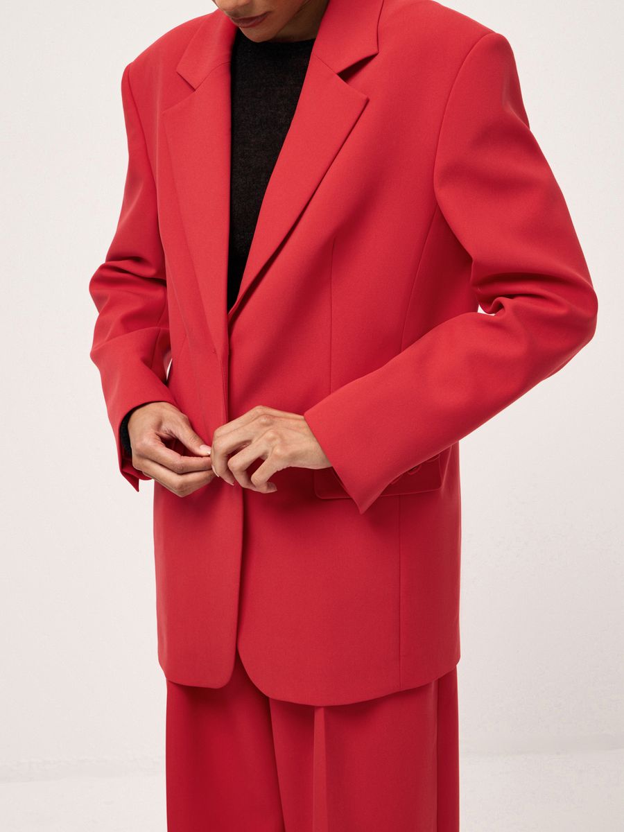 Жакет с акцентом на линию плеч Imposing Red — ода женственной чувственности, выраженная в строгой форме и пульсирующем красном оттенке. Продуманный крой с классическими лацканами, пуговицами в тон и аккуратным карманом сзади делает модель неотъемлемой частью делового гардероба, а смелая расцветка привносит нотку extra, необходимую для образов на вечеринки и торжественные события. Носим в неотразимом монохромном сете с изящным жилетом на одно плечо и палаццо округлого силуэта, когда хочется быть смелой, бескомпромиссной и уверенной.
