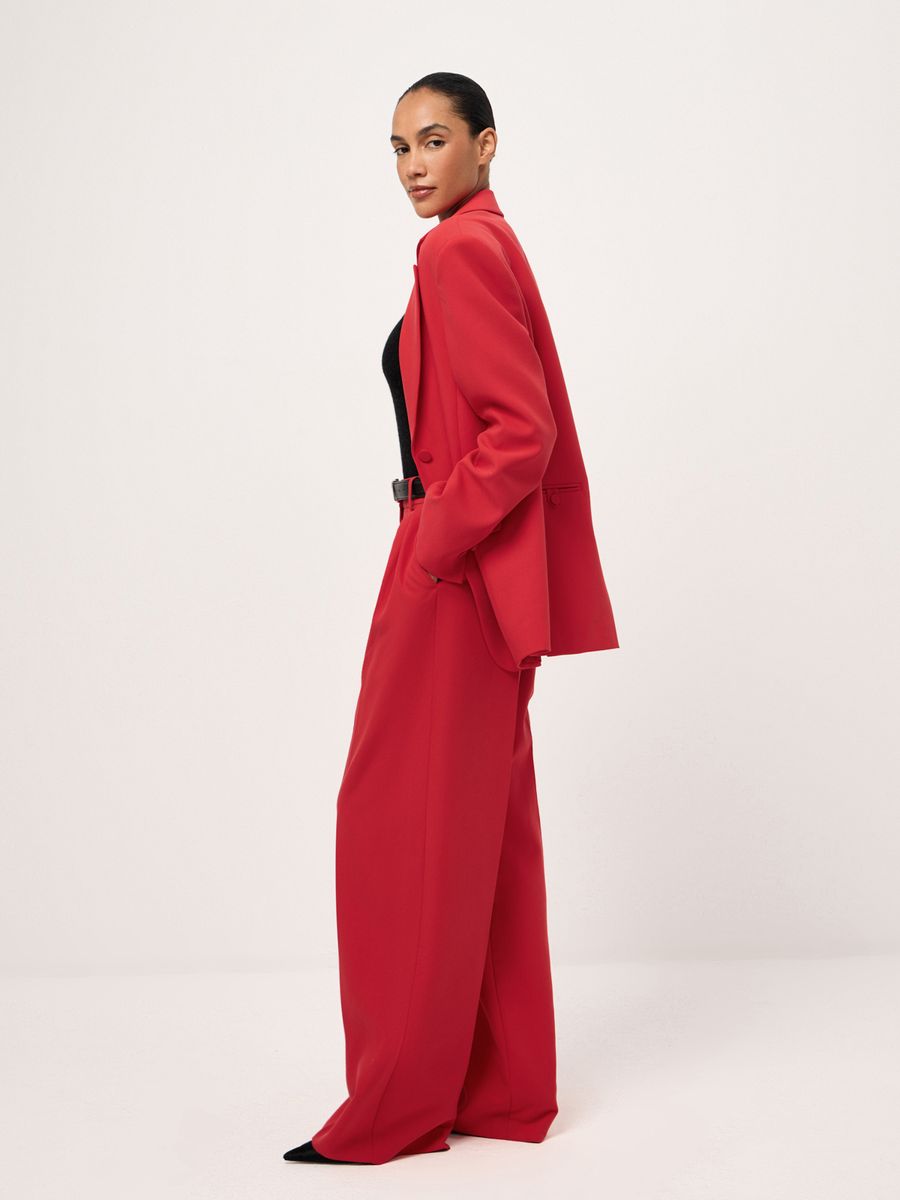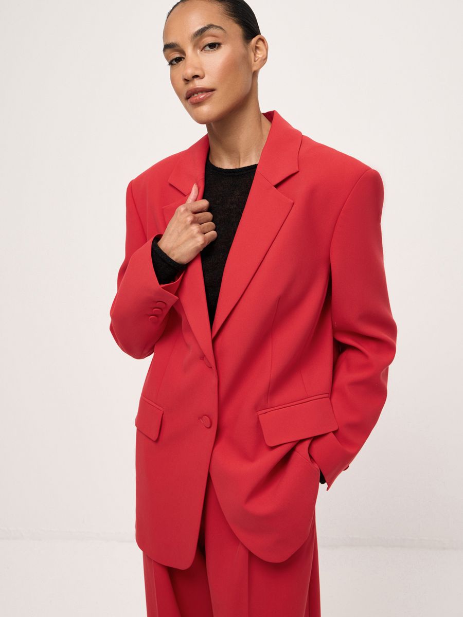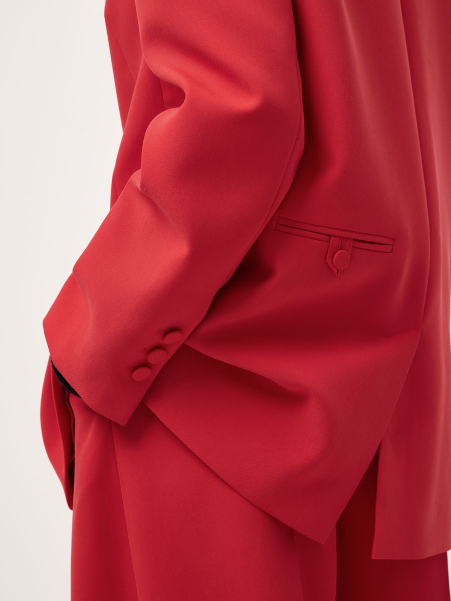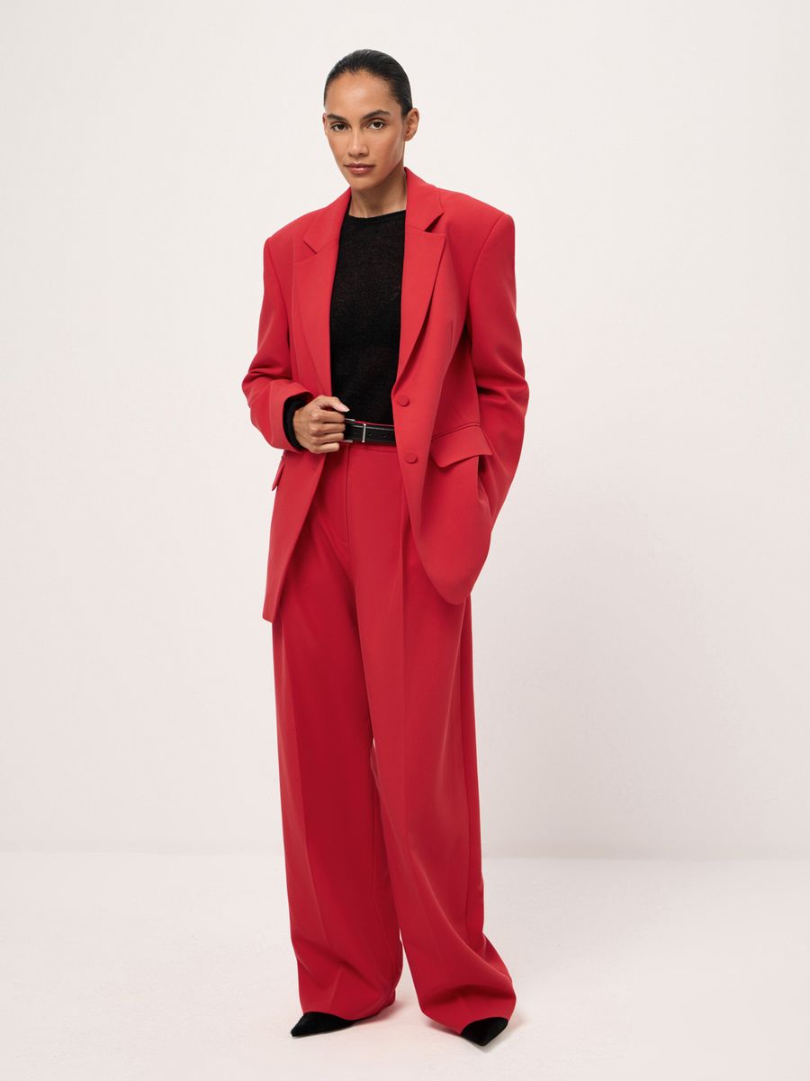 Жакет с акцентом на линию плеч Imposing Red — ода женственной чувственности, выраженная в строгой форме и пульсирующем красном оттенке. Продуманный крой с классическими лацканами, пуговицами в тон и аккуратным карманом сзади делает модель неотъемлемой частью делового гардероба, а смелая расцветка привносит нотку extra, необходимую для образов на вечеринки и торжественные события. Носим в неотразимом монохромном сете с изящным жилетом на одно плечо и палаццо округлого силуэта, когда хочется быть смелой, бескомпромиссной и уверенной.