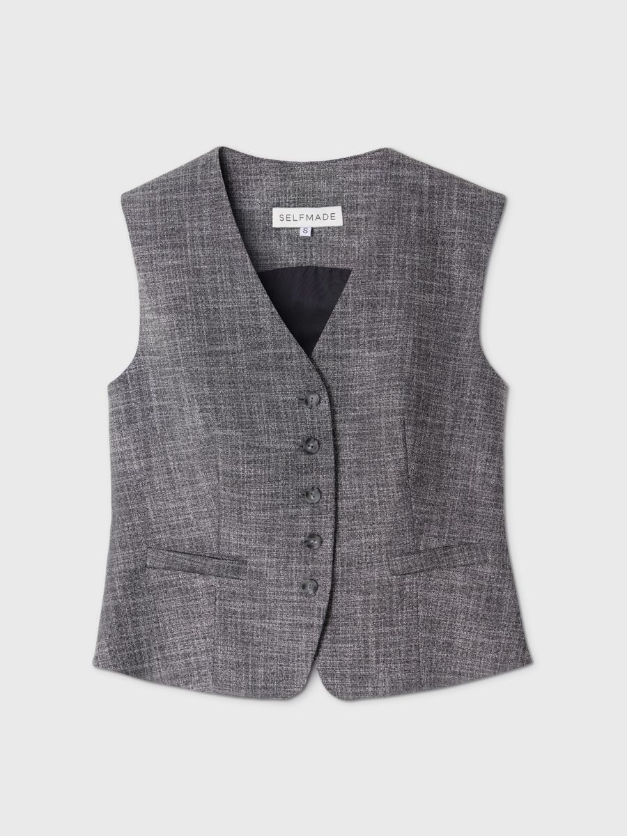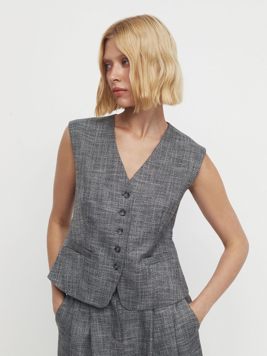 Костюмный жилет в оттенке salt&pepper — это эффектный акцент для вашего гардероба. Приталенный силуэт, V-образный вырез и ряд из пяти пуговиц вместе создают элегантную и выразительную модель. Особое внимание стоит обратить на его уникальный цвет — salt&pepper, который придает этому жилету изысканности и фактуры. Материал сочетает в себе ахроматические оттенки, создавая нескучный вид. Рекомендуем носить его как с другими элементами одежды в серых и белых тонах, так и с контрастными деталями для создания эффектных образов.