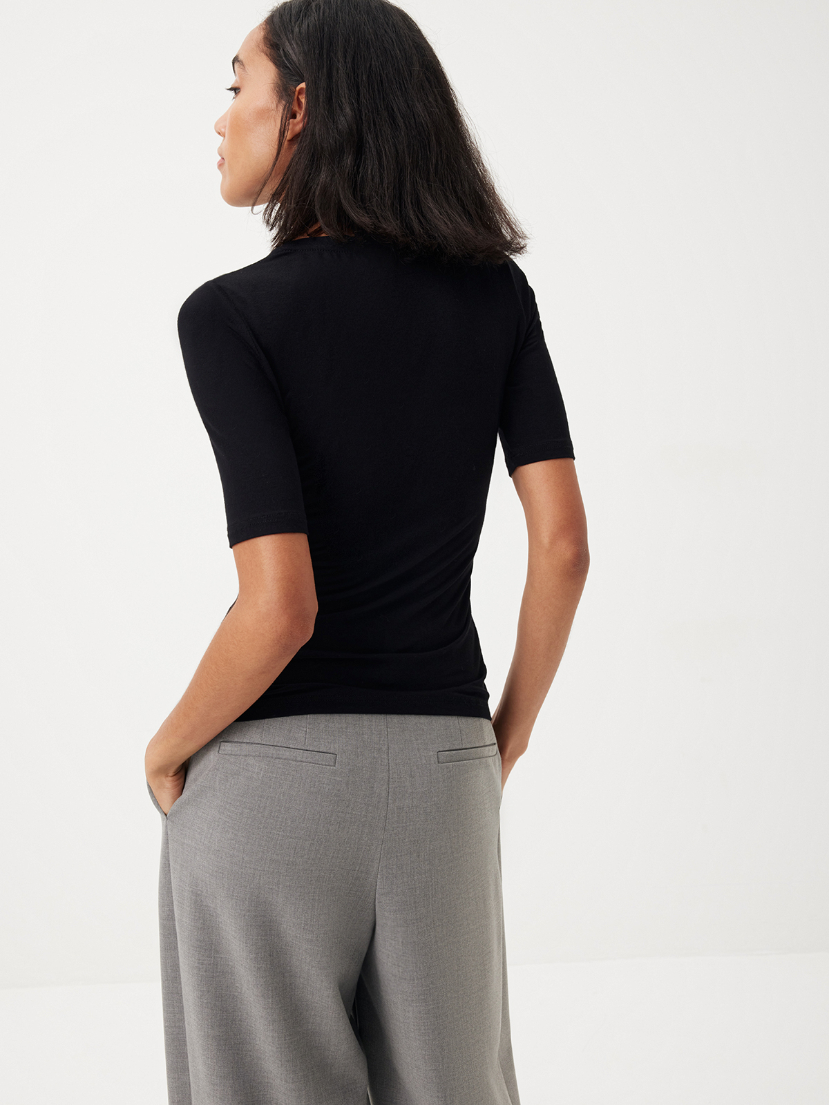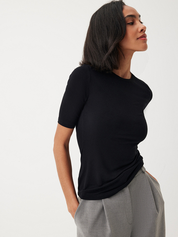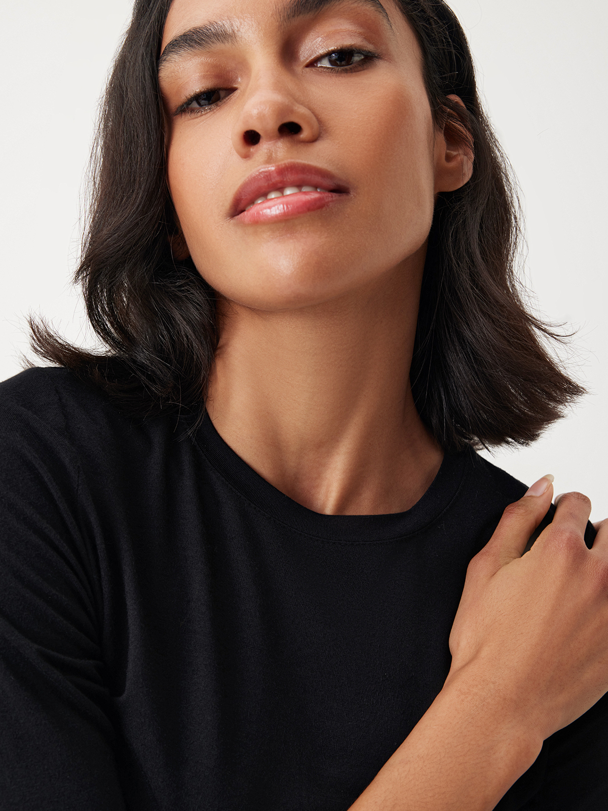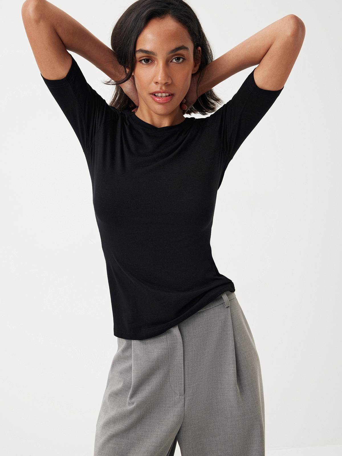 Облегающая футболка Base в классическом черном цвете — тот самый незаменимый элемент гардероба, к которому хочется возвращаться снова и снова. Мягкая и эластичная ткань комфортно облегает тело, аккуратно подчеркивая силуэт, а удлиненный рукав добавляет утонченности. Ее легко представить в паре с джинсами и лоферами на воскресном бранче, юбкой-миди и крупными украшениями на встрече с подругами или соло в загруженные будни. Нет сомнений, что она станет основой гардероба в любом сезоне, поэтому предпочитаем не ограничиваться одним оттенком.