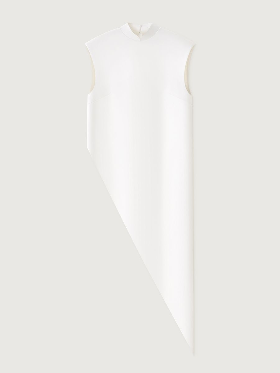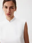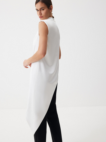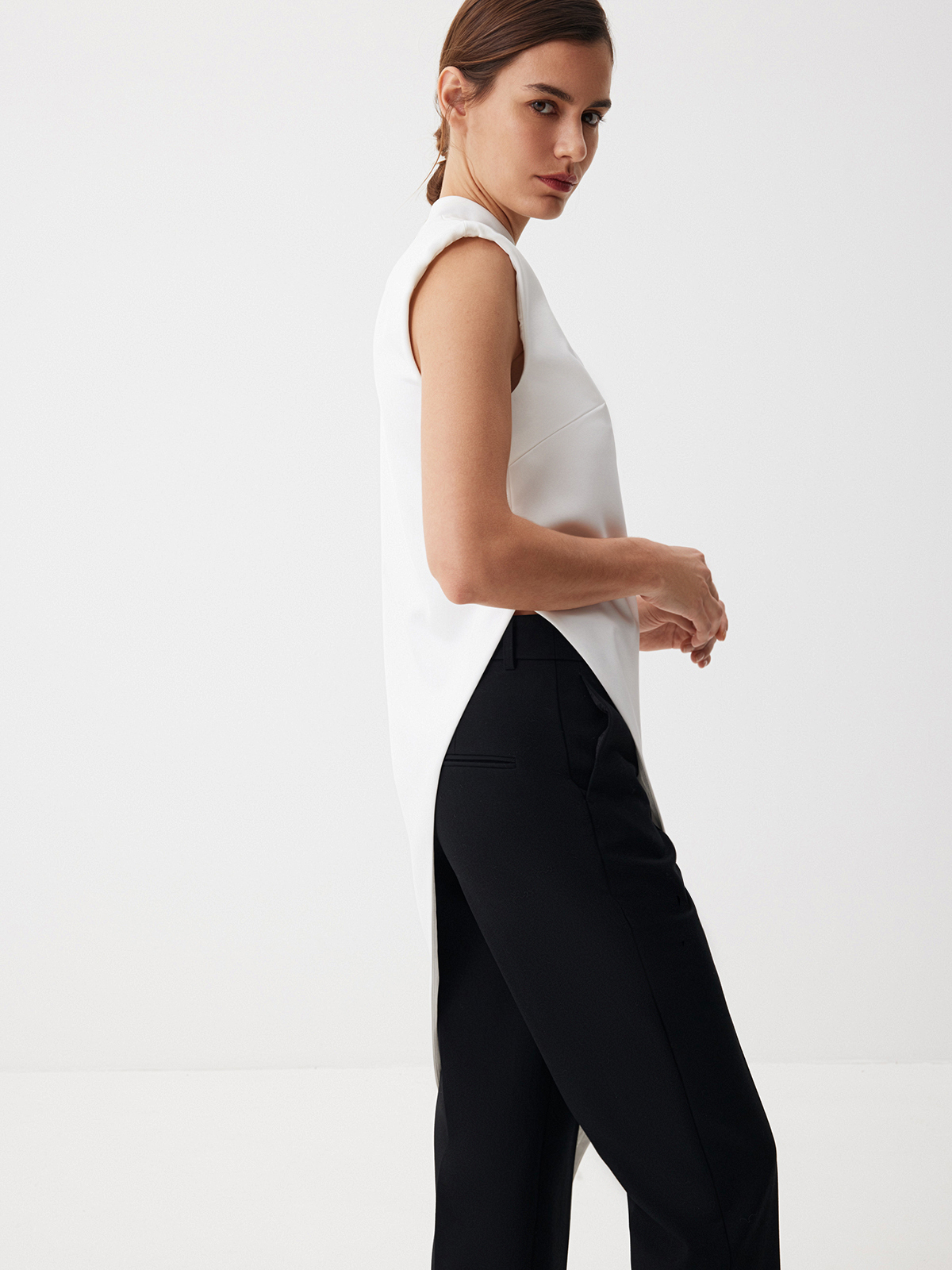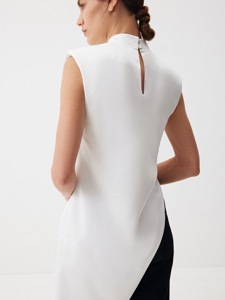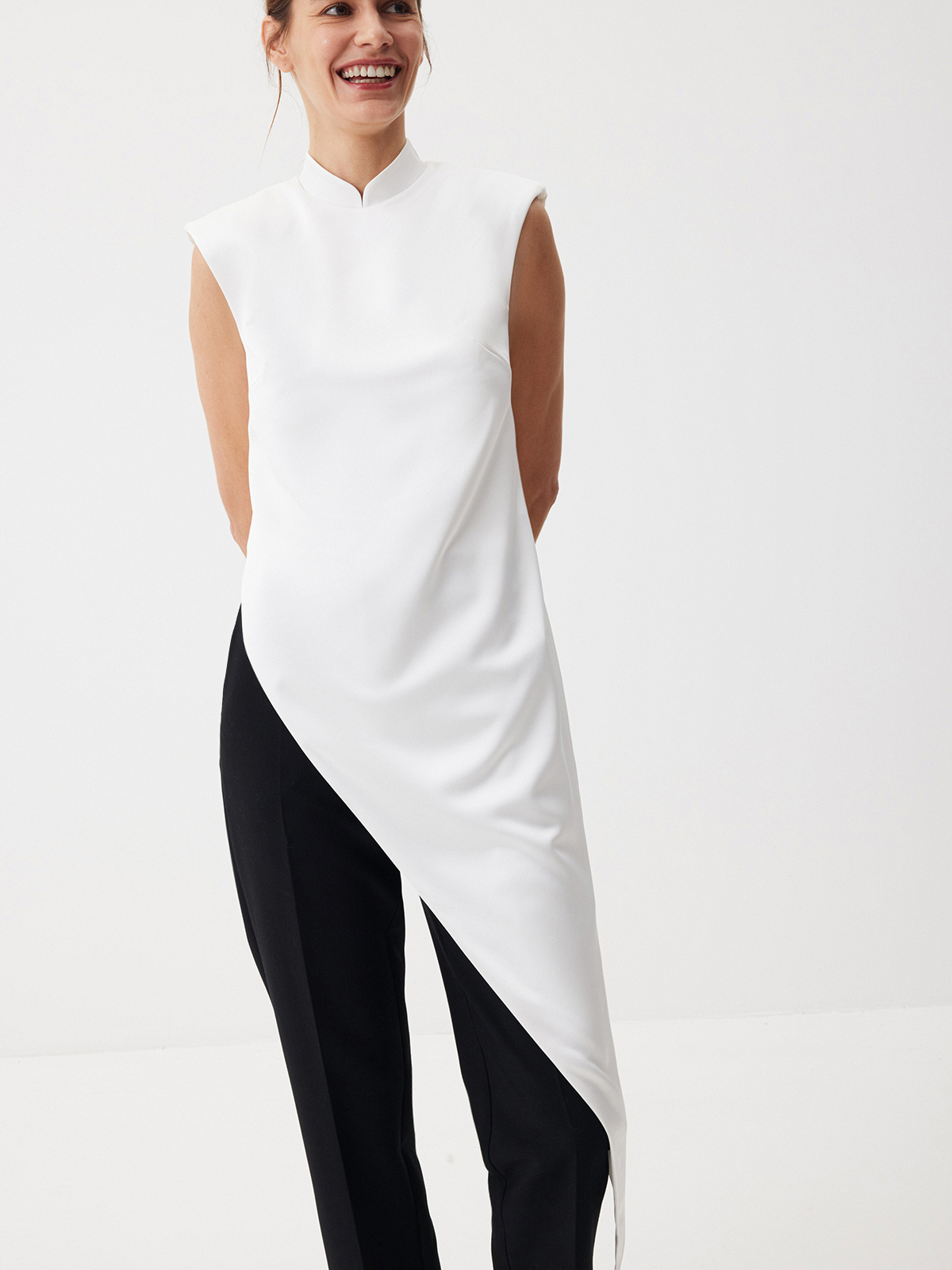 Восточные мотивы и современная эстетика гармонично соединились в топе Crystal White. Графичная модель с деликатным атласным блеском станет акцентом вашей вечерней капсулы благодаря эффектным деталям: воротнику мао, четкой линии плеч и асимметричному крою. Комбинируем с лаконичными брюками Tailoring для элегантного ахроматического дуэта.