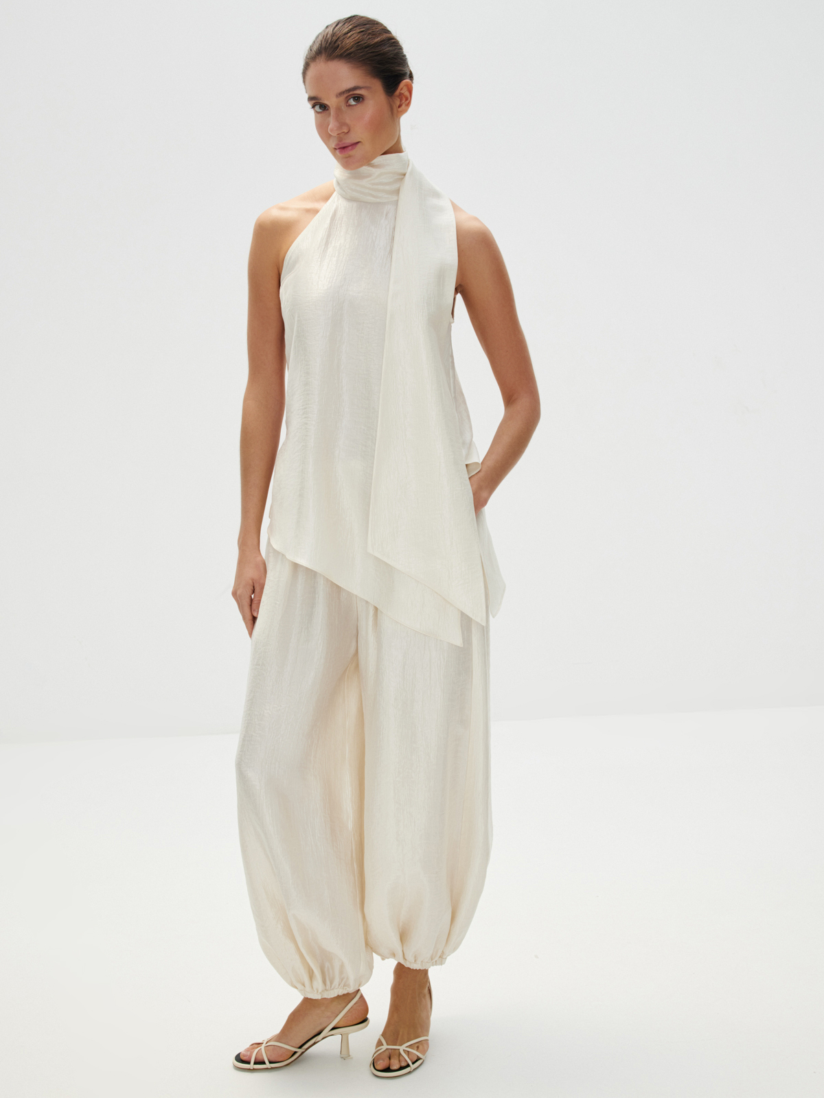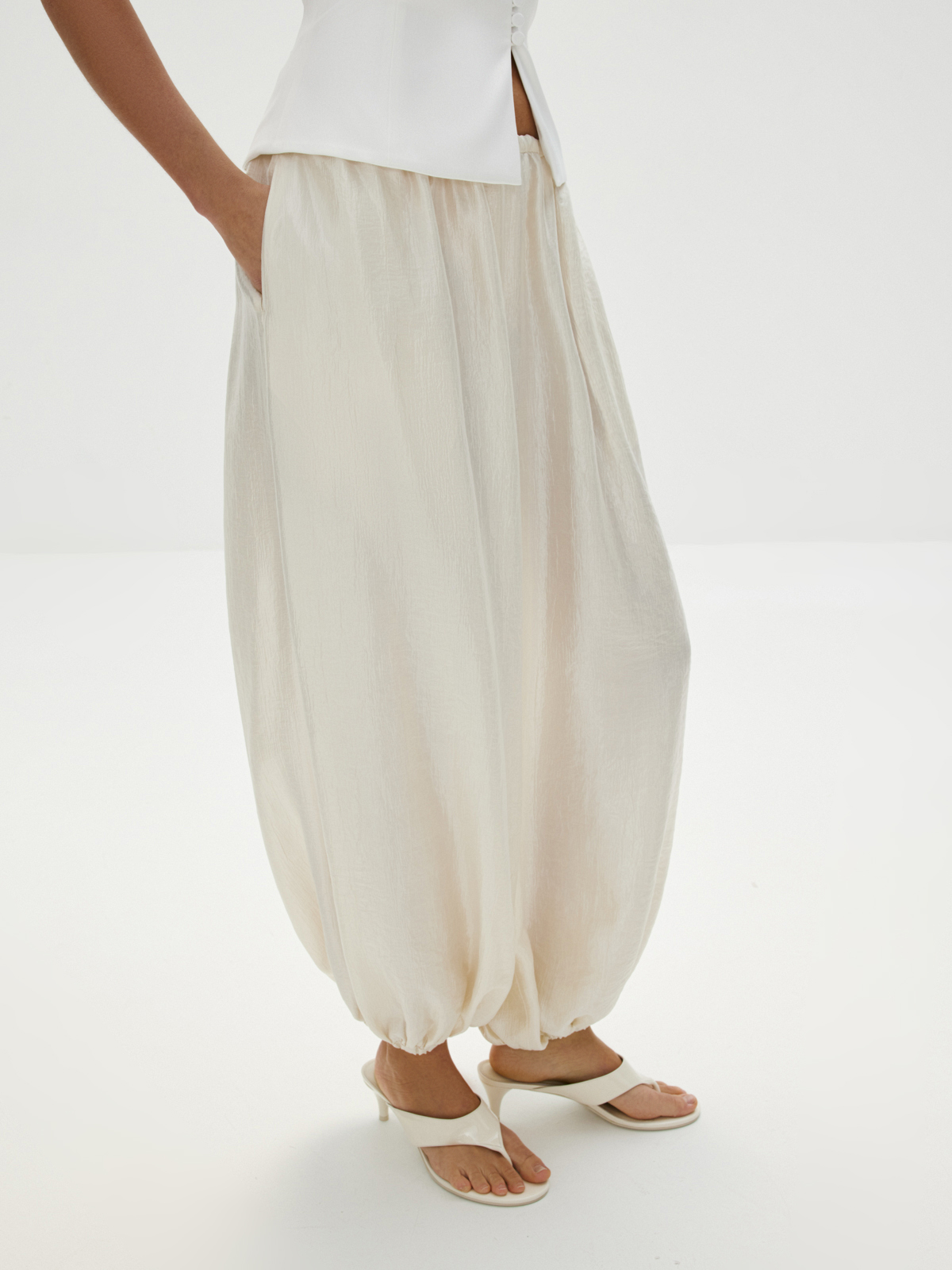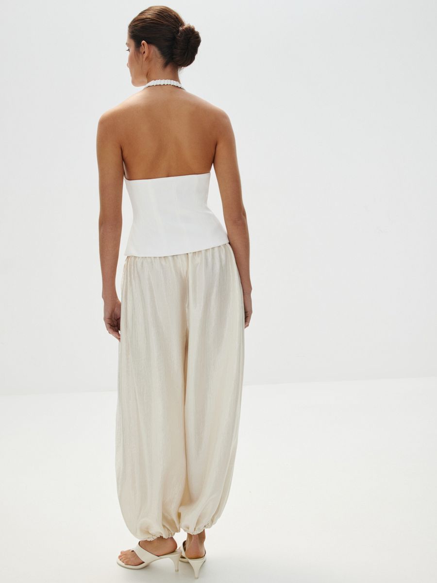 Воздушные брюки «Жасмин» — для танцев до утра и самых счастливых моментов, которые захочется сохранить в памяти навсегда. Объемный крой с манжетами по низу, создающий легкий и подвижный силуэт, структурная ткань с характерным атласным блеском — каждая деталь продумана, чтобы вы чувствовали себя главной героиней собственной романтичной истории. Безупречны в сете с блузой «Прима» — вдохновляюще красивом и фееричном.