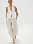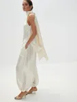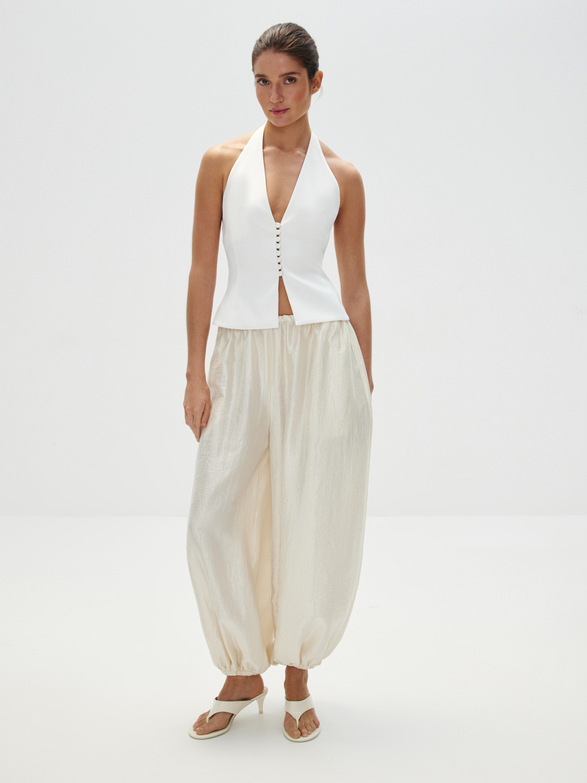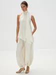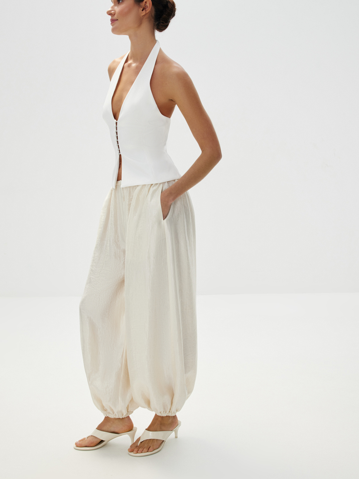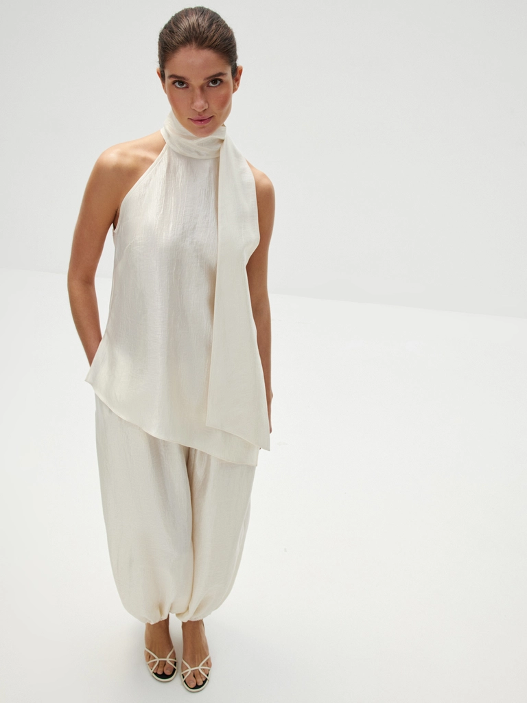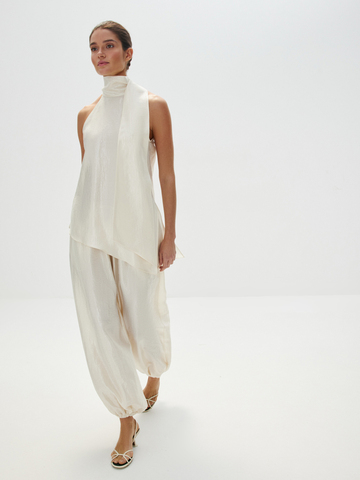 Воздушные брюки «Жасмин» — для танцев до утра и самых счастливых моментов, которые захочется сохранить в памяти навсегда. Объемный крой с манжетами по низу, создающий легкий и подвижный силуэт, структурная ткань с характерным атласным блеском — каждая деталь продумана, чтобы вы чувствовали себя главной героиней собственной романтичной истории. Безупречны в сете с блузой «Прима» — вдохновляюще красивом и фееричном.