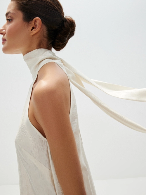 Объемный крой со слегка заниженной талией. Эластичный пояс на кулиске, которая дает возможность отрегулировать посадку. Эластичные манжеты по низу. Фактурная атласная ткань. Без подкладки.