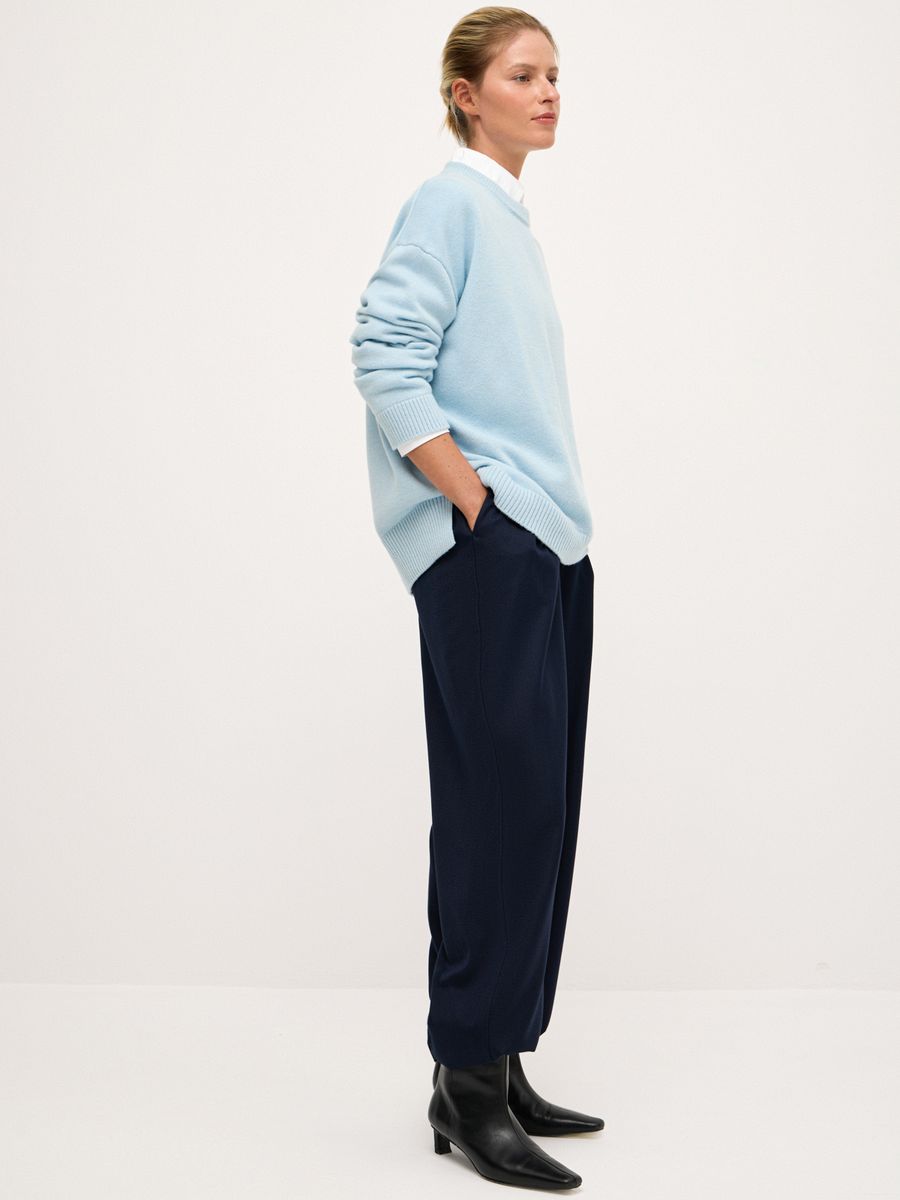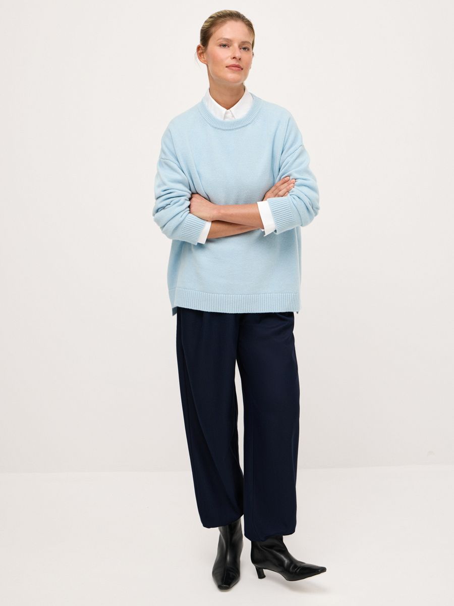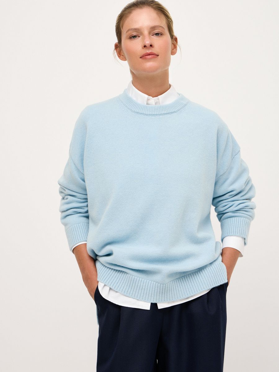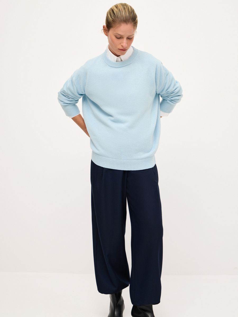 Перфекционизм в каждой детали — базовый джемпер Cashmere Blend. Тот самый айтем, который будет восхищать качеством и вдохновлять на свежие стилизации в холодном сезоне. Роскошь шелка, шерсти мериноса, кашемира и неизменная актуальность лаконичного силуэта становятся символом того, как идеально подобранный джемпер может говорить о любви к себе. Создаем безупречный casual аутфит, сочетая нежно-голубой джемпер с идеальными палаццо Classy Blue в глубоком синем оттенке.