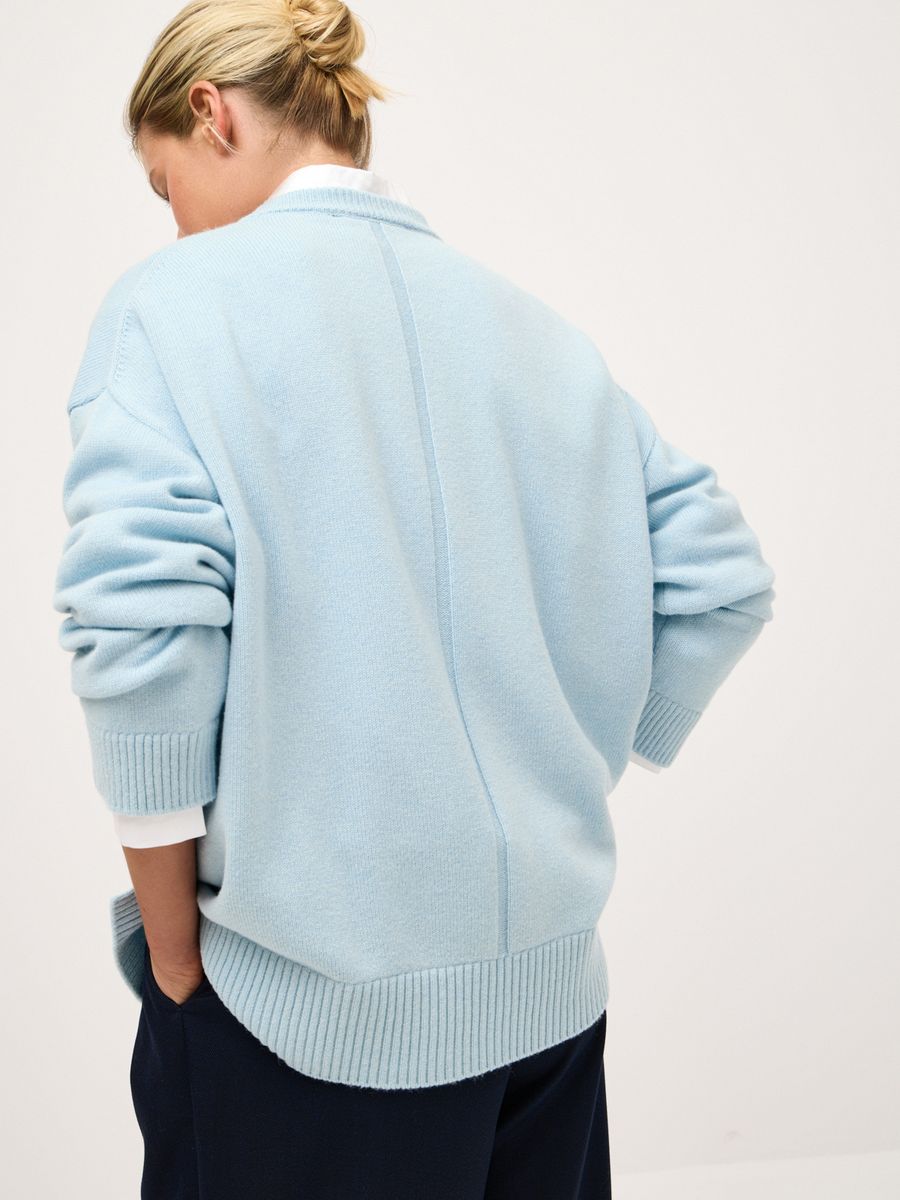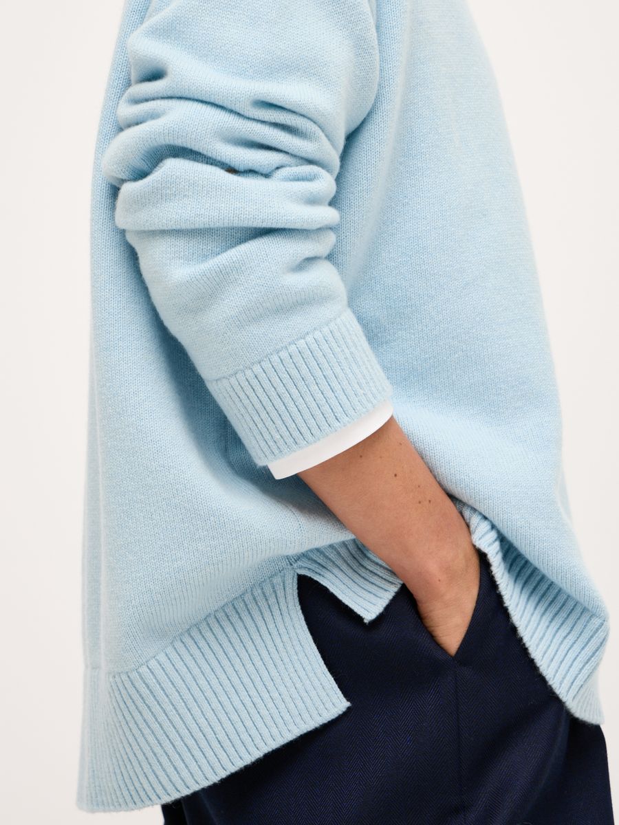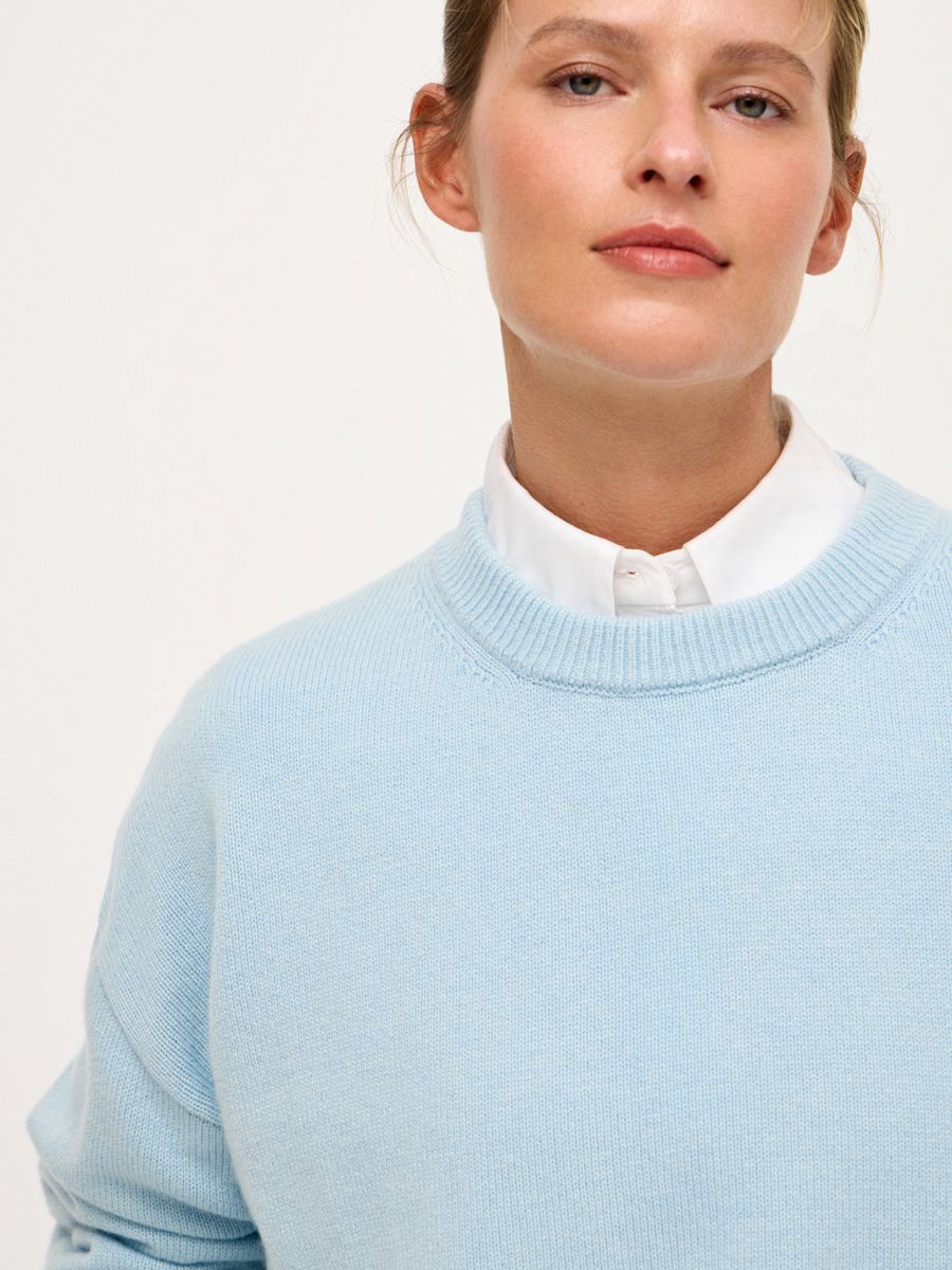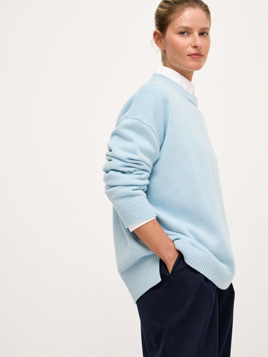 Перфекционизм в каждой детали — базовый джемпер Cashmere Blend. Тот самый айтем, который будет восхищать качеством и вдохновлять на свежие стилизации в холодном сезоне. Роскошь шелка, шерсти мериноса, кашемира и неизменная актуальность лаконичного силуэта становятся символом того, как идеально подобранный джемпер может говорить о любви к себе. Создаем безупречный casual аутфит, сочетая нежно-голубой джемпер с идеальными палаццо Classy Blue в глубоком синем оттенке.