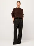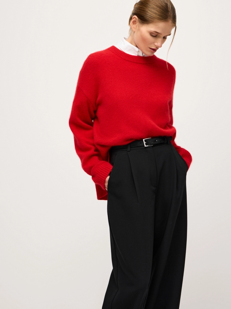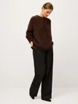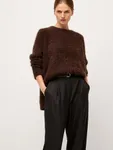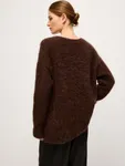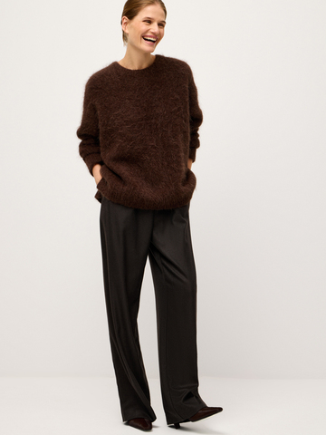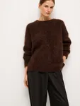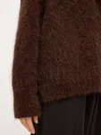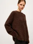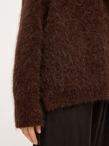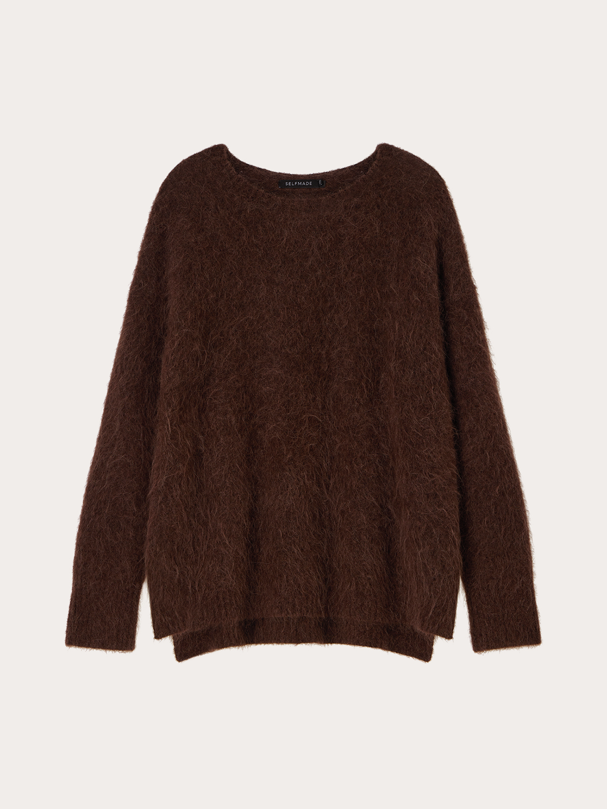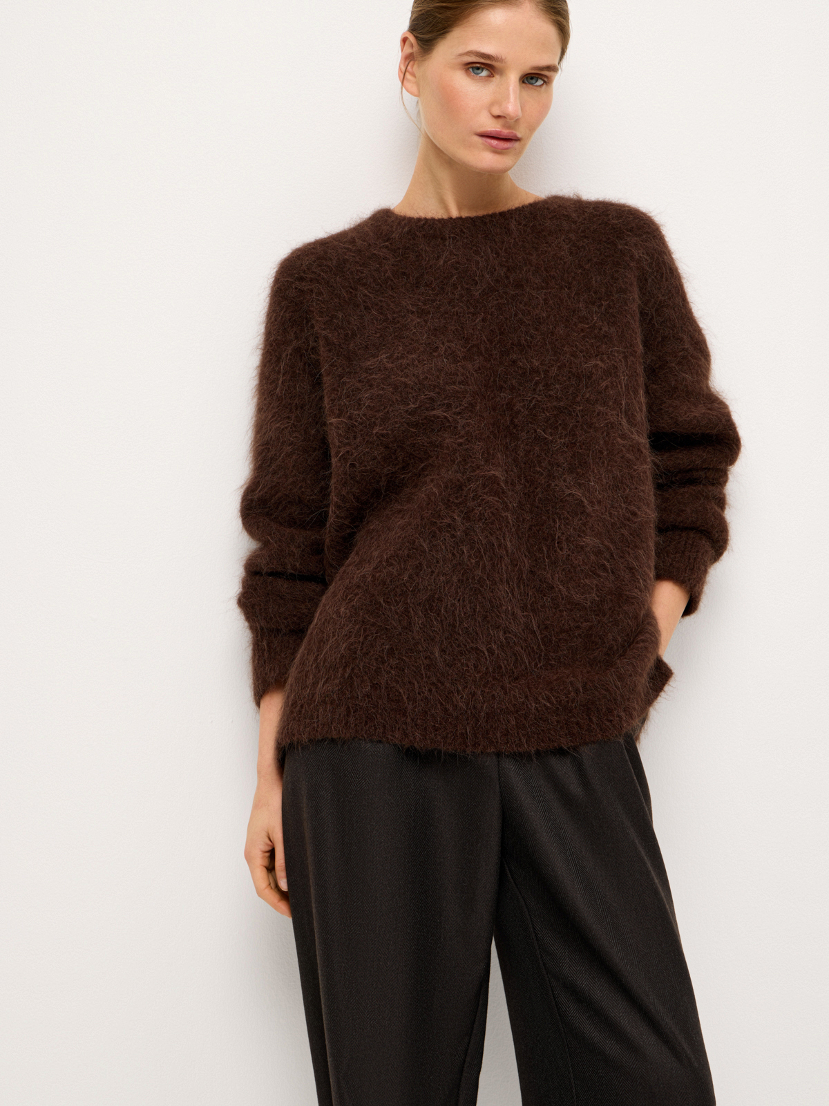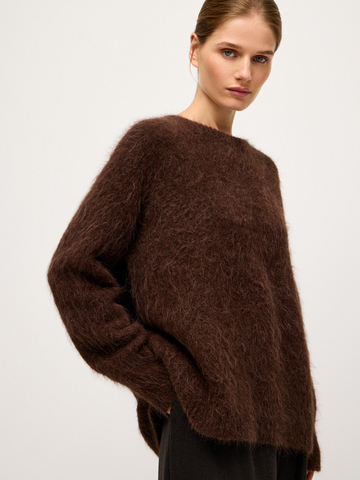 Джемпер Extra texture — эффектный выбор для ценителей выразительных осенне-зимних стилизаций. Мягчайшая шерсть альпака с объемной пушистой фактурой в роскошном шоколадном оттенке становится главным акцентом образа и идеально согревает в холодную погоду. Модель свободного кроя с удлиненной спинкой и круглым вырезом легко интегрируется в любой гардероб и образ. Собираем модный фактурный сет с шапкой и шарфом Overlayer — идеально для монохромного образа с пуховиком Glossy brown.