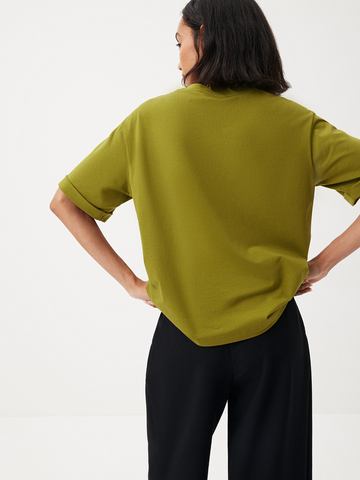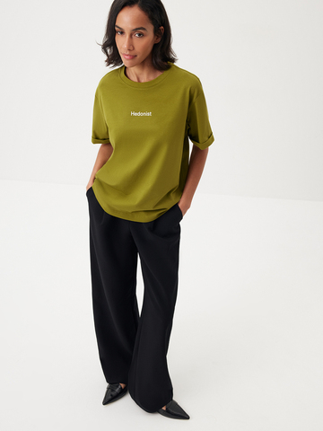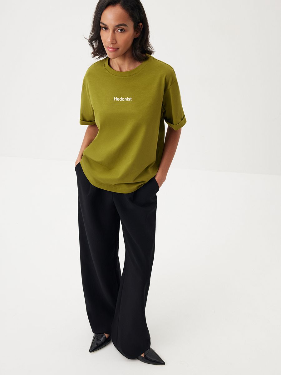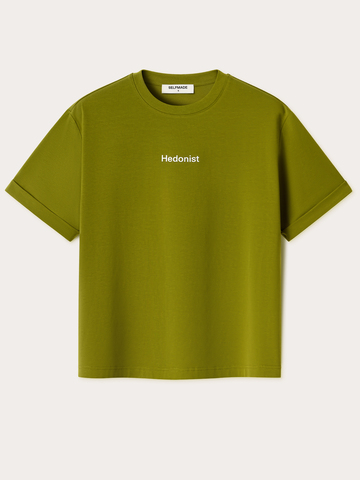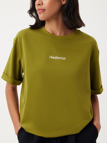 Практичная база и стильная деталь для вашего casual гардероба. При создании футболок с принтами «Diva», «Muse» и «Hedonist» мы вдохновлялись комьюнити SELF LOVE CLUB, чтобы отразить каждое из состояний, которые постоянно сменяют друг друга, но неизменно наполняют любовью к жизни. Модель с лаконичными подворотами на рукавах гармонично сочетается с любыми джинсами и брюками, а оливковый оттенок добавляет освежающий акцент. Мягкая хлопковая ткань дарит нежные прикосновения и ощущение комфорта — идеально для любых сценариев: от размеренного загородного отдыха до динамичных дней в мегаполисе. Комбинируйте с классическими палаццо Statement-Black, когда нужен простой, но безукоризненно стильный образ.