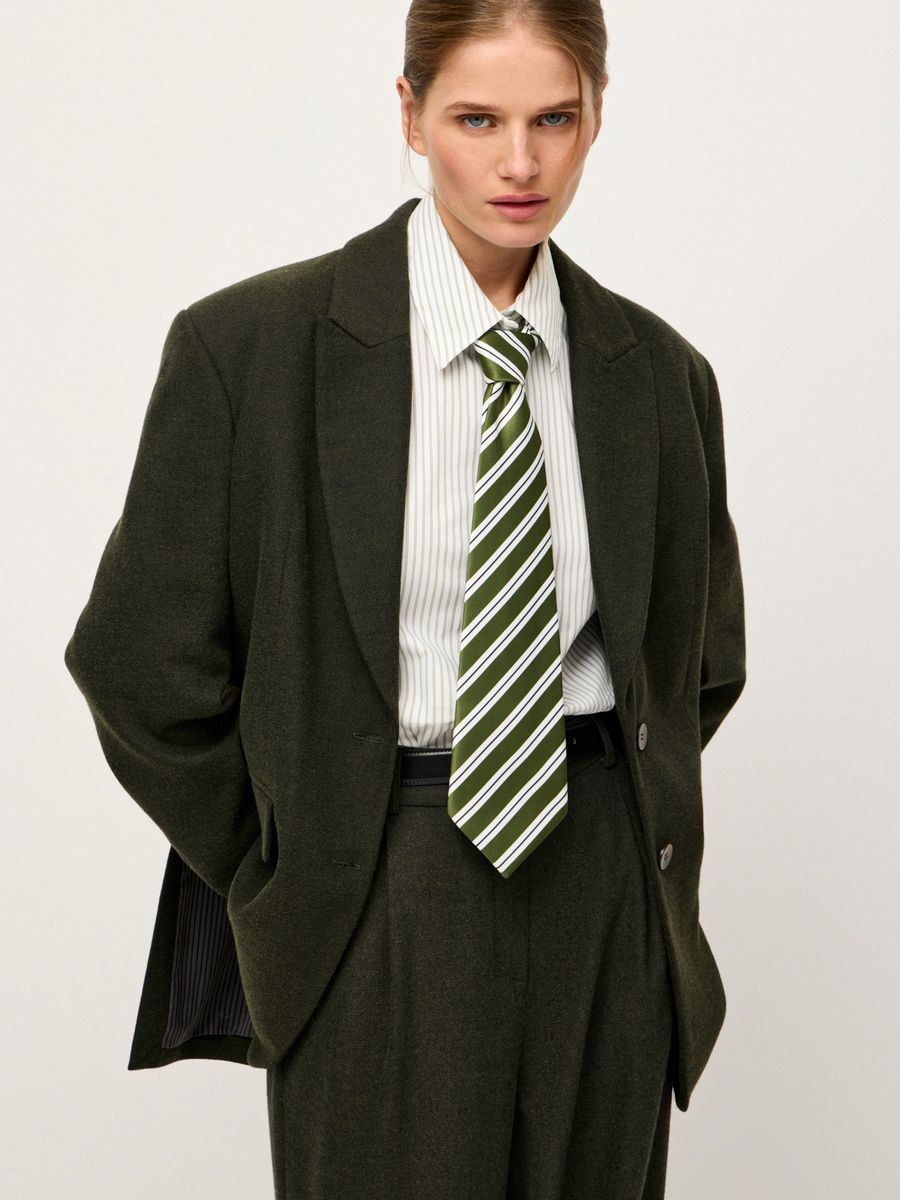 Галстук Business Ambassador — современный взгляд на женственный деловой гардероб. Классическая форма придаст образу уверенный характер, а непринужденный принт в полоску освежит любую строгую стилизацию. Насыщенный зеленый оттенок идеально вписывается в осеннюю гамму, позволяя легко интегрировать айтем в повседневные комбинации. Носим в смелом монохромном сете с костюмом Wall Street и рубашкой Back To Work или меняем жакет на объемный джемпер Merino Essential, оставляя галстук лаконичным акцентом в эстетике преппи.