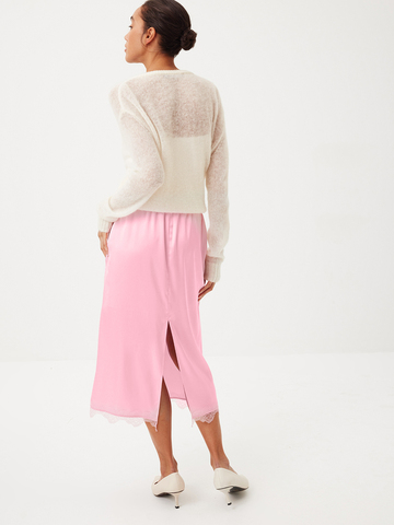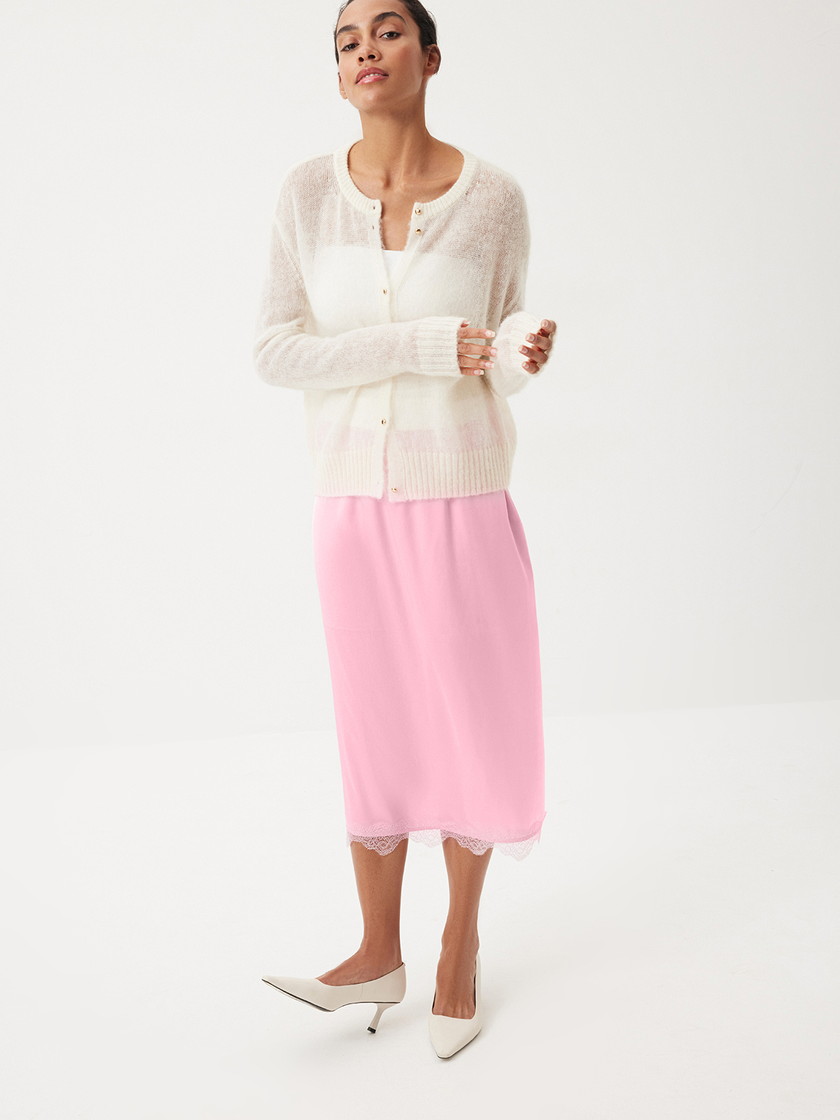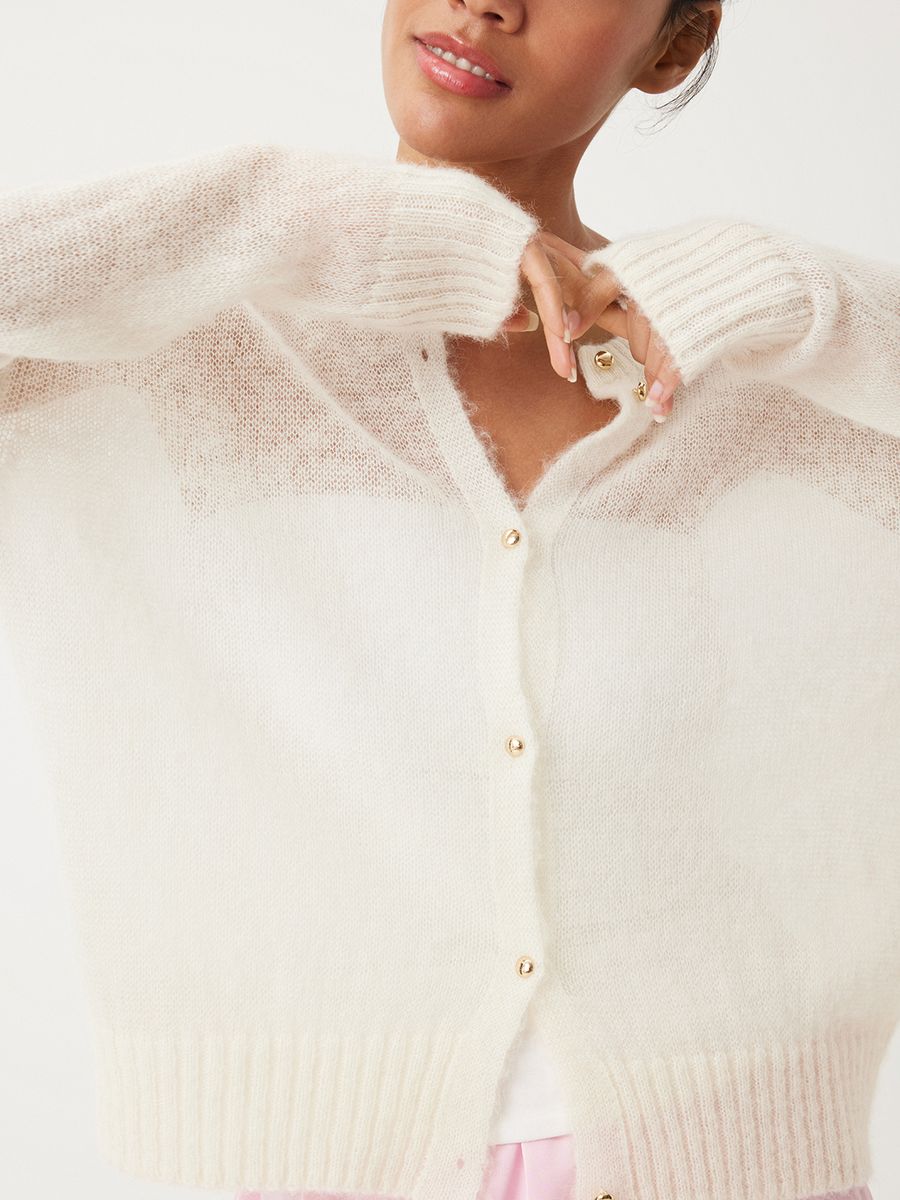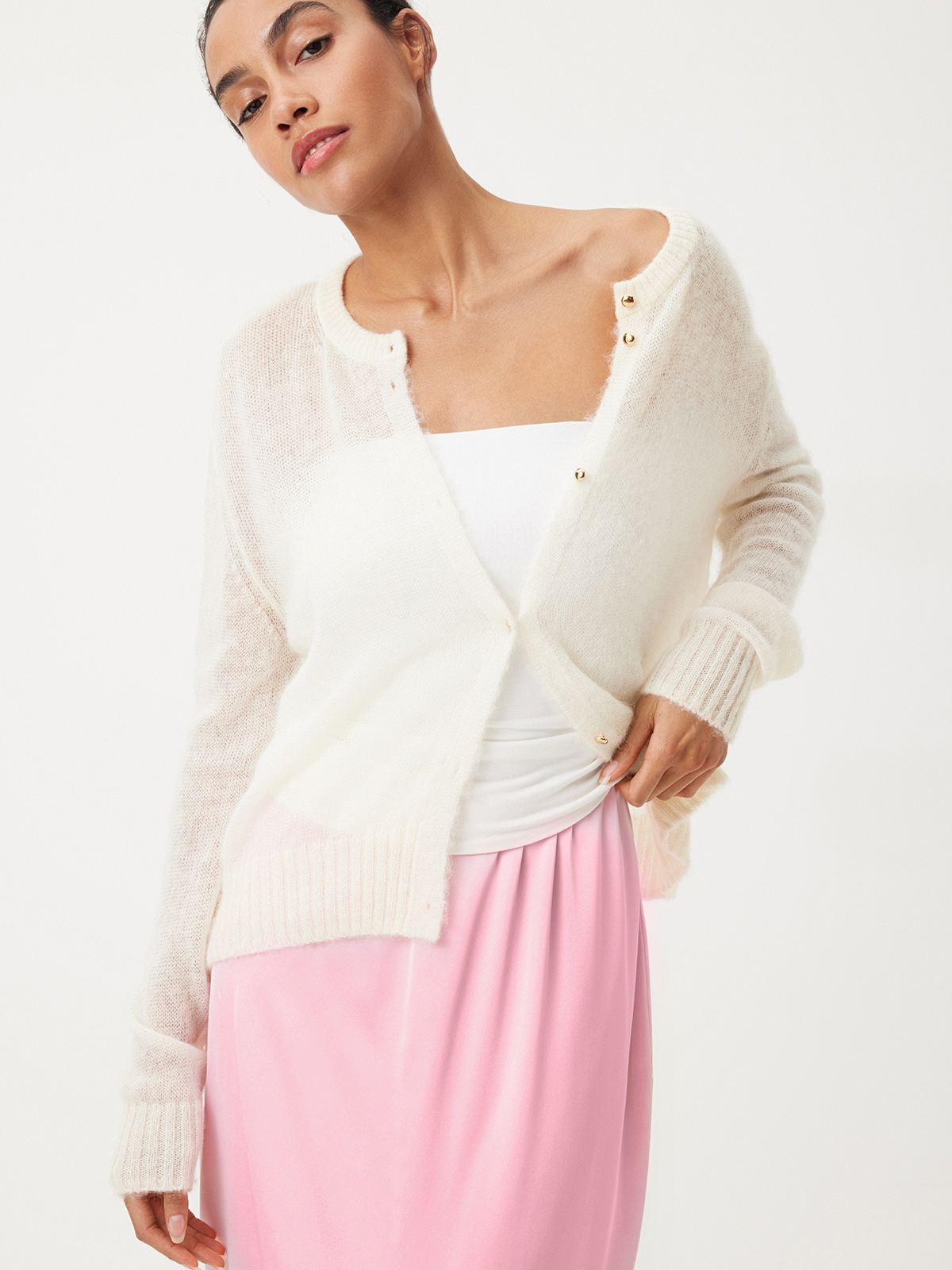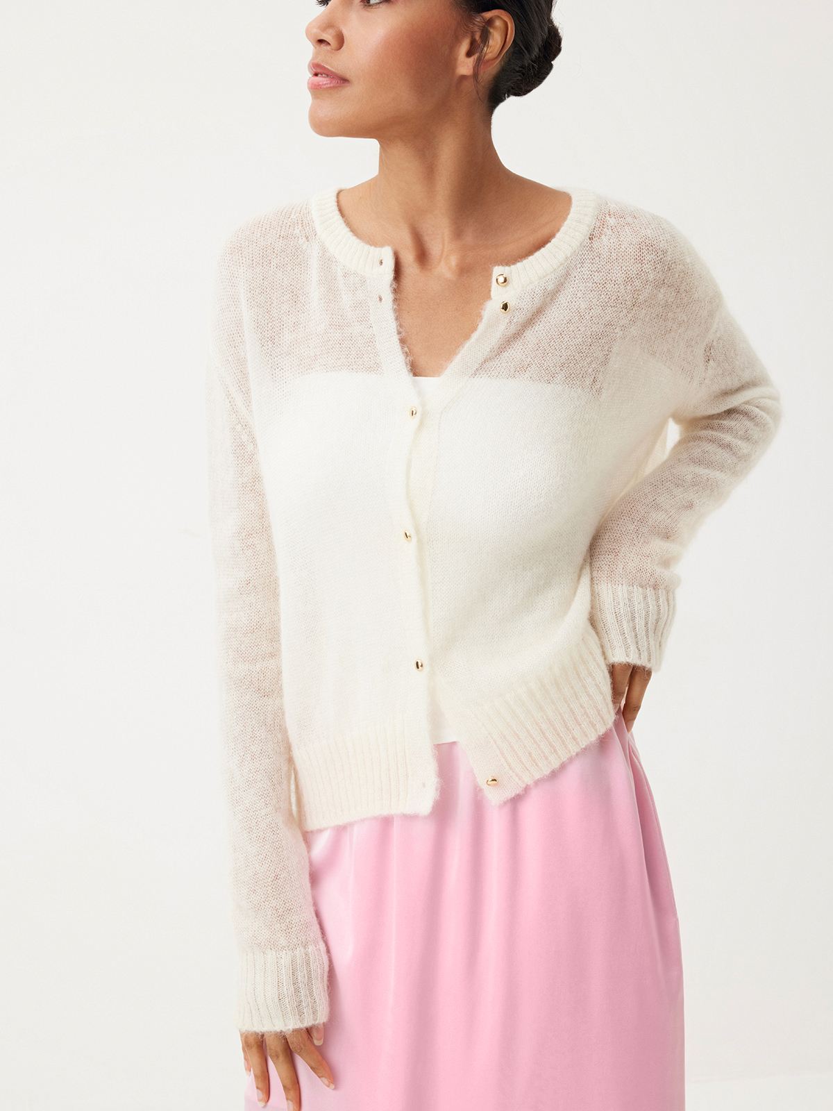 Кардиган Wool Mix в нежном молочном оттенке — изделие с мягким характером, идеальное для зимнего гардероба и прохладных весенних дней. Полупрозрачная текстура, состав с высоким содержанием шерсти, воздушная вязка и деликатный объем делают его одновременно уютным и изысканным. Небольшие золотистые пуговицы добавляют изящный акцент — достаточно, чтобы образ выглядел выразительно и слегка игриво. Носите с бра или сочетайте с базовыми топами и водолазками в многослойных стилизациях — он легко адаптируется под любой выбор и настроение. Чтобы добавить нотку романтичности, комбинируйте с юбкой в бельевом стиле Rosy.