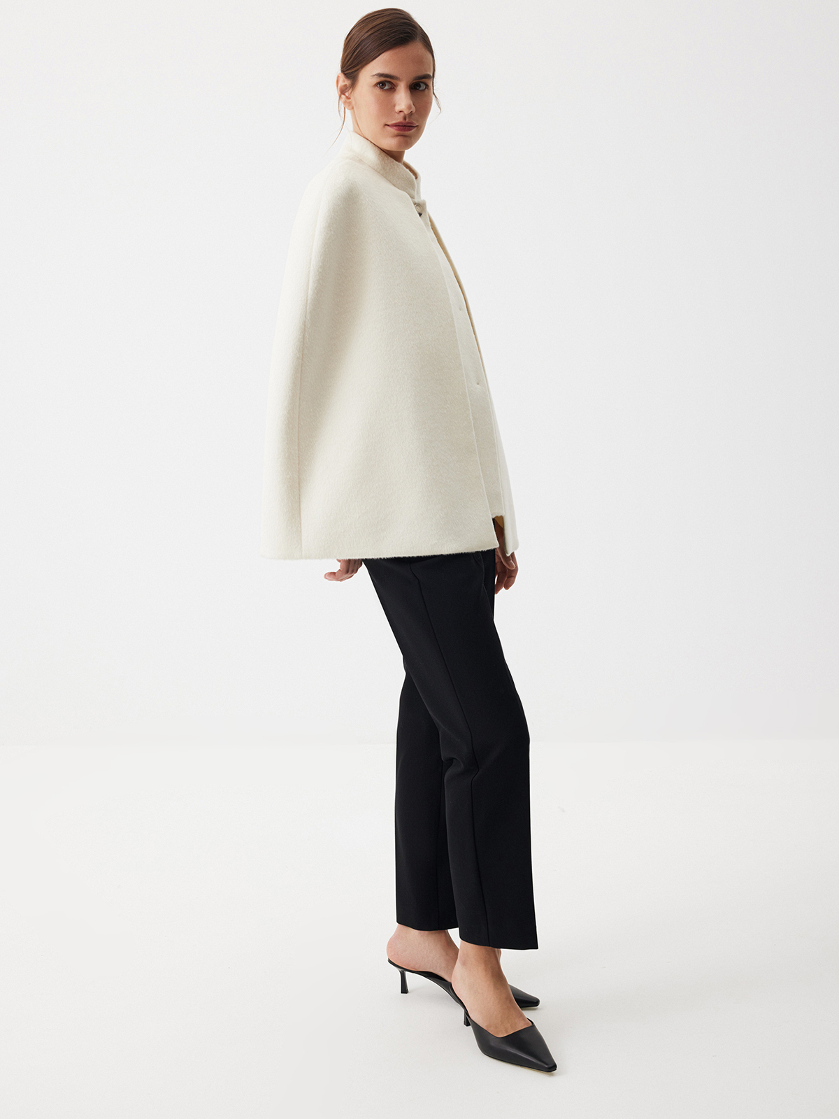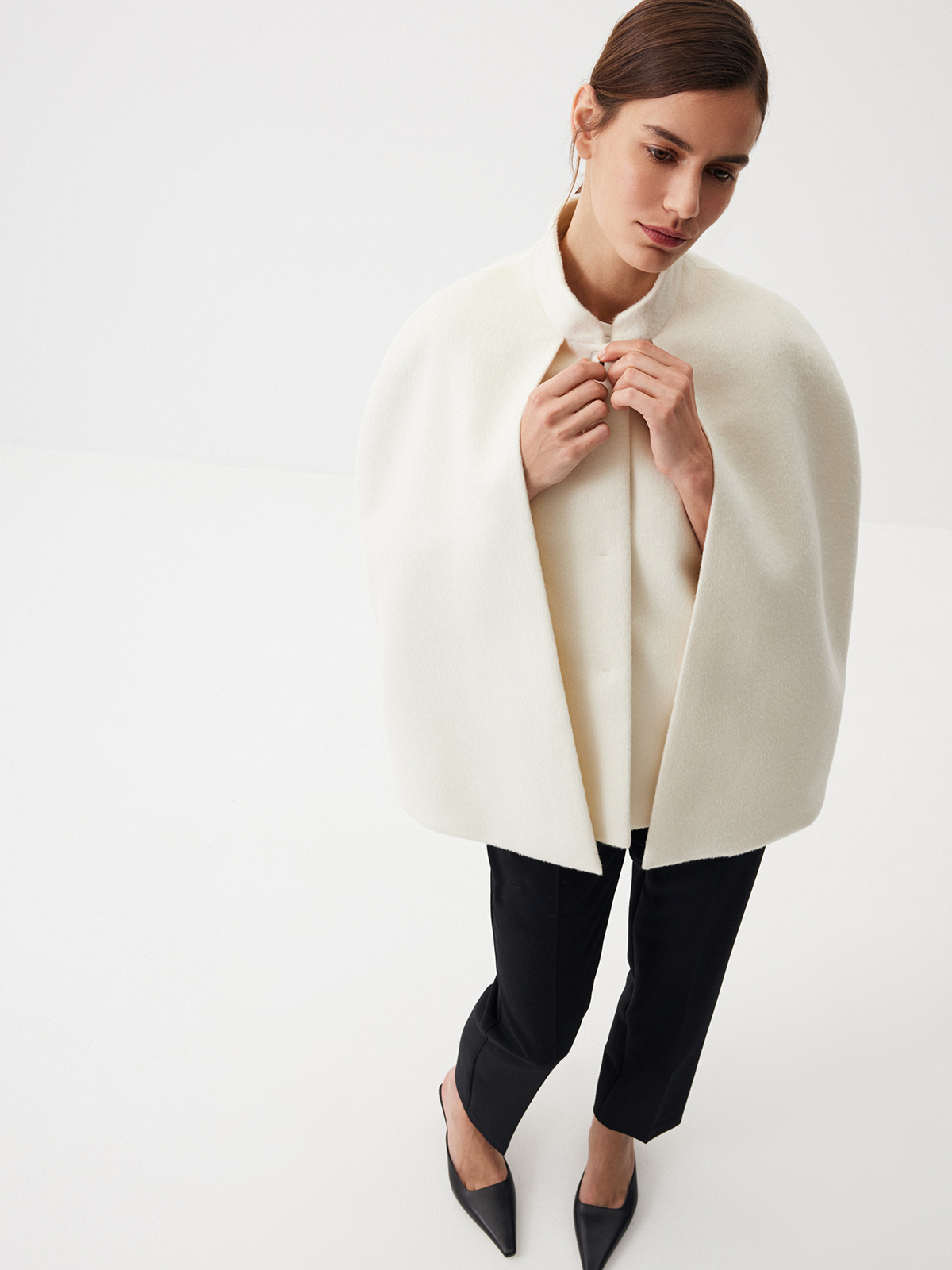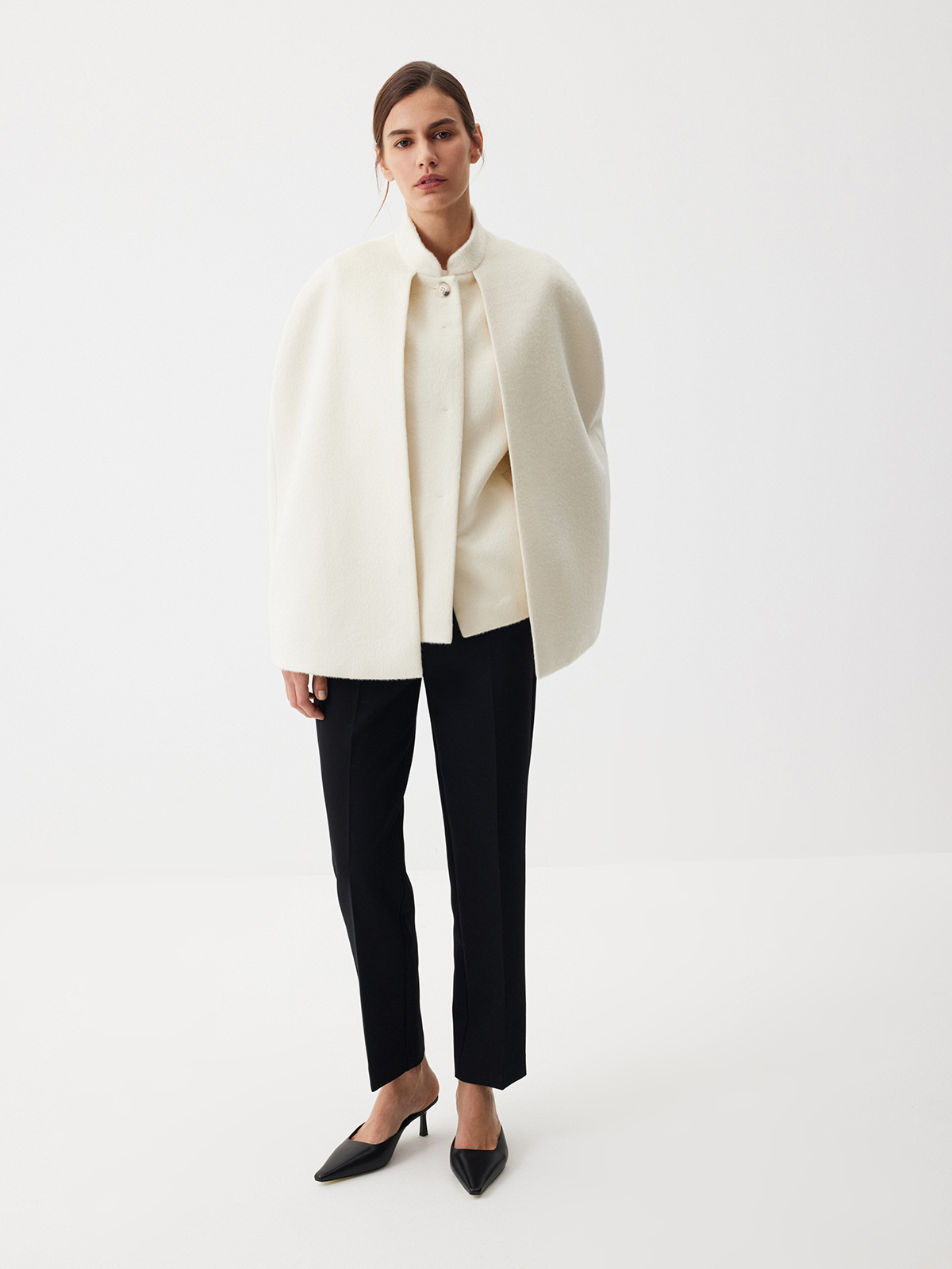 Роскошный кейп Grand Opening — для тех, кто готовится встречать новый сезон торжественно и элегантно. В основе изделия — жилет, чтобы вы чувствовали себя комфортно в прохладную погоду. Каждая деталь здесь продумана, чтобы сформировать утонченный минималистичный стиль: воротник-стойка, аккуратная планка на пуговицах, карманы с листочками и две шлицы сзади, благодаря которым кейп выглядит особенно выразительно в динамике. Ткань с мягким ворсом из шерсти и вискозы идеально подходит для межсезонья — регулируйте уровень тепла, сочетая модель с джемперами или тонкими лонгсливами. Создаем современный образ в эстетике Ladylike с лаконичными брюками Tailoring и изящными лодочками.
