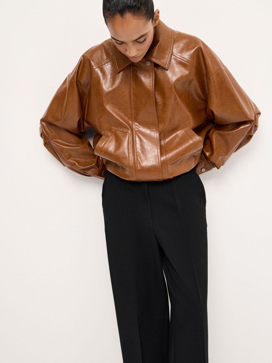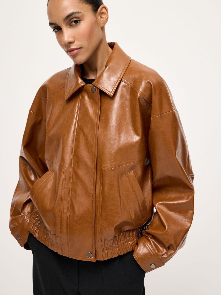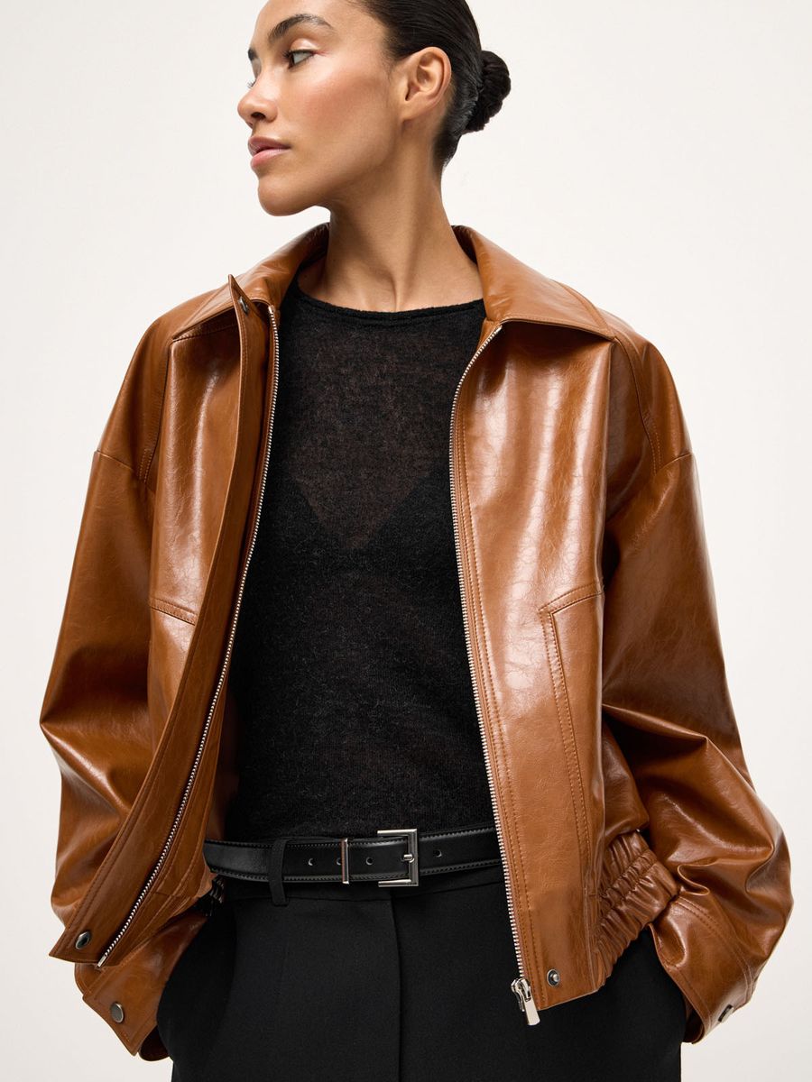 Лакированный бомбер Unique Muse — особенная модель для осеннего сезона, превращающий любой базовый образ в extra модное сочетание. Объемный крой дополнен эффектными деталями в ретро-эстетике: спущенной линией плеч, широкой планкой и акцентной резинкой по низу. Глянцевая фактура и привлекательный карамельный оттенок делают модель тем самым statement-предметом гардероба, в котором вы чувствуете себя собой — яркой, дерзкой и уникальной. Подчеркиваем выразительность модели сочетанием с классическим монохромным сетом из джемпера Black Olive и брюк-palazzo Statement-Black