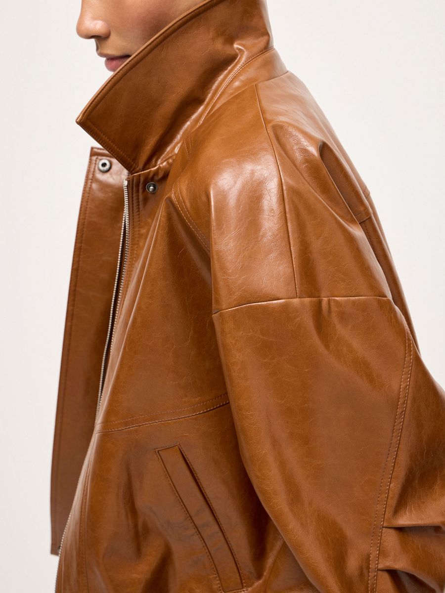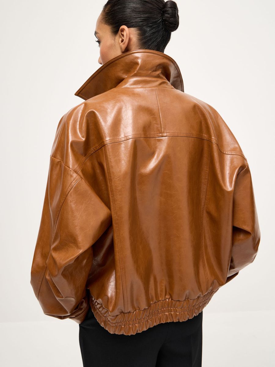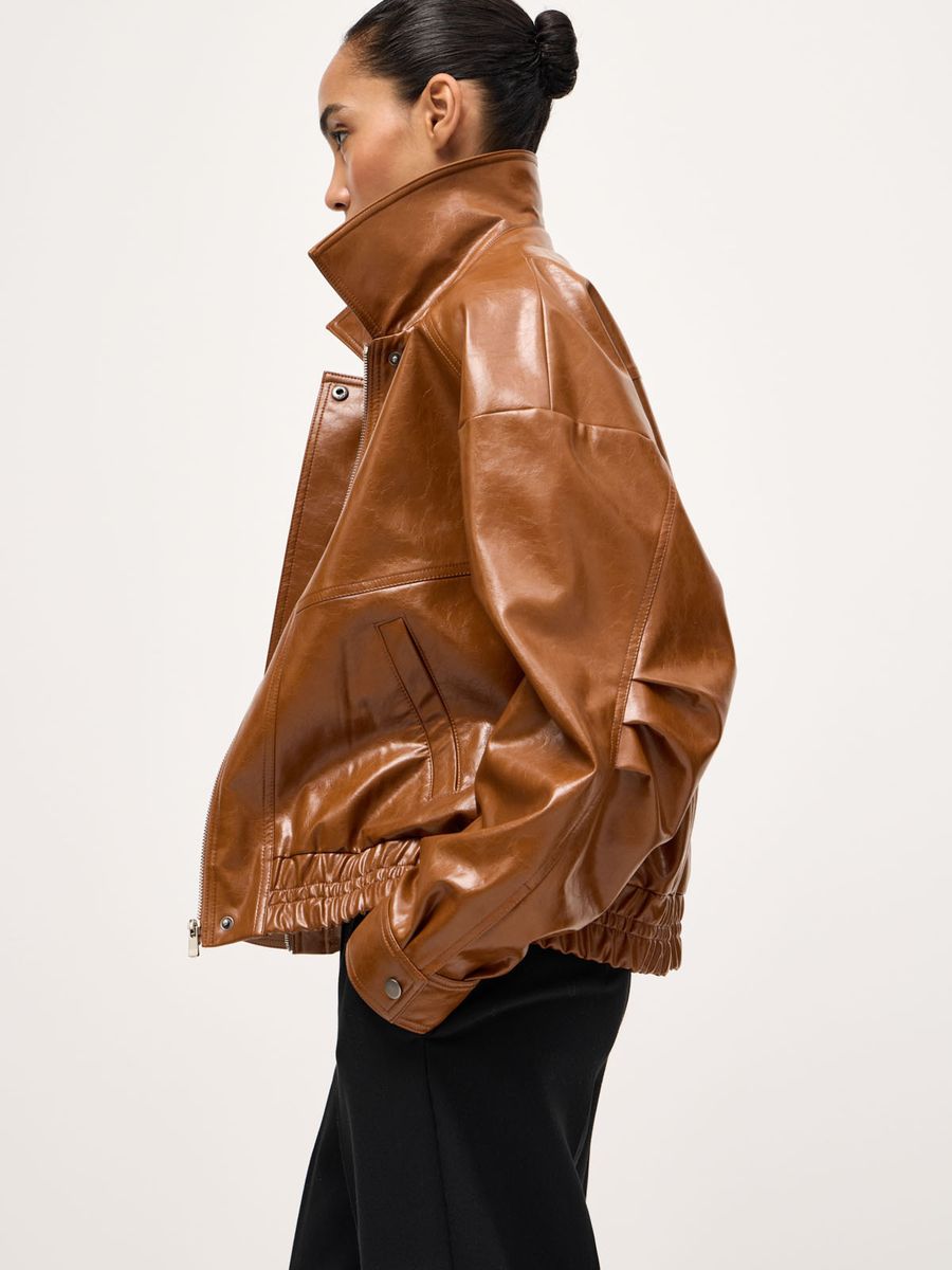 Лакированный бомбер Unique Muse — особенная модель для осеннего сезона, превращающий любой базовый образ в extra модное сочетание. Объемный крой дополнен эффектными деталями в ретро-эстетике: спущенной линией плеч, широкой планкой и акцентной резинкой по низу. Глянцевая фактура и привлекательный карамельный оттенок делают модель тем самым statement-предметом гардероба, в котором вы чувствуете себя собой — яркой, дерзкой и уникальной. Подчеркиваем выразительность модели сочетанием с классическим монохромным сетом из джемпера Black Olive и брюк-palazzo Statement-Black