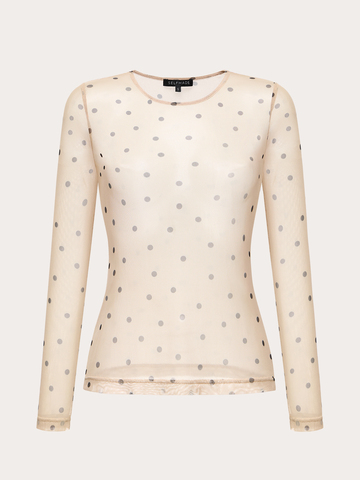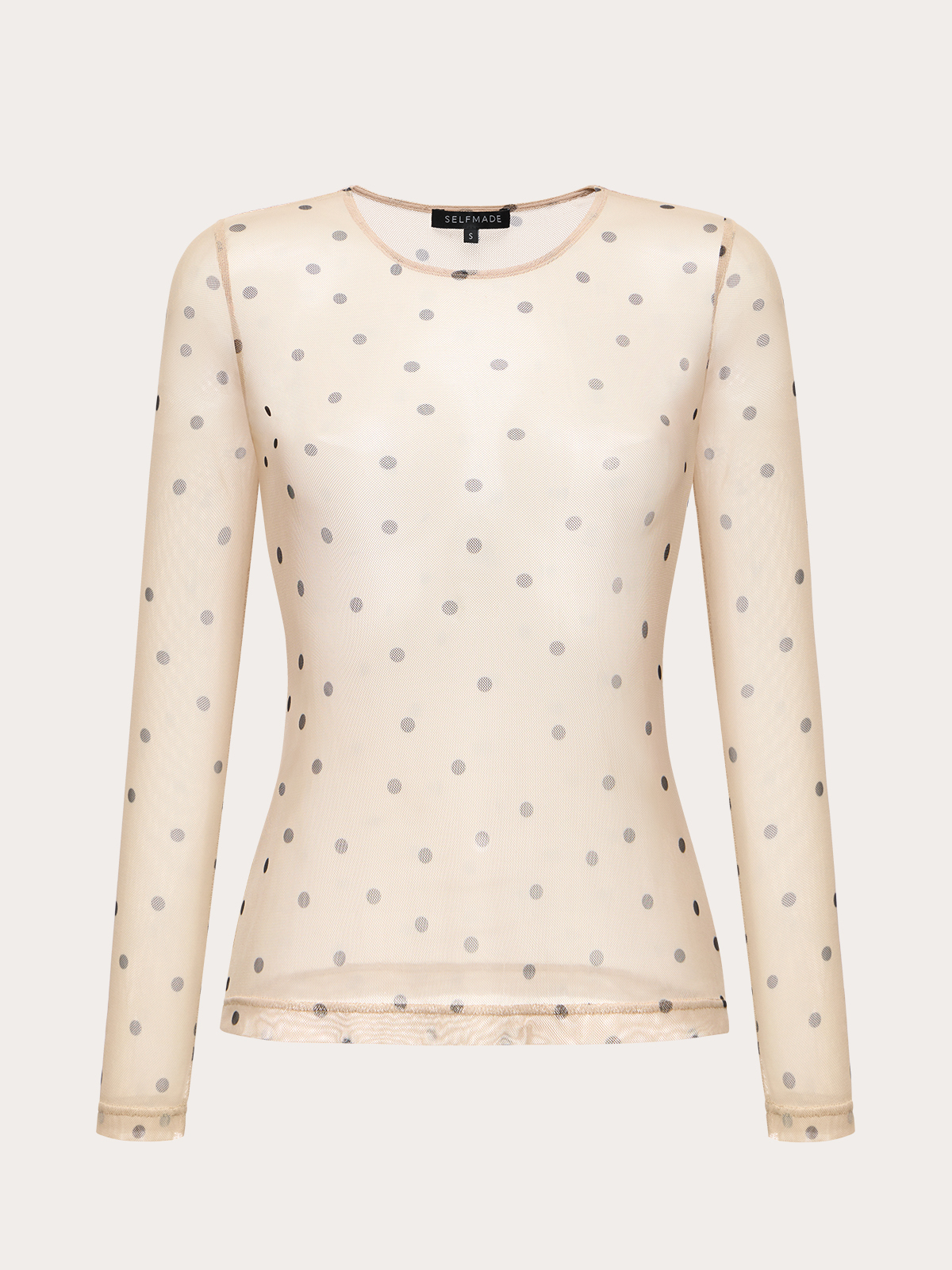 Полупрозрачный лонгслив Polka Dots — изысканная женственность с игривым характером. Модель универсального оттенка с принтом в горошек сочетает главные тренды этого года, но благодаря лаконичной форме будет радовать своей утонченной красотой не один сезон. Сетчатая невесомая ткань смотрится на коже легкой вуалью и создает притягательный эффект. Носим соло в бескомпромиссном сете с классическими палаццо для смелого выхода или добавляем строгий жакет для выразительного контраста.