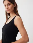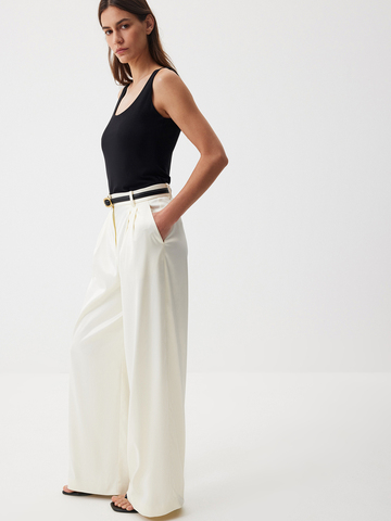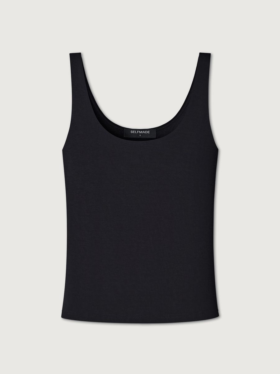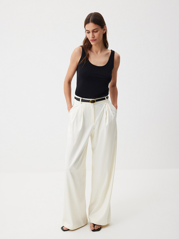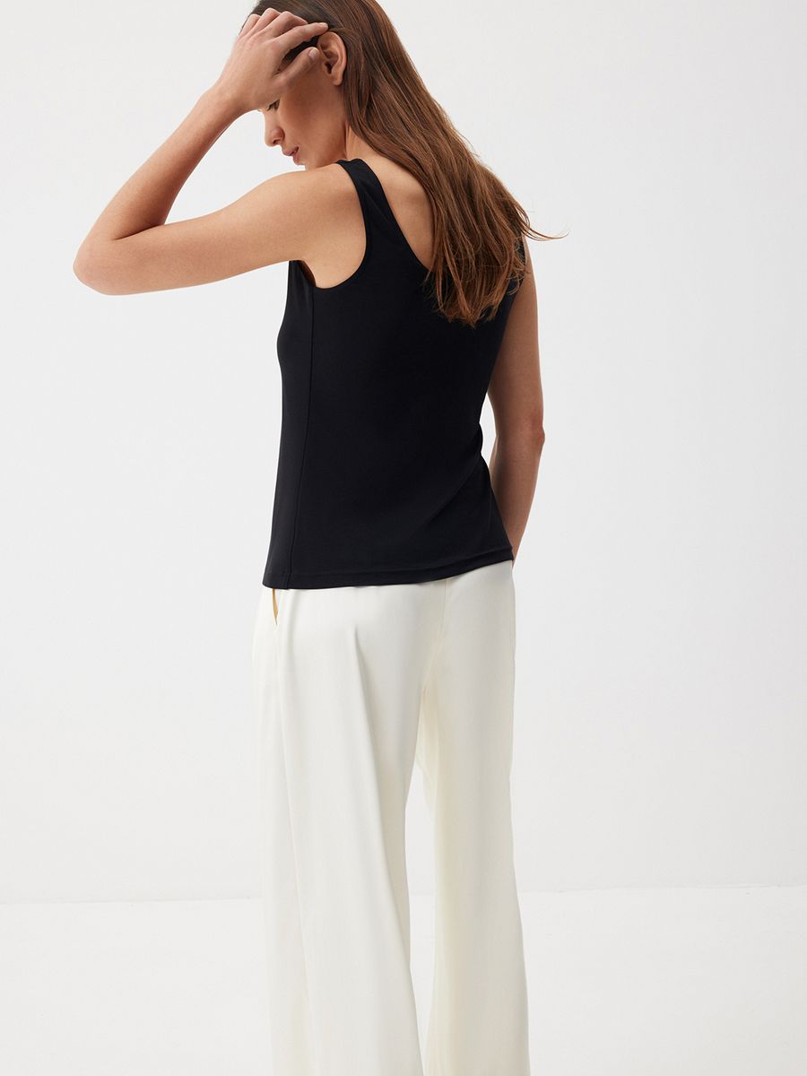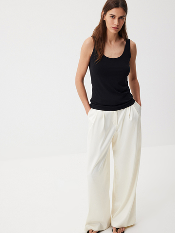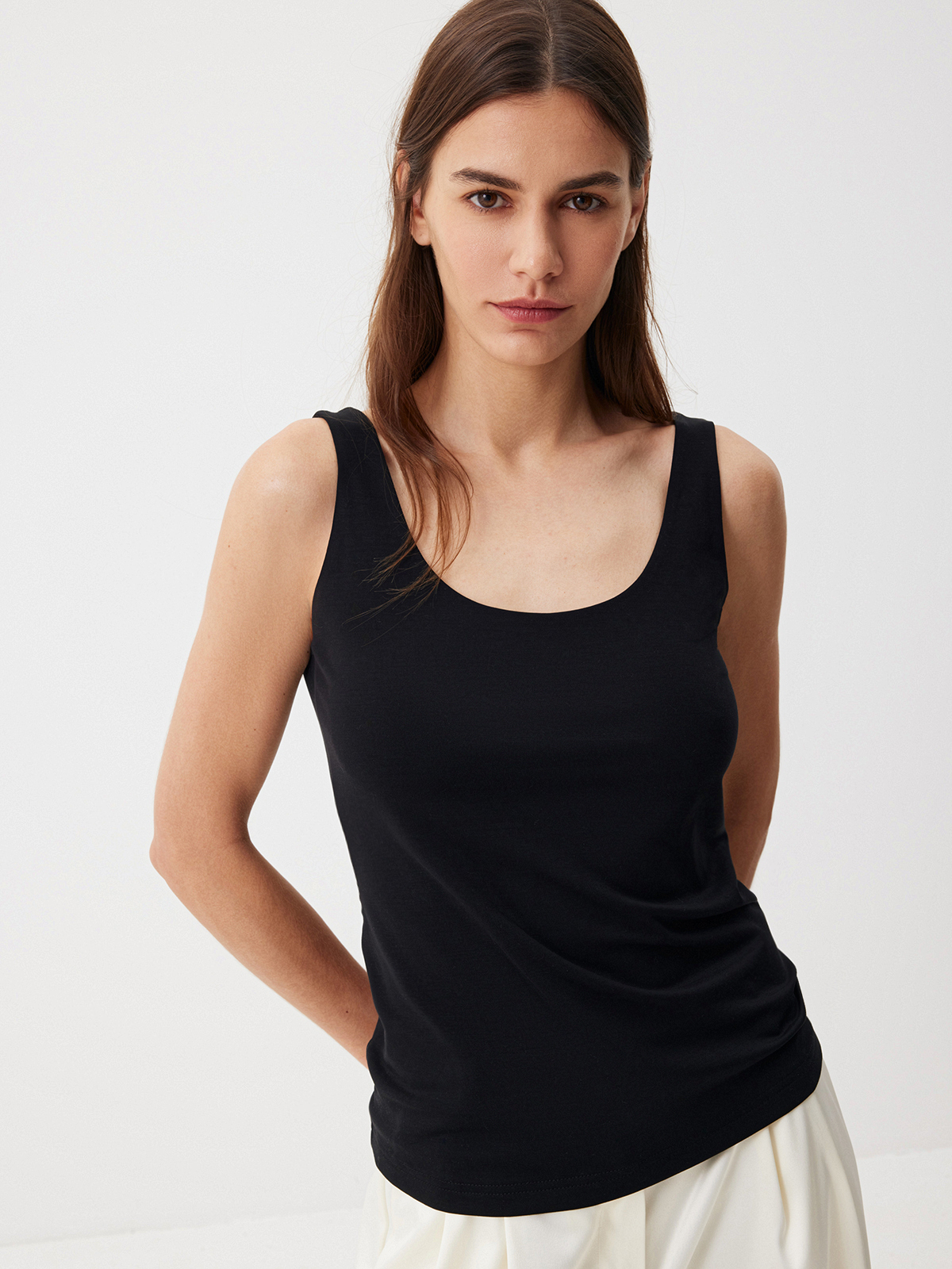 Топ Smoky Black — изделие, которое выручит в любой ситуации. Модель лаконичного кроя из нежного модала станет вашей любимой базой. Надеваем его под классические жакеты, рубашки и мягкие кардиганы или носим соло в стиле роскошного минимализма. Запоминаем формулу изысканного повседневного образа: топ с глубоким вырезом и классические брюки с сатиновым блеском Eastern muse.