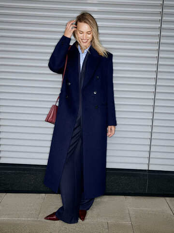 Изысканное statement-пальто в цвете midnight blue дарит возможность по-новому взглянуть на осенний гардероб. Глубокий оттенок полуночного неба вдохновляет на создание свежих комбинаций и добавляет нотку романтичной таинственности. Четкая линия плеч, заостренные лацканы и классическая двубортная застежка придают образу строгости и делового шика. Длина midaxi и материал с высоким содержанием шерсти делают модель фундаментальной базой для холодного сезона. Вдохновляемся эстетикой 80-х и носим пальто с уверенным комбо из рубашки office day, акцентного жакета и брюк-palazzo в оттенке classy blue. Завершающий штрих — галстук в тон.