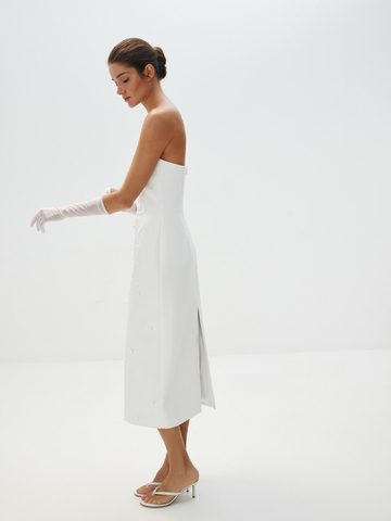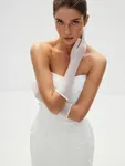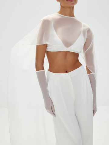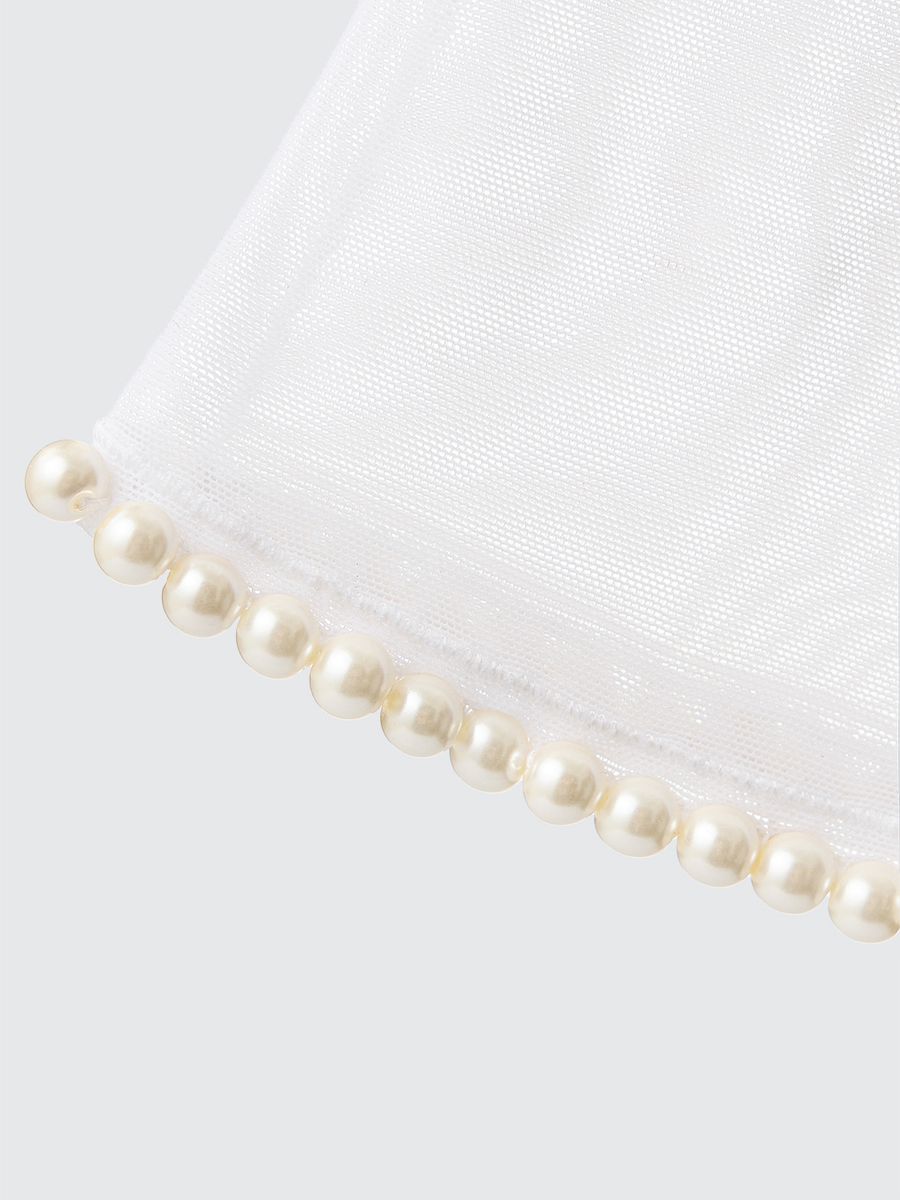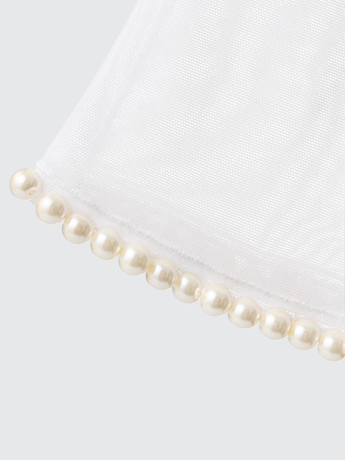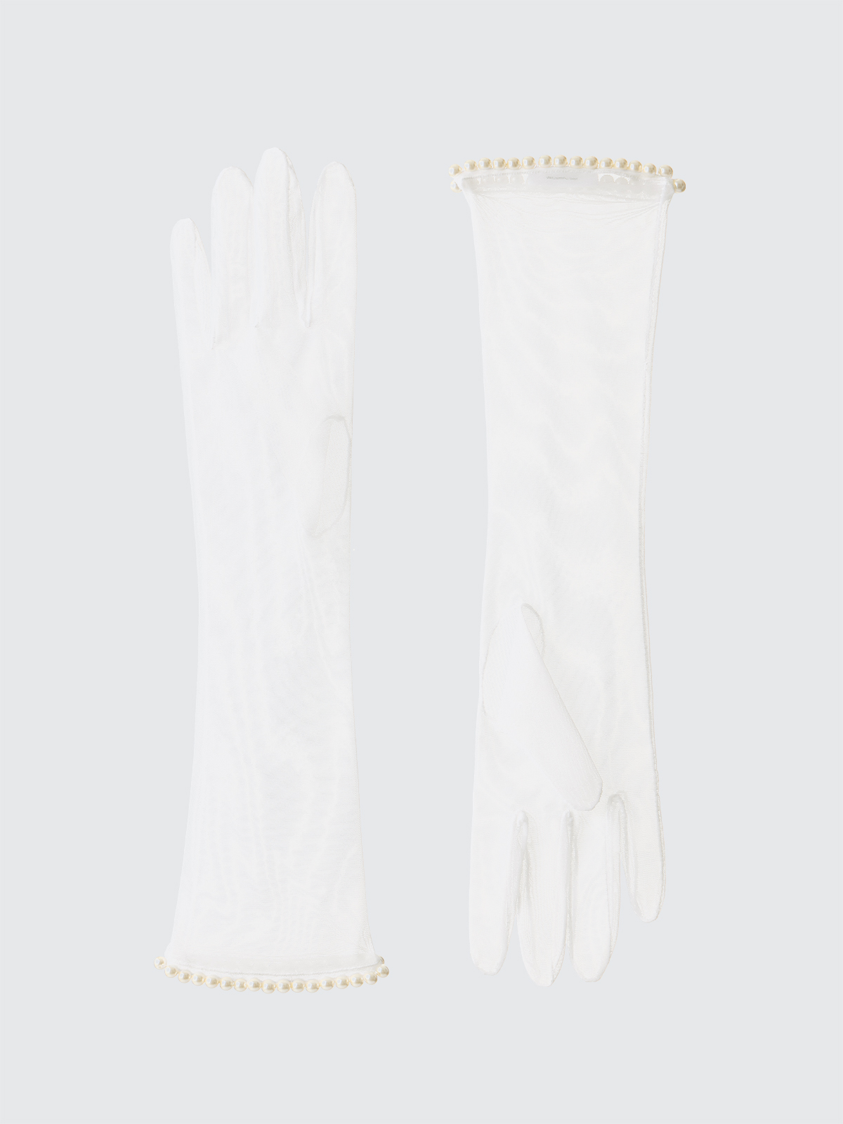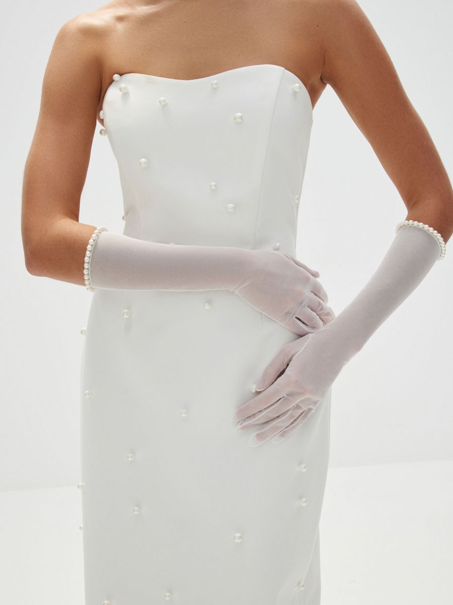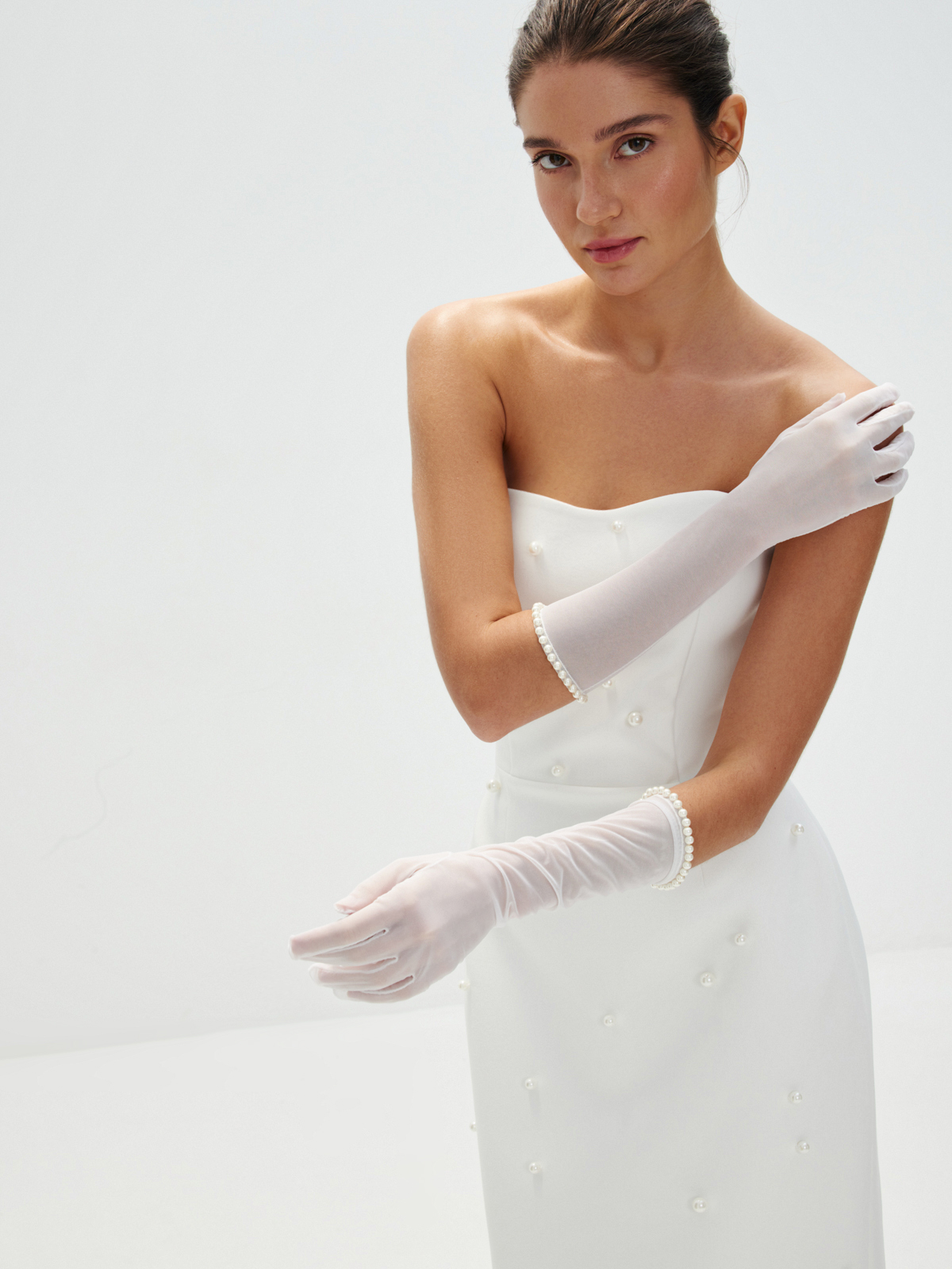 Удлиненные перчатки со стеклянным жемчугом «Безупречность» — изящная деталь, возвращающая в эпоху элегантности 50-х годов. Изделие, с которым ваш свадебный образ станет образцом утонченного стиля, выполнено вручную из невесомой сетки и расшито жемчугом. Создает безупречную комбинацию с платьем «Грейс» и любыми изделиями с изысканным характером.