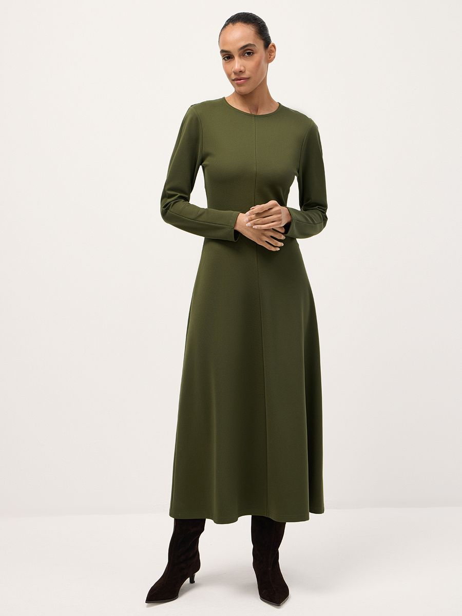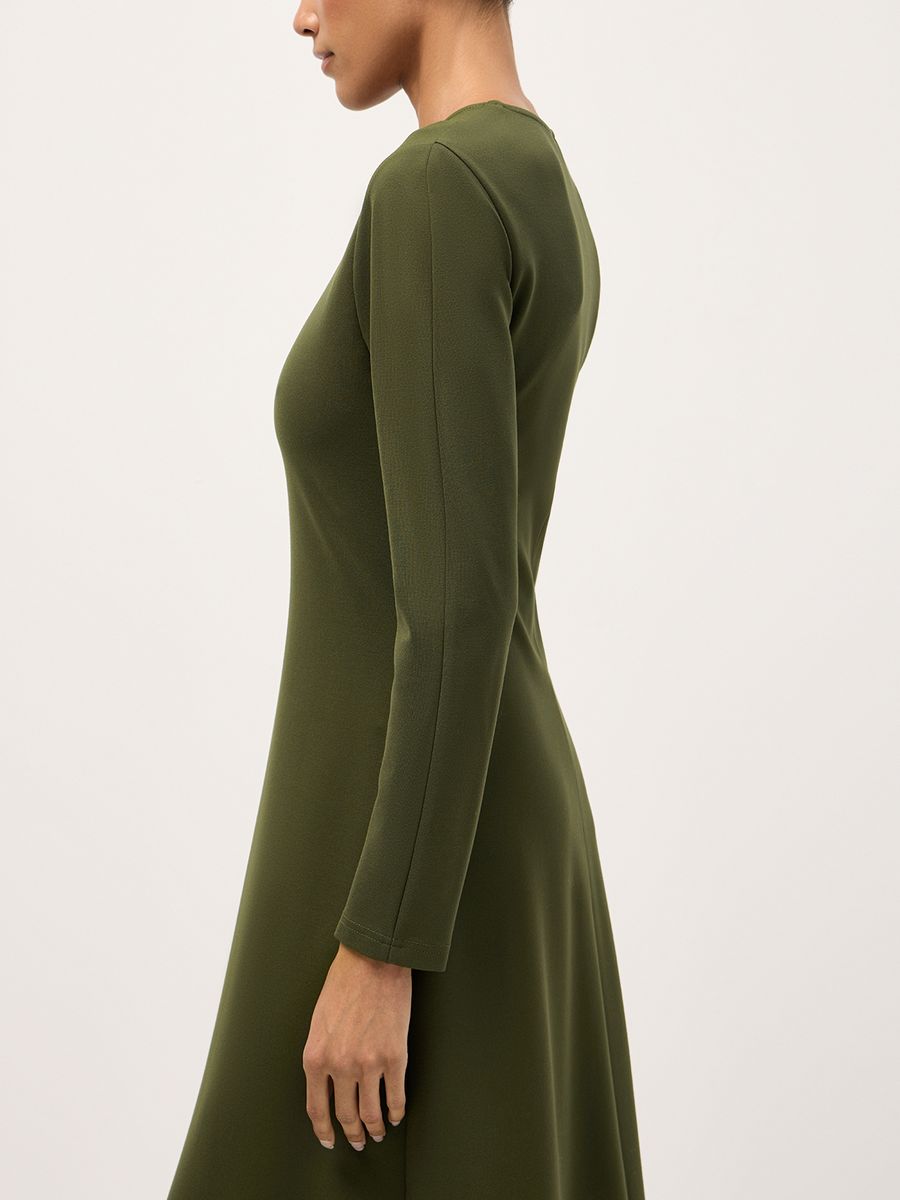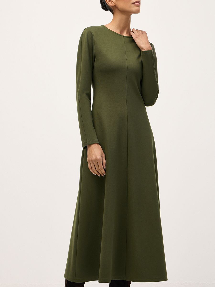 Платье из джерси Rich Olive — деликатная база для женственных осенних стилизаций. Гладкая эластичная ткань с добавлением вискозы нежно струится по фигуре и подчеркивает утонченный силуэт. Элегантная модель с длинными рукавами и расклешенной юбкой легко подстраивается под ваше настроение и планы: носите платье в качестве центрального элемента минималистичного образа или создавайте сложные стилизации с акцентными аксессуарами. Выбирайте комфорт каждый день, не отказываясь от изящных линий и эстетичных сочетаний.