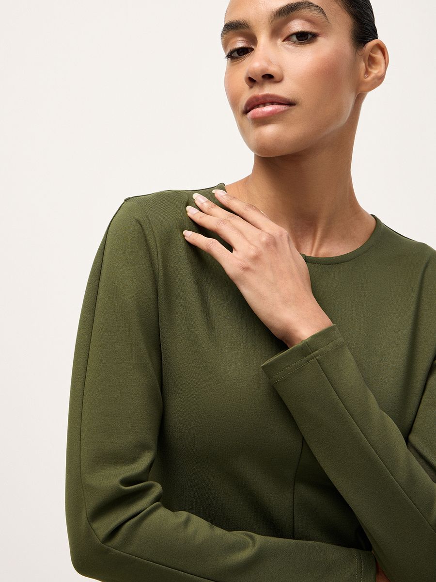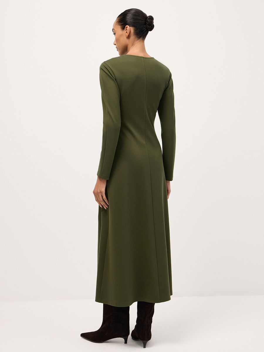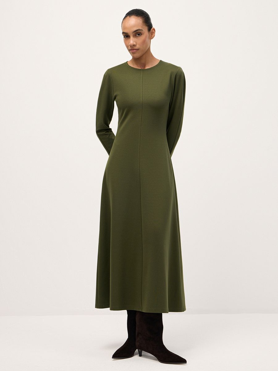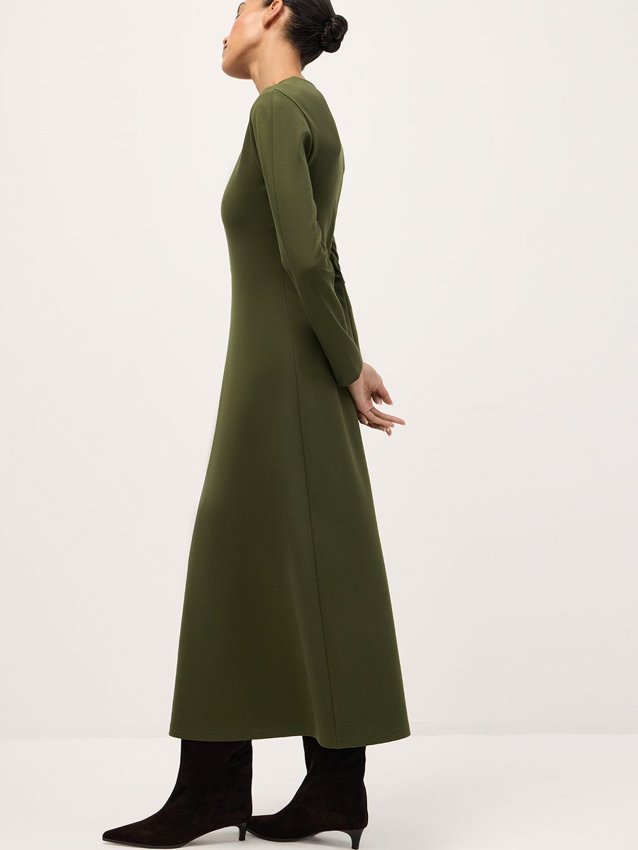 Платье из джерси Rich Olive — деликатная база для женственных осенних стилизаций. Гладкая эластичная ткань с добавлением вискозы нежно струится по фигуре и подчеркивает утонченный силуэт. Элегантная модель с длинными рукавами и расклешенной юбкой легко подстраивается под ваше настроение и планы: носите платье в качестве центрального элемента минималистичного образа или создавайте сложные стилизации с акцентными аксессуарами. Выбирайте комфорт каждый день, не отказываясь от изящных линий и эстетичных сочетаний.
