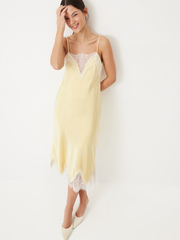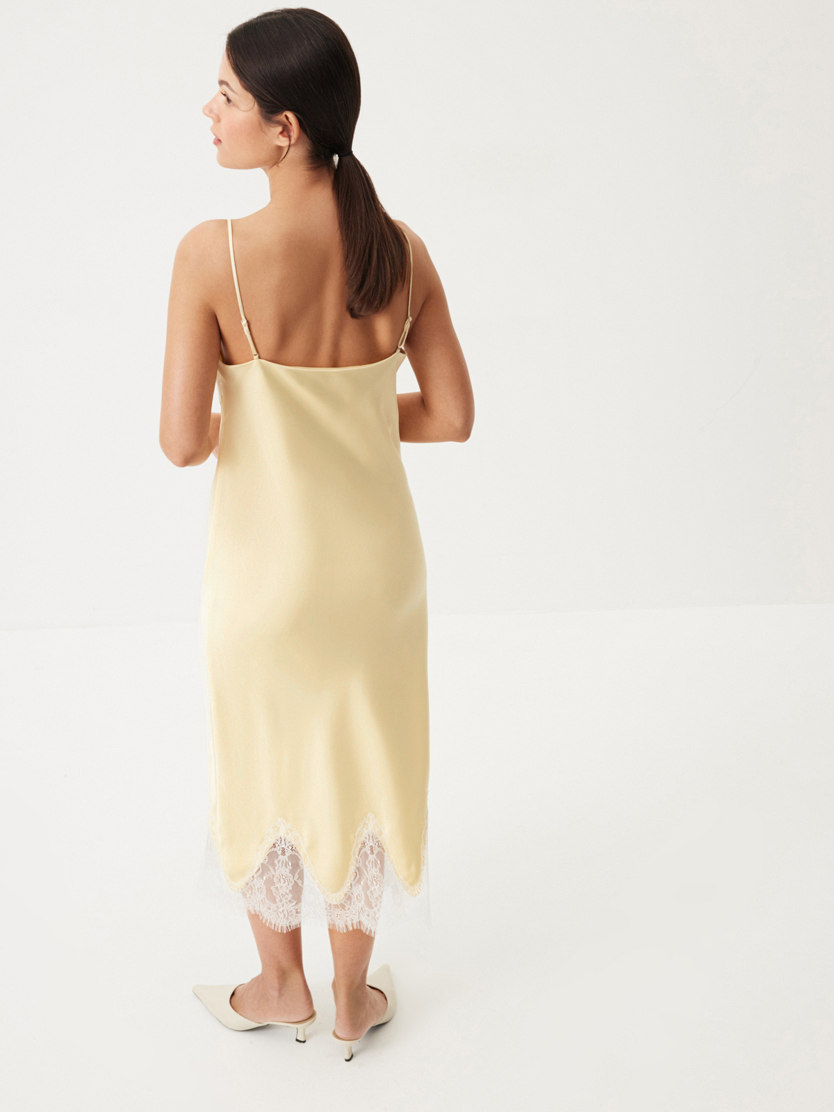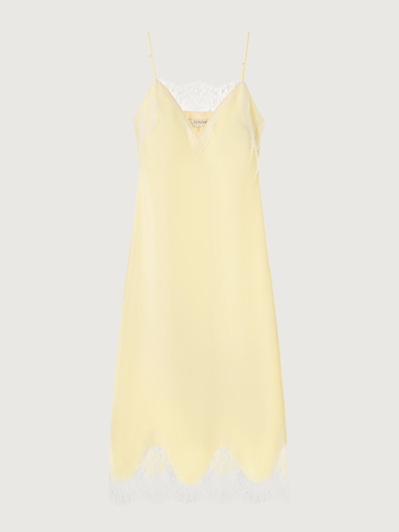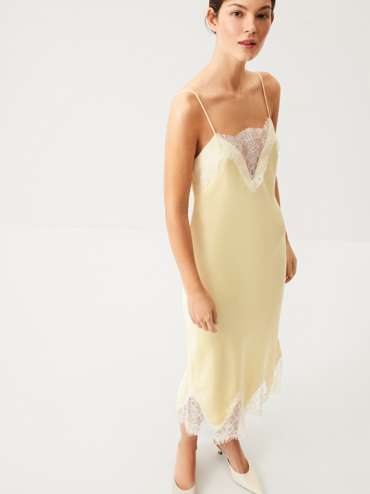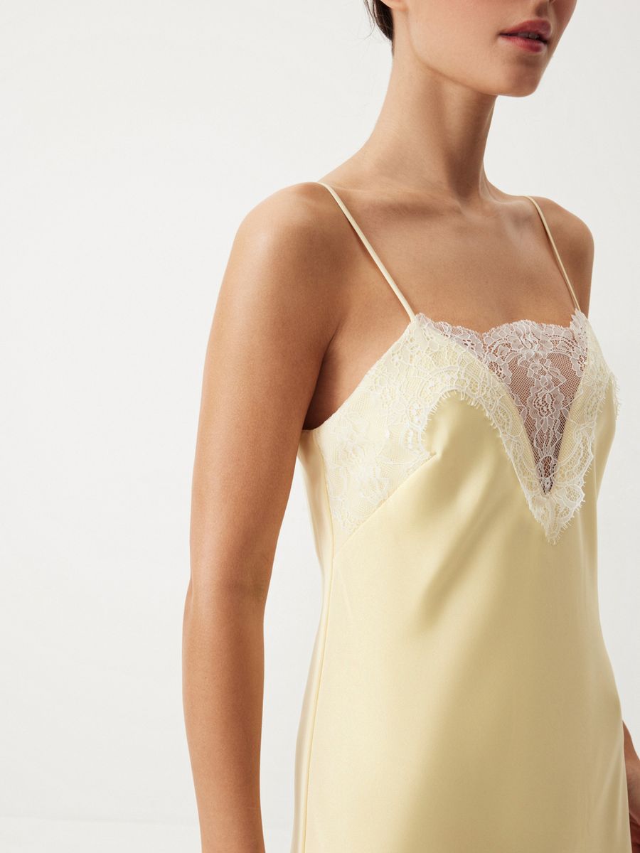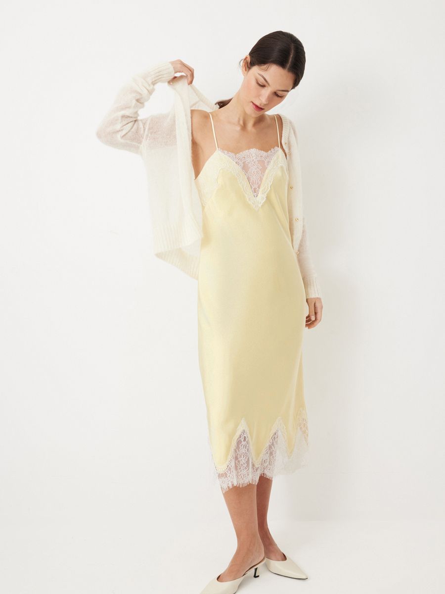 Изящное платье Sweet Meringue — словно отражение самой нежной и чувственной стороны женской натуры. Низ изделия выглядит полупрозрачным благодаря укороченной внутренней подкладке. Носим с минималистичными аксессуарами и обувью, оставляя воздушное кружево, освежающий оттенок сливочного масла и легкий сатиновый блеск в центре внимания. Дополняем романтичный характер модели легким кардиганом из шерсти альпака Wool Mix для вдохновляюще красивого образа.