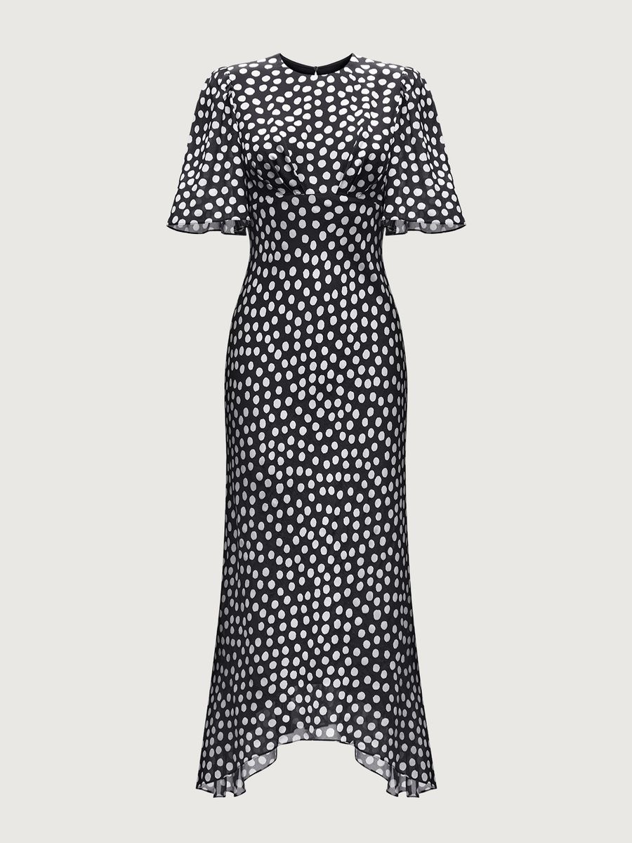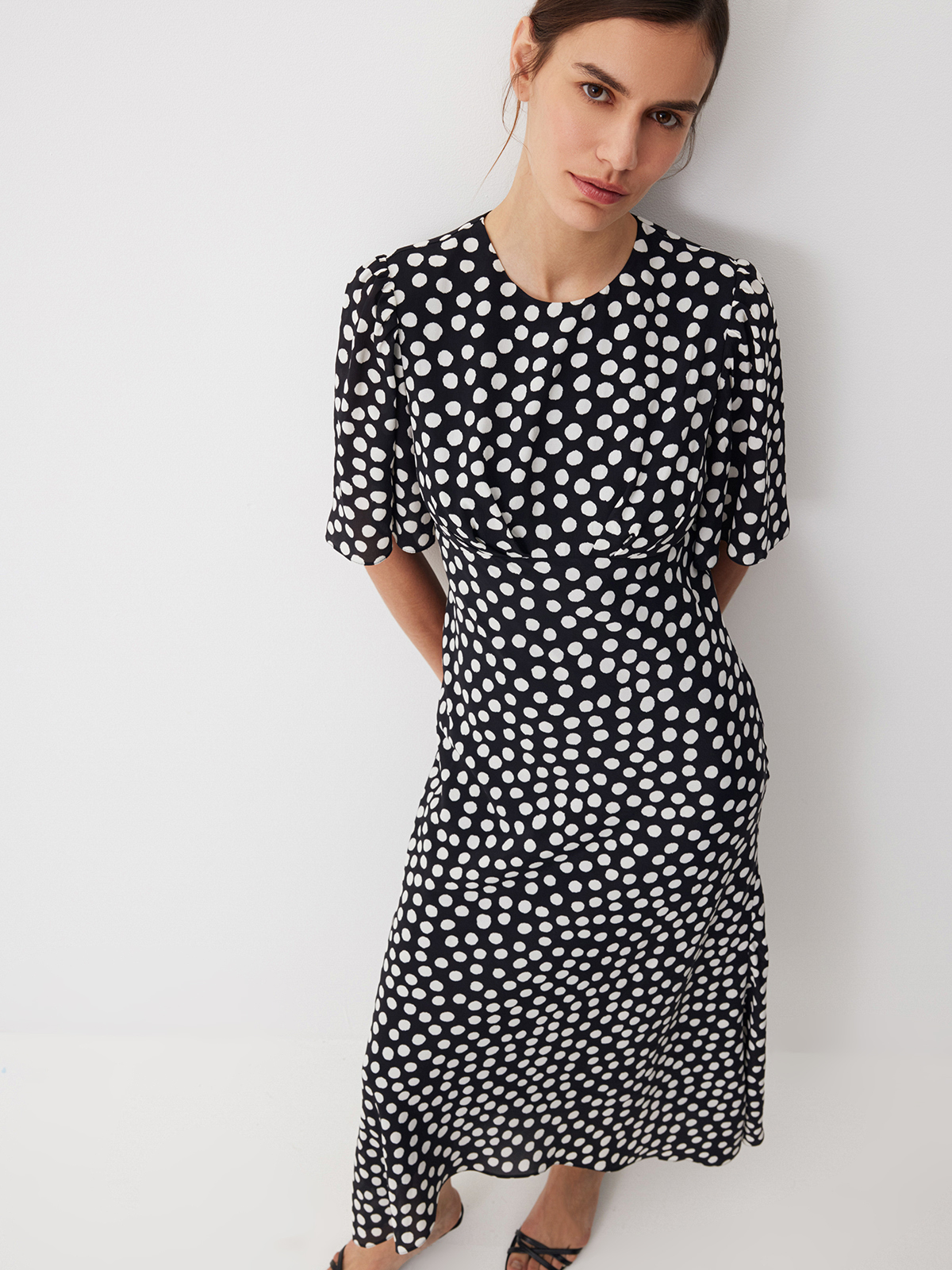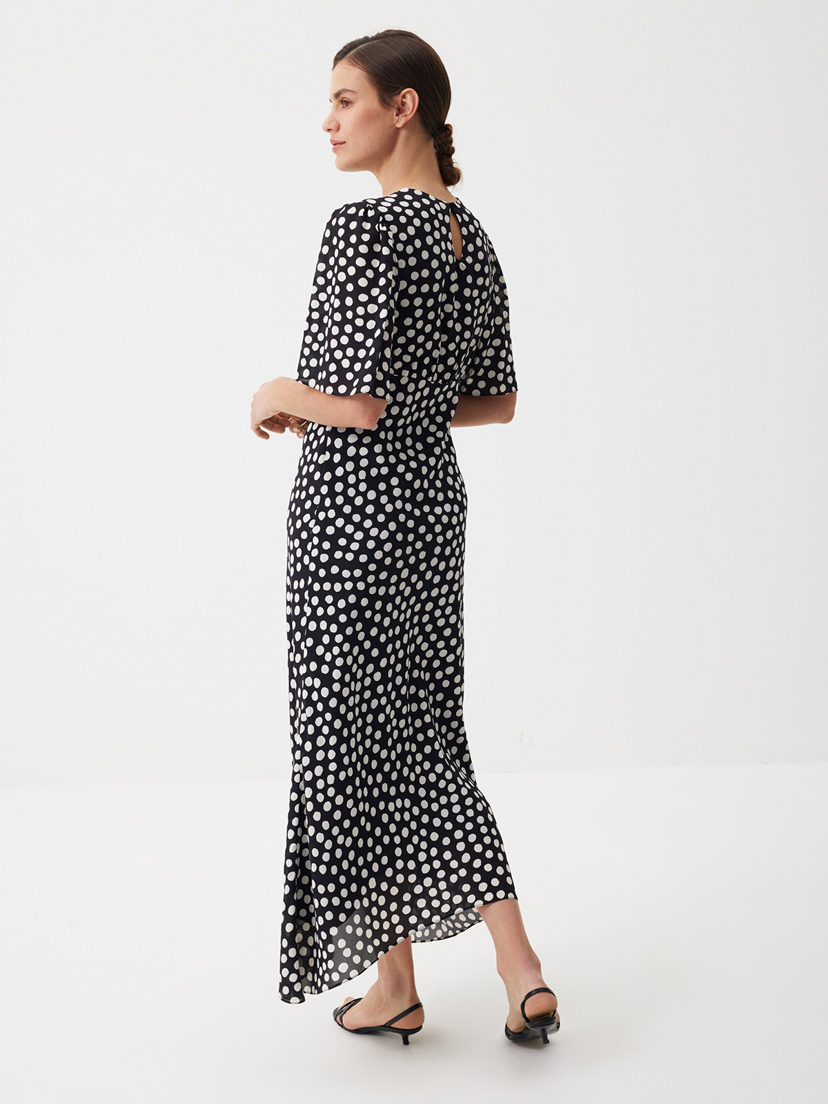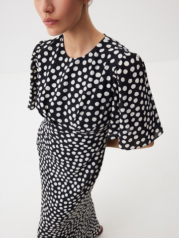 Летящее платье из нежной вискозы Dream Dots — изделие, с которым вам не потребуются дополнительные усилия, чтобы выглядеть уверенно и с ноткой шика. Эффектный крой с миди-длиной, расклешенной юбкой и струящимися рукавами делает образ выразительным и подчеркивает женственные изгибы фигуры, а принт в горох добавляет классической винтажной эстетики. Идеально для моментов, когда дню хочется добавить немного роскоши или художественной искры — достаточно этого платья и вашей персоны.