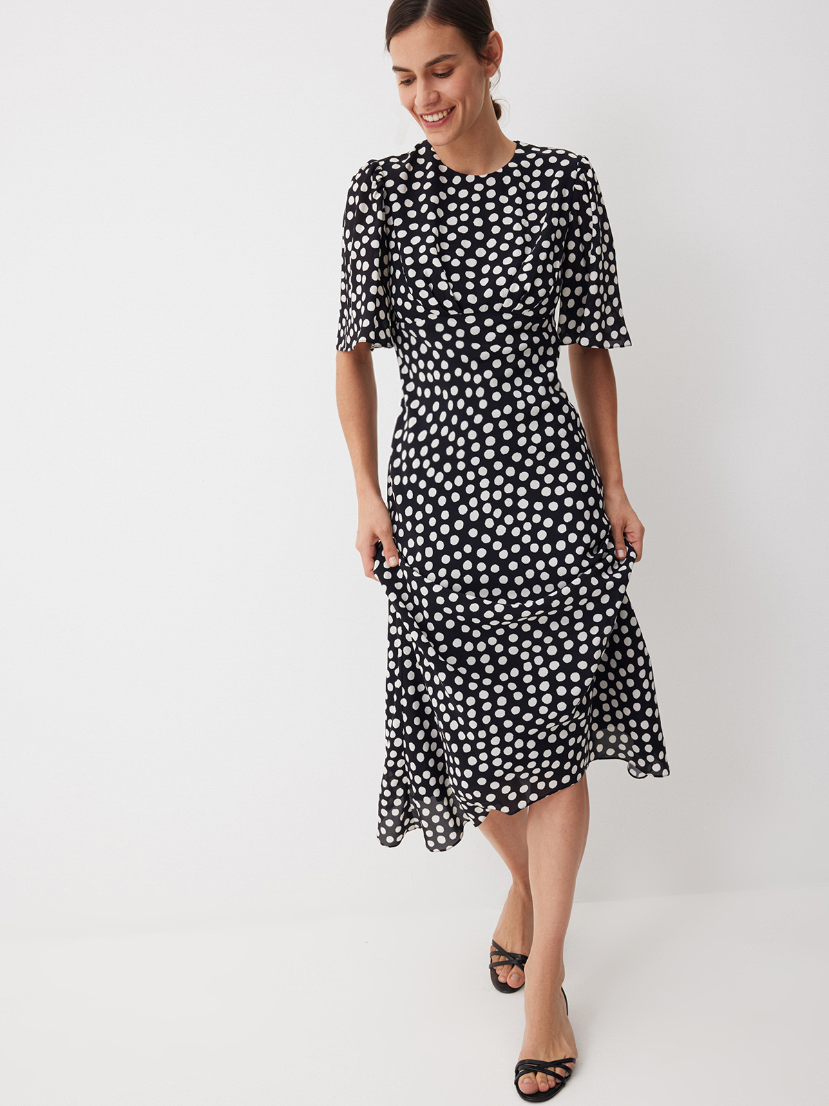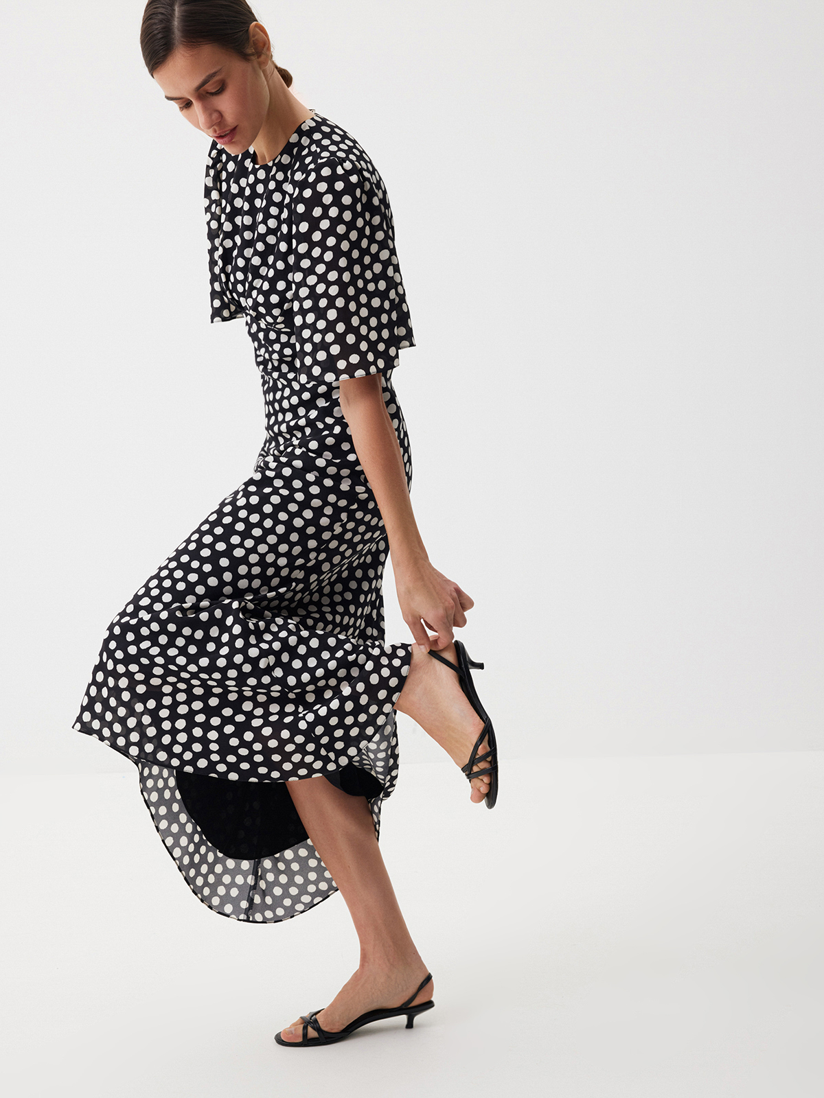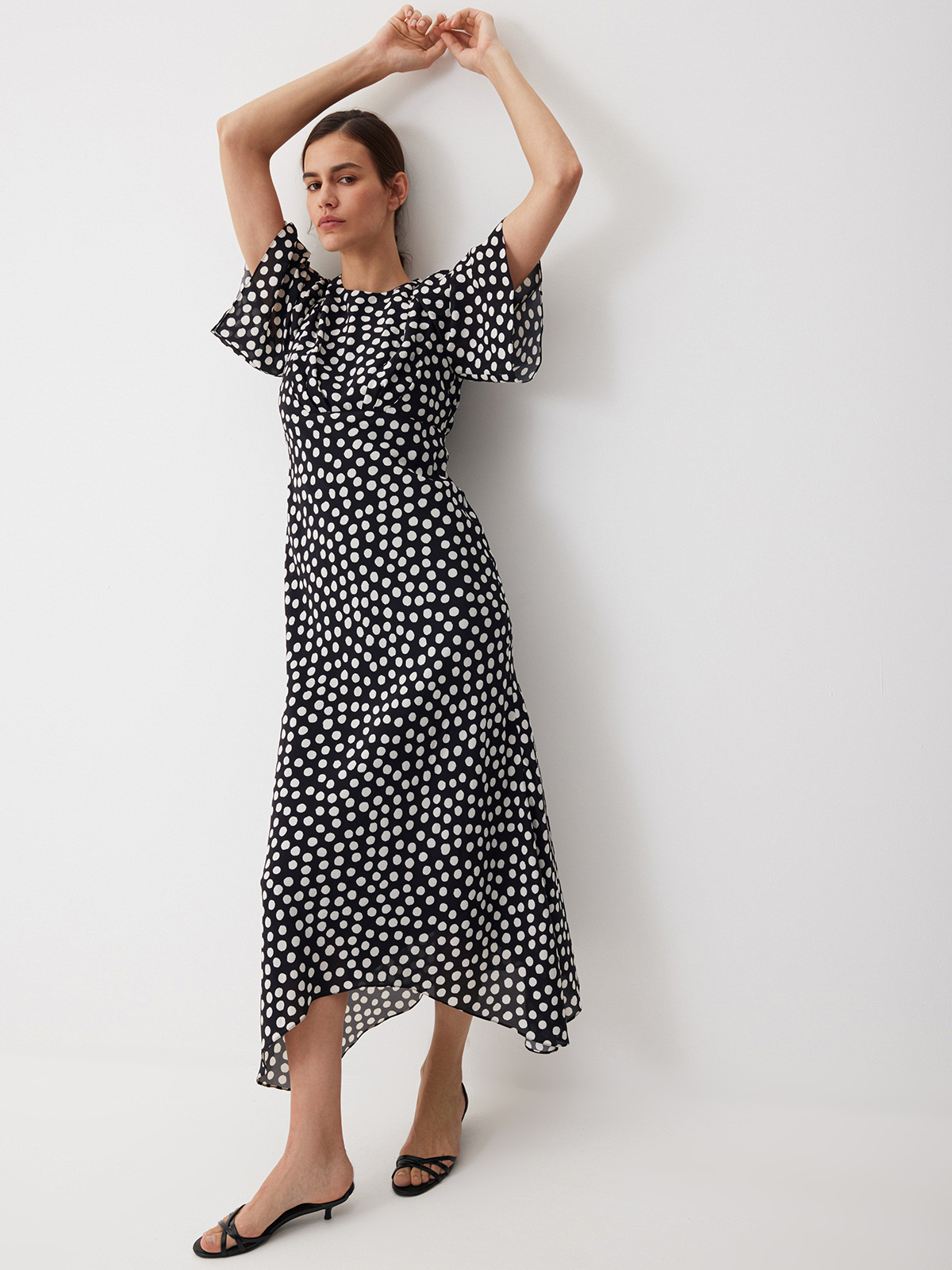 Летящее платье из нежной вискозы Dream Dots — изделие, с которым вам не потребуются дополнительные усилия, чтобы выглядеть уверенно и с ноткой шика. Эффектный крой с миди-длиной, расклешенной юбкой и струящимися рукавами делает образ выразительным и подчеркивает женственные изгибы фигуры, а принт в горох добавляет классической винтажной эстетики. Идеально для моментов, когда дню хочется добавить немного роскоши или художественной искры — достаточно этого платья и вашей персоны.