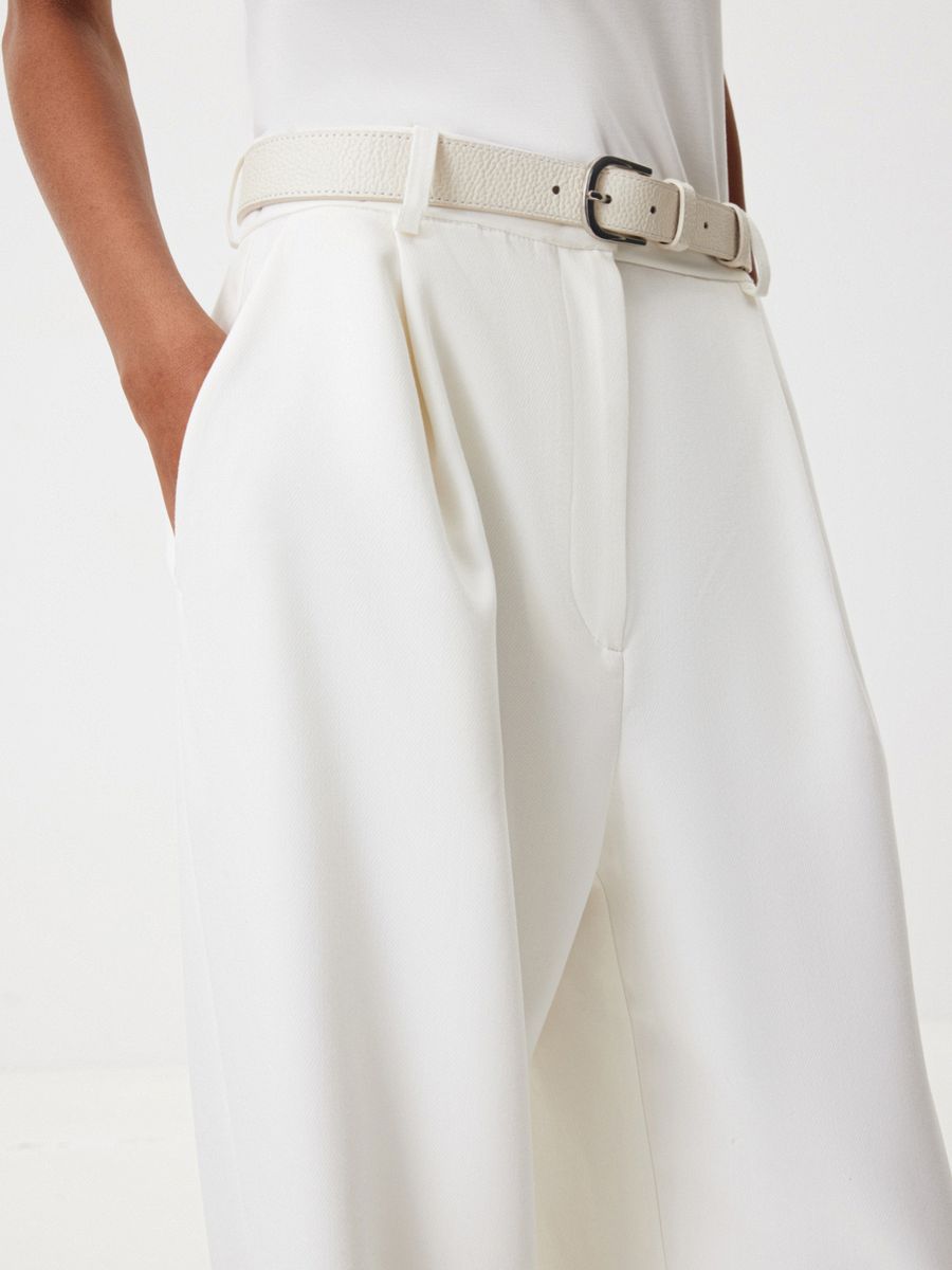 Прямой силуэт. Высокая посадка с защипами. На поясе со шлевками для ремня. Застежка на молнию, потайную пуговицу и крючки.