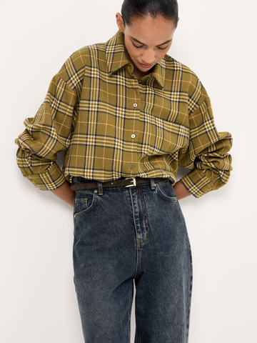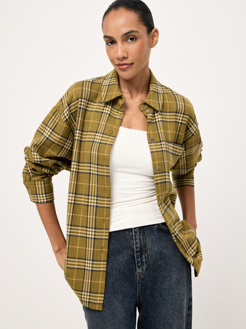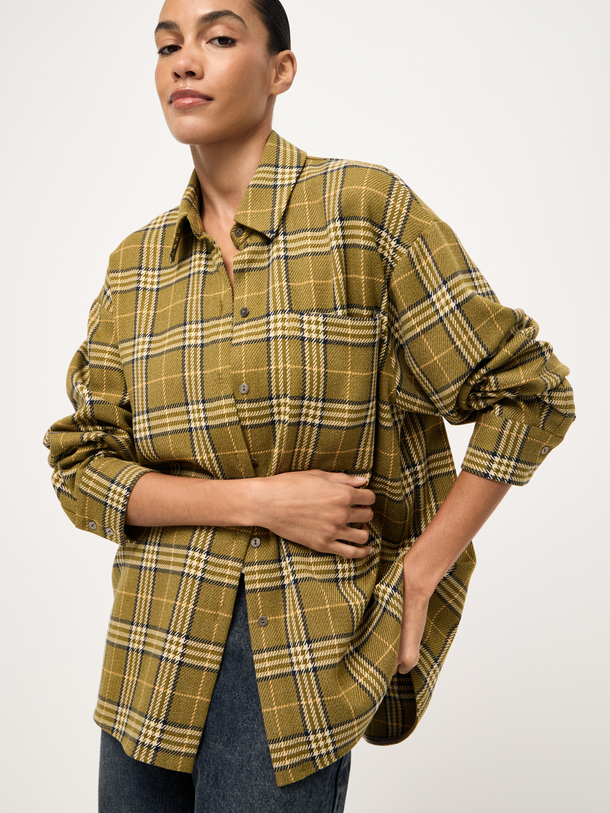 Один из тех айтемов, без которых невозможно представить осенний сезон — уютная рубашка в клетку olive tartan. Модель свободного силуэта с лаконичными металлическими пуговицами создана из мягкой структурной ткани. Многогранное изделие безупречно выглядит соло, но раскрывается в полной мере через многослойные стилизации: с облегающей футболкой base, топом на тонких бретелях или деликатной водолазкой с шерстью. Для непринужденных casual аутфитов выбираем классические джинсы straight или создаем выразительное фактурное сочетание с брюками или юбкой из вельвета.