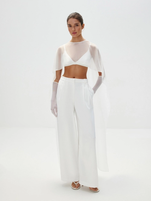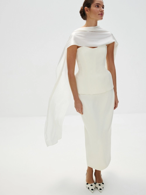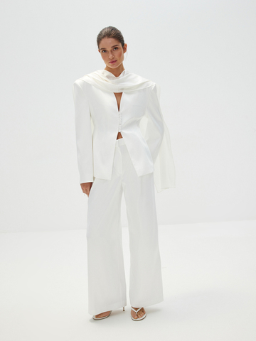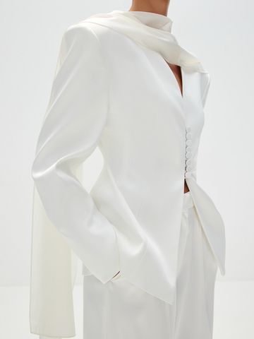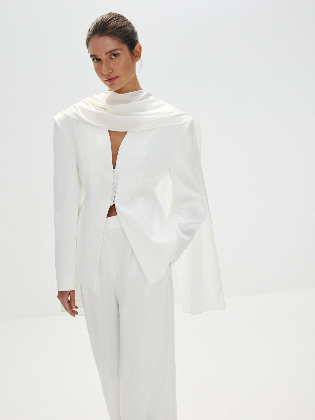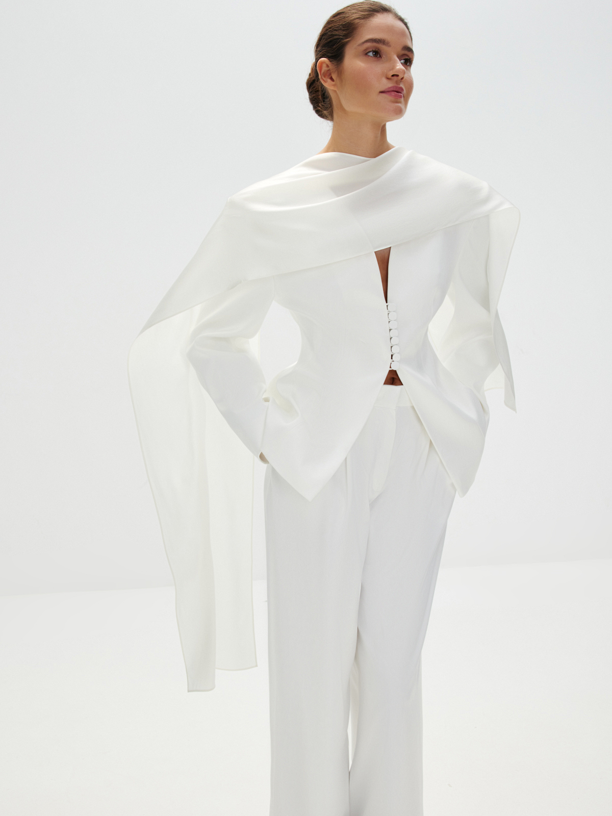Воздушный шарф «Сон наяву» — безукоризненно стильный аксессуар для свадебного сезона. Выбираем невесомую модель из натурального шелка, чтобы добавить образу изысканный акцент с налетом театральности и роскоши. Изделие может быть как альтернативой классической фате, так и изящной деталью образа на фотосессию или роспись. В день торжества носим в паре с жакетом «Красота момента» или корсетом «Дива», а после — добавляем в повседневный гардероб для утонченных стилизаций.