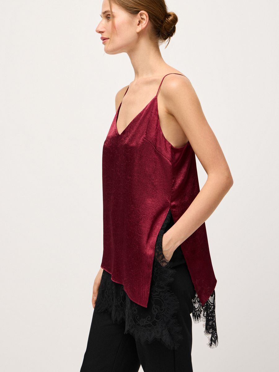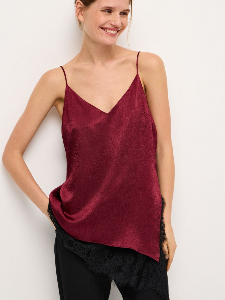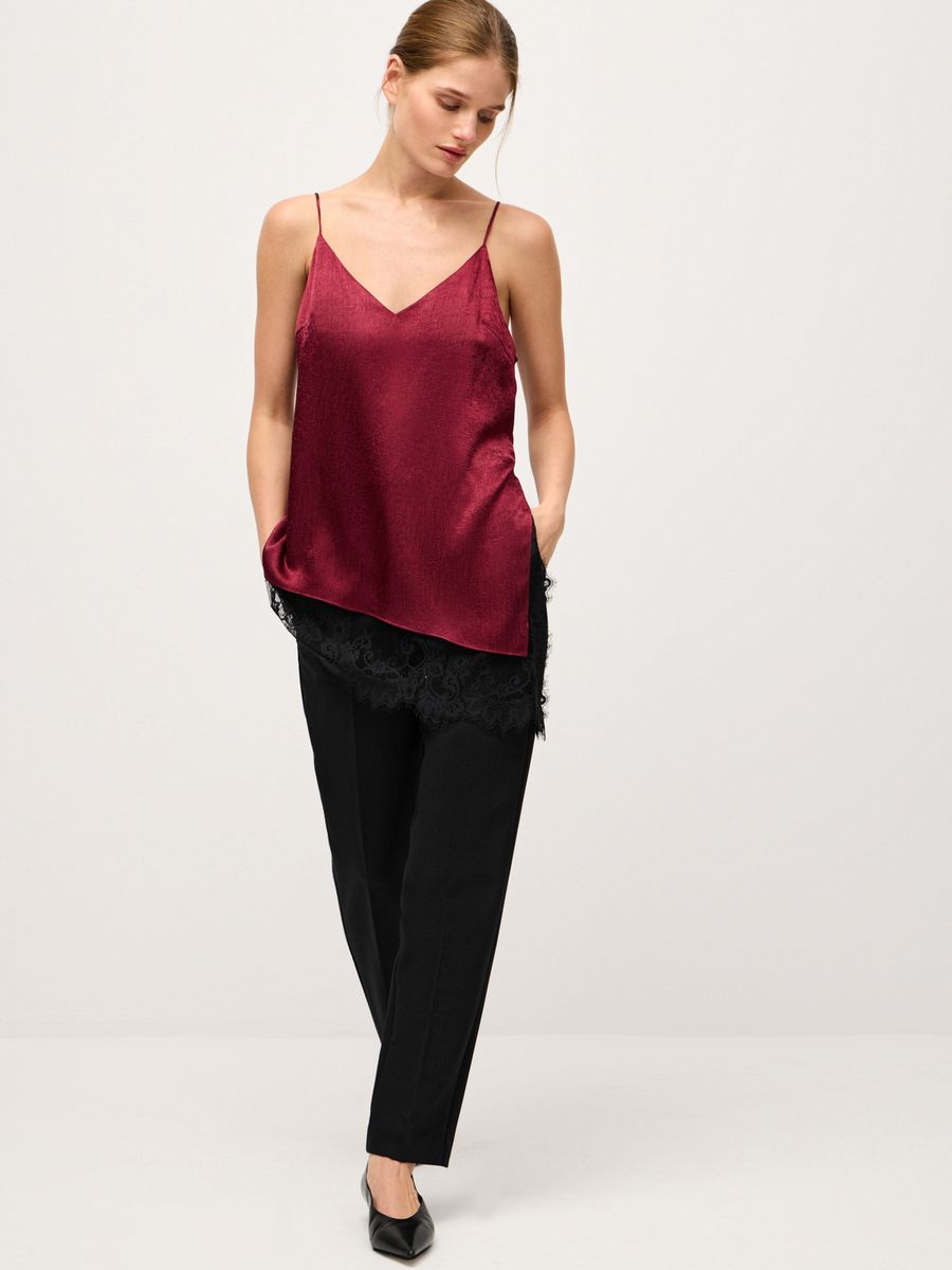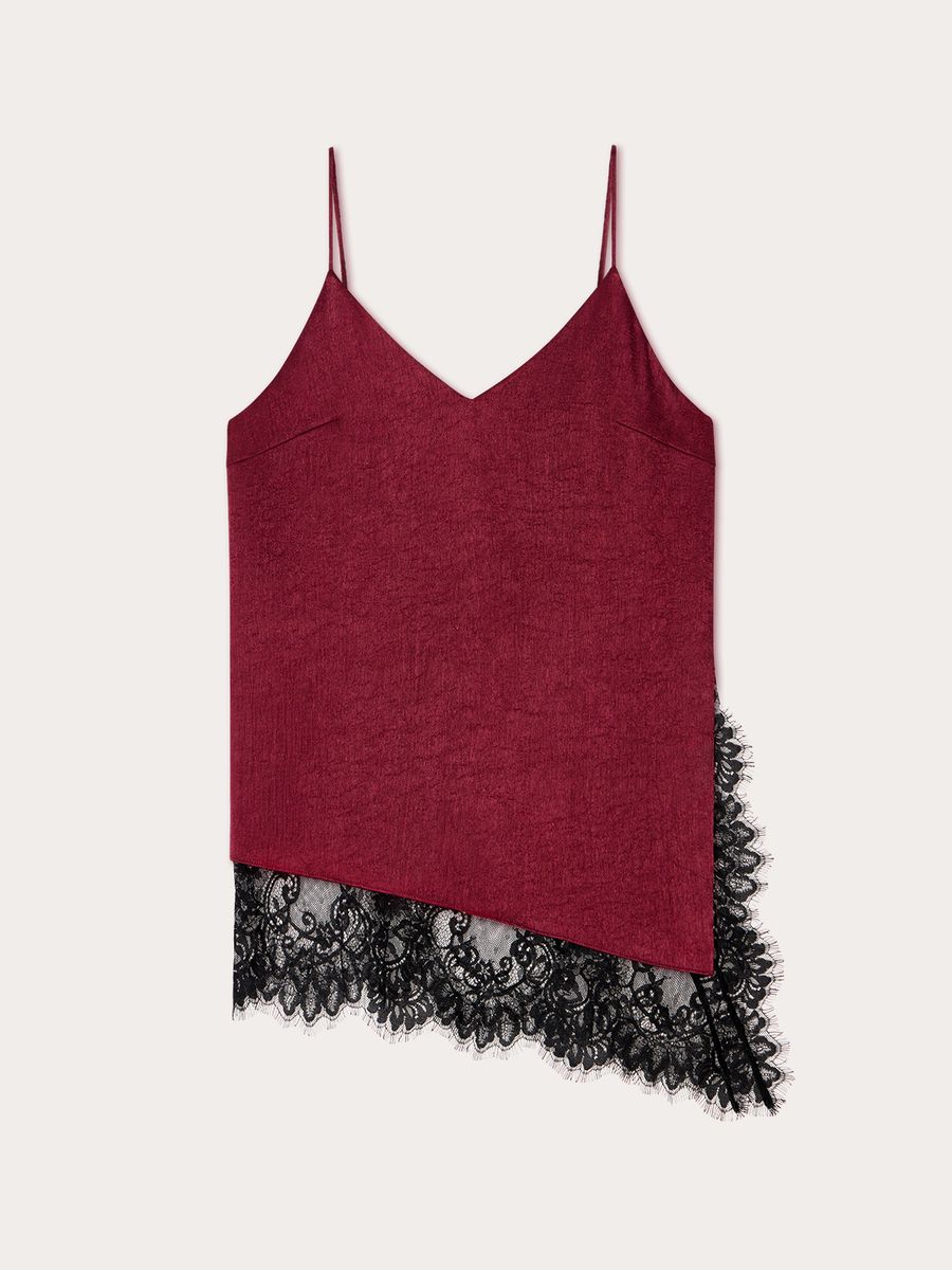 Изысканный топ в бельевом стиле Lovely Lace — айтем, наполняющий любую стилизацию женственной чувственностью и утонченностью. Ассиметричный крой с глубоким боковым разрезом, роскошное кружево и выразительный бордовый оттенок придают каждому выходу нотку extra. Модель из легкой ткани с изысканной фактурой идеальна для любого гардероба, случая и настроения. В офис или на воскресный бранч носим топ с классическими palazzo, а для вечернего коктейля или торжественного мероприятия — с юбкой-миди Lovely Lace. Используем модель в качестве деликатной детали, добавляя первым слоем под объемный джемпер Merino Essential.