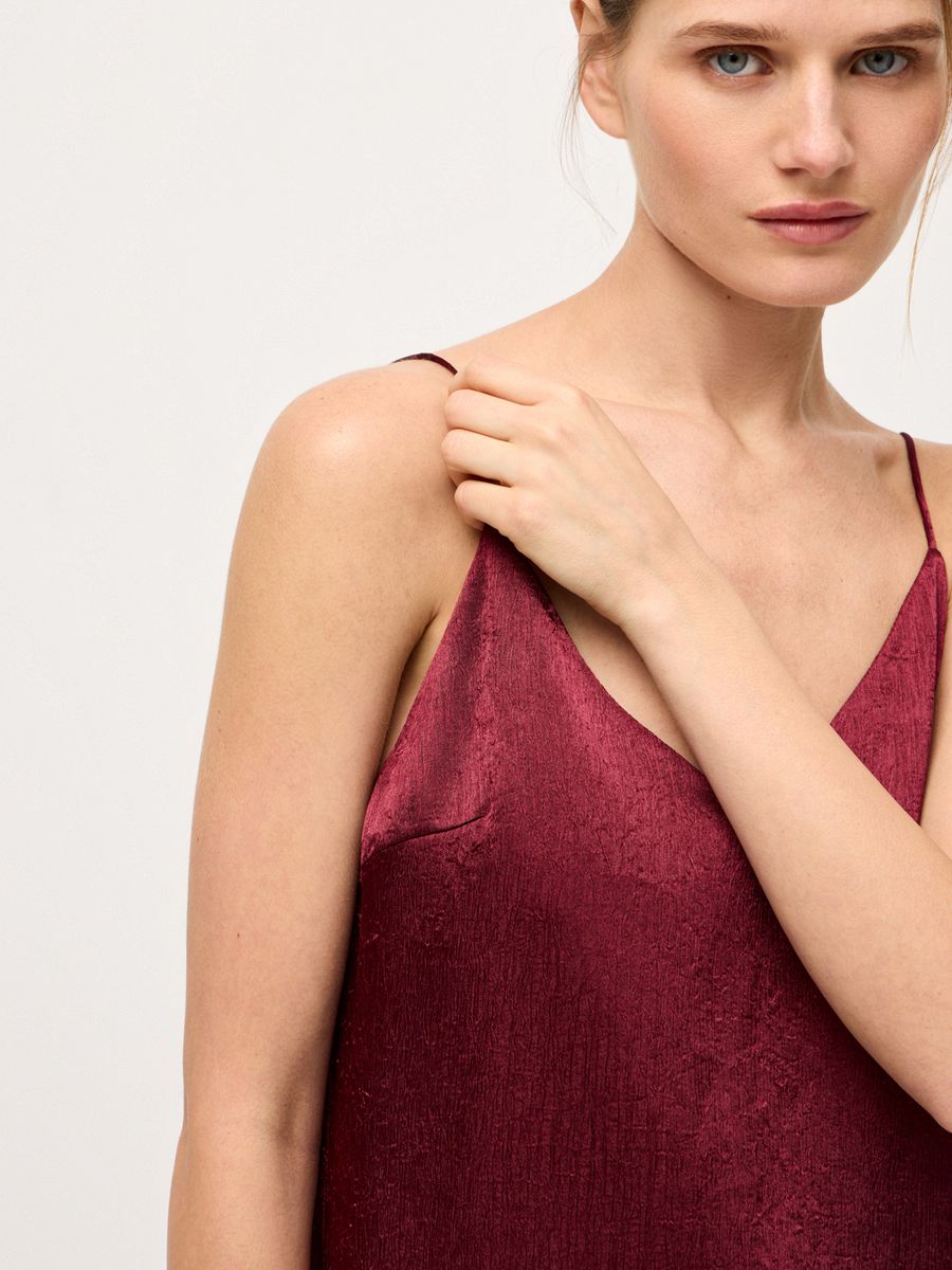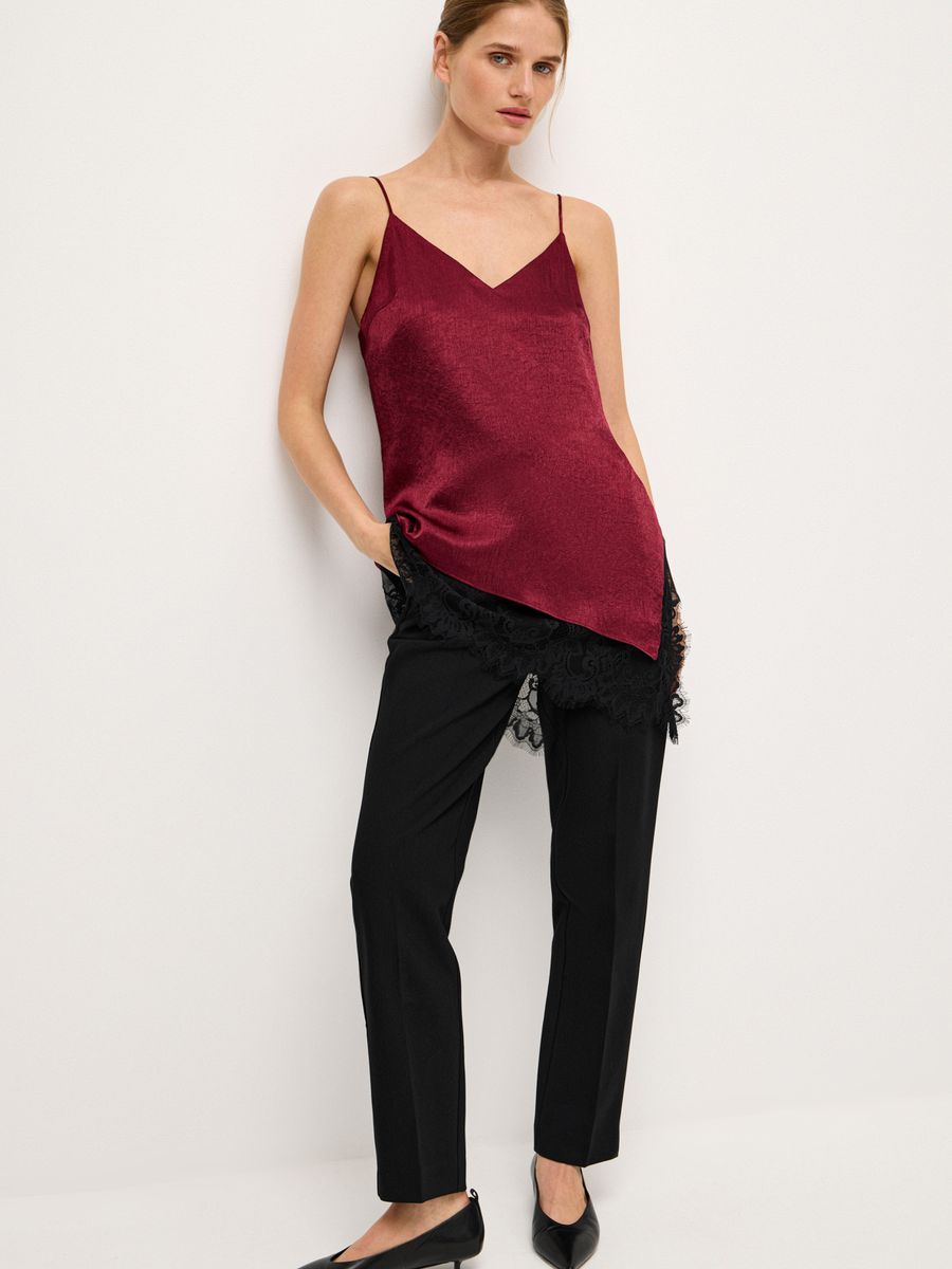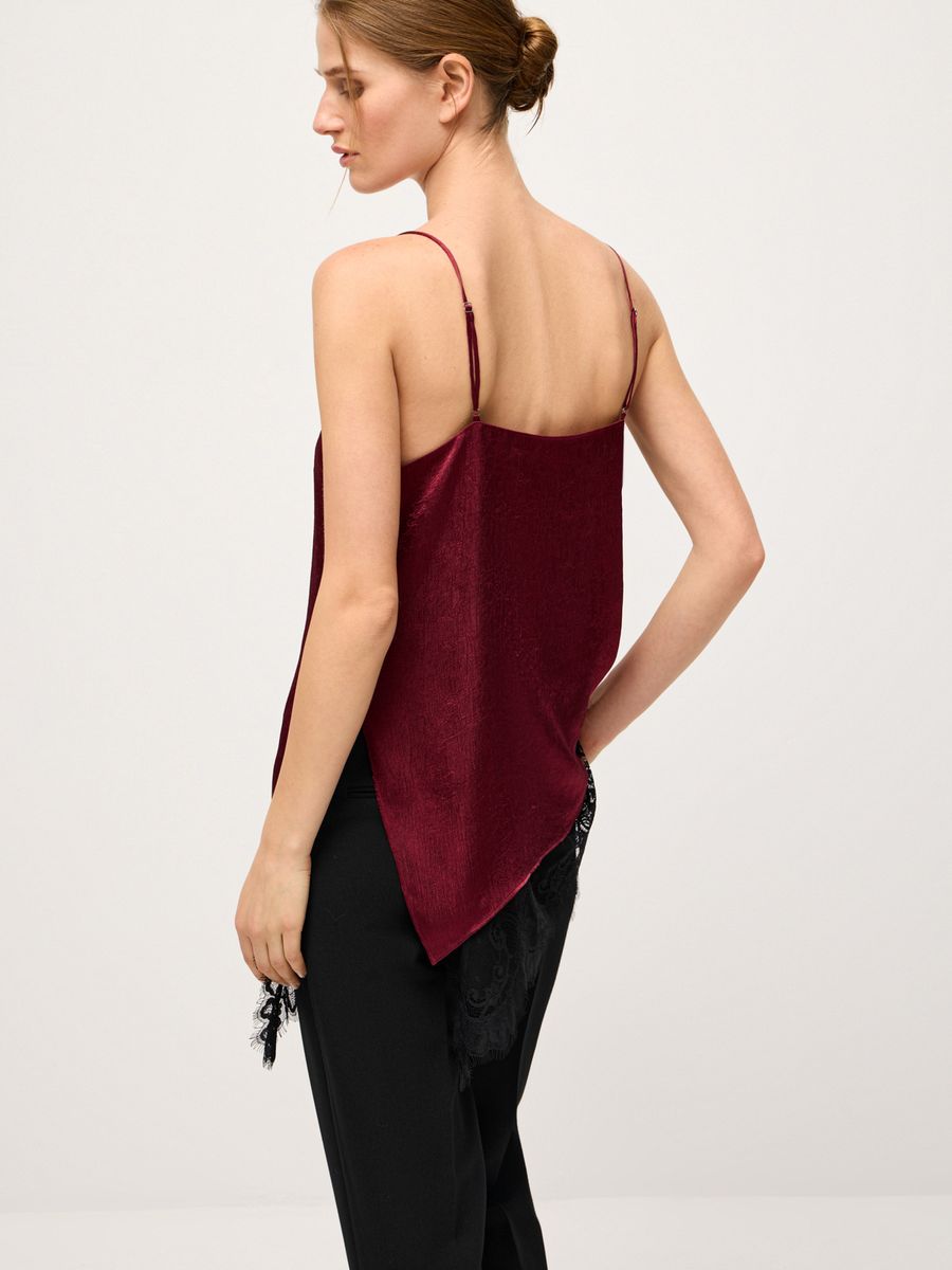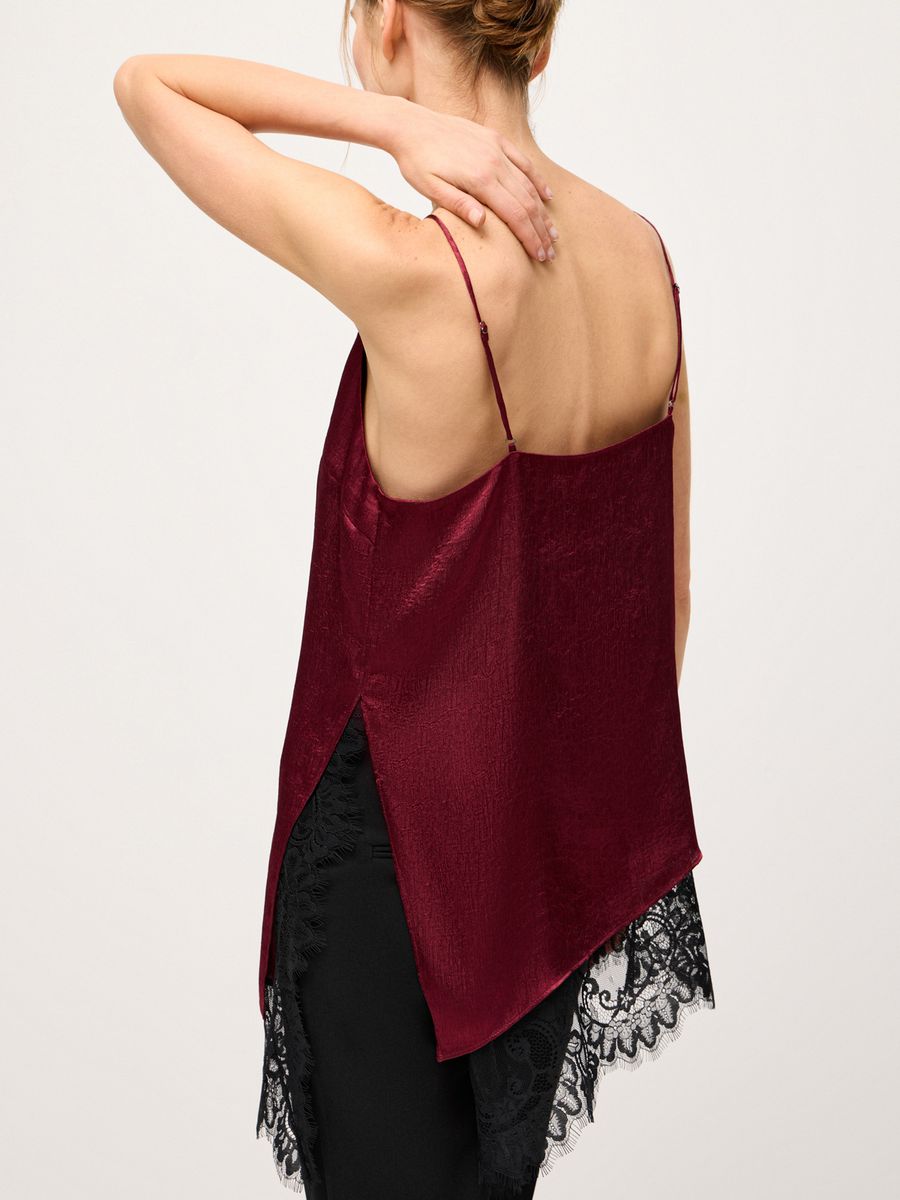 Изысканный топ в бельевом стиле Lovely Lace — айтем, наполняющий любую стилизацию женственной чувственностью и утонченностью. Ассиметричный крой с глубоким боковым разрезом, роскошное кружево и выразительный бордовый оттенок придают каждому выходу нотку extra. Модель из легкой ткани с изысканной фактурой идеальна для любого гардероба, случая и настроения. В офис или на воскресный бранч носим топ с классическими palazzo, а для вечернего коктейля или торжественного мероприятия — с юбкой-миди Lovely Lace. Используем модель в качестве деликатной детали, добавляя первым слоем под объемный джемпер Merino Essential.