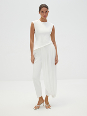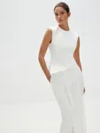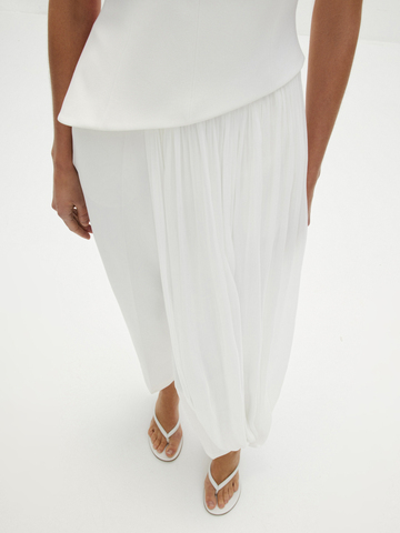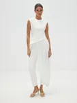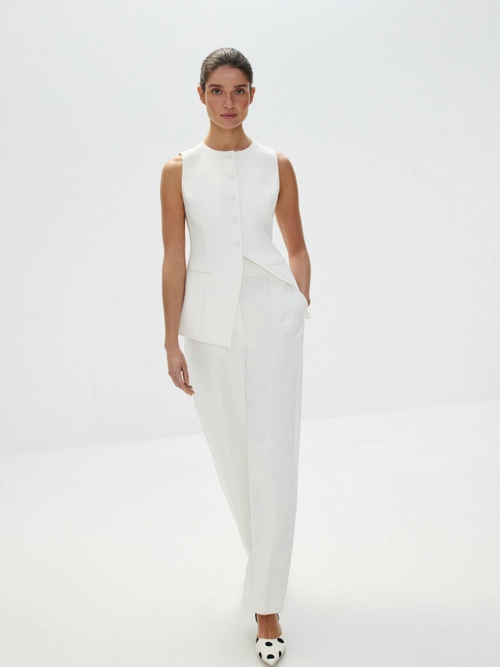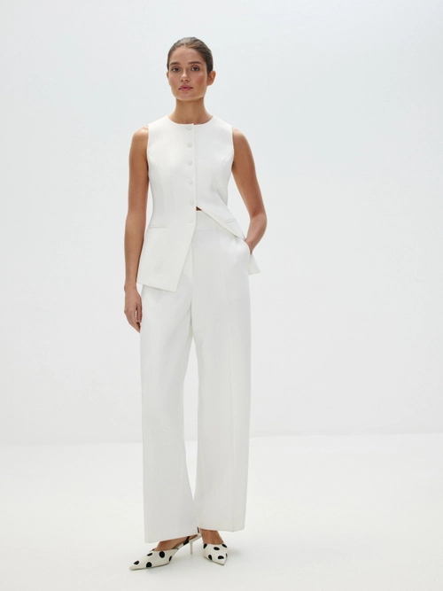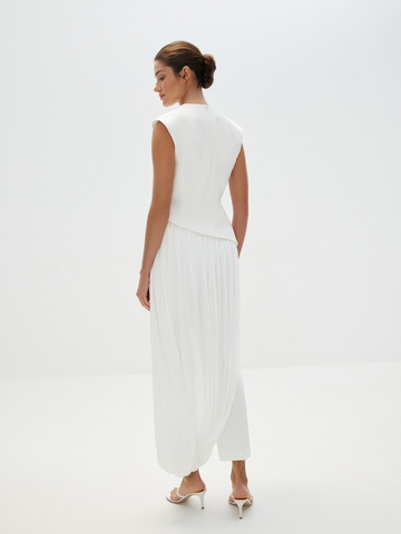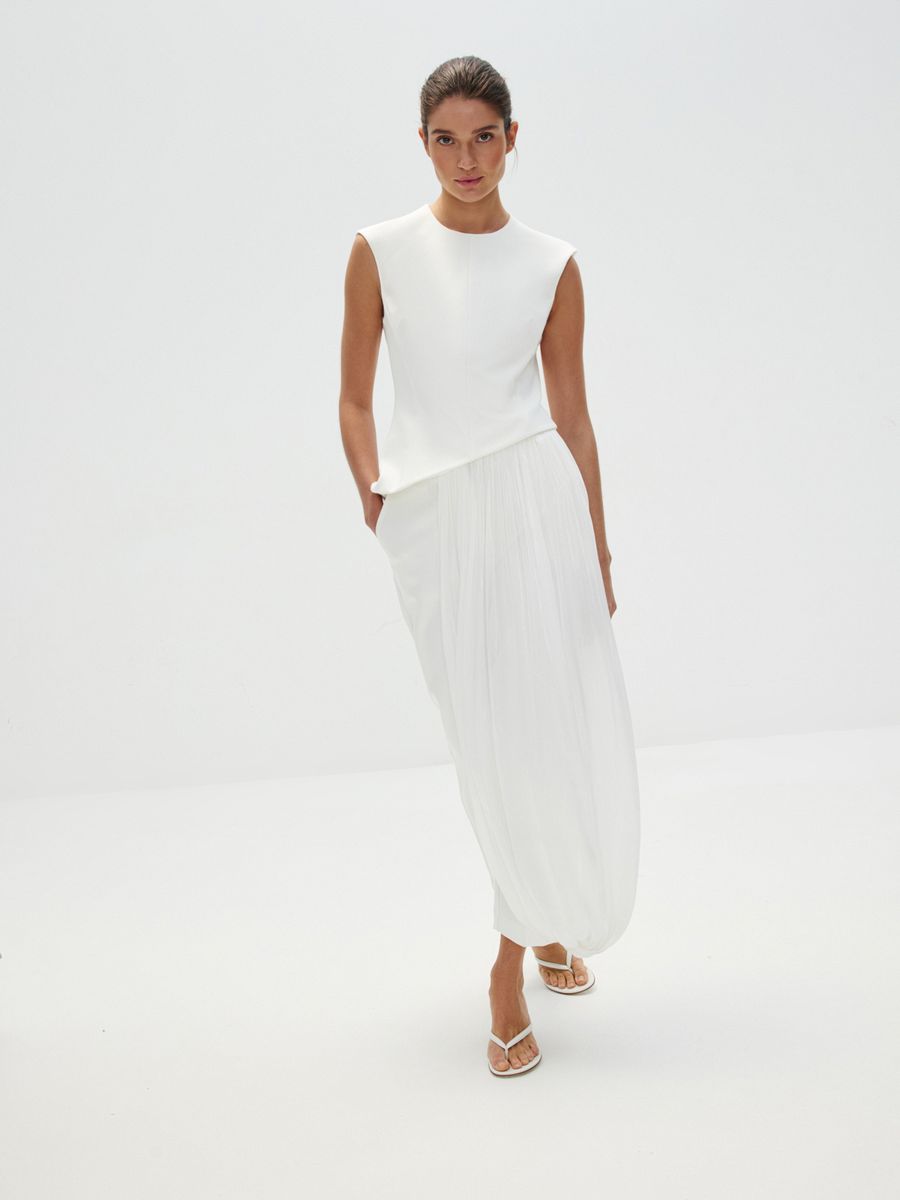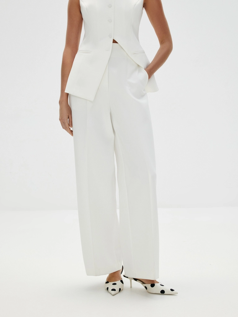 Топ «Великая красота» — искусное сочетание современности и классики. Асимметричный скульптурный крой с акцентом на талии и летящий шлейф добавят вашему торжественному образу налет завораживающей античной красоты. Идеален в сете с лаконичными брюками «Молочное парфе», который будет актуален не только для свадебного образа, но и любых особенных событий в весенне-летнем сезоне.
